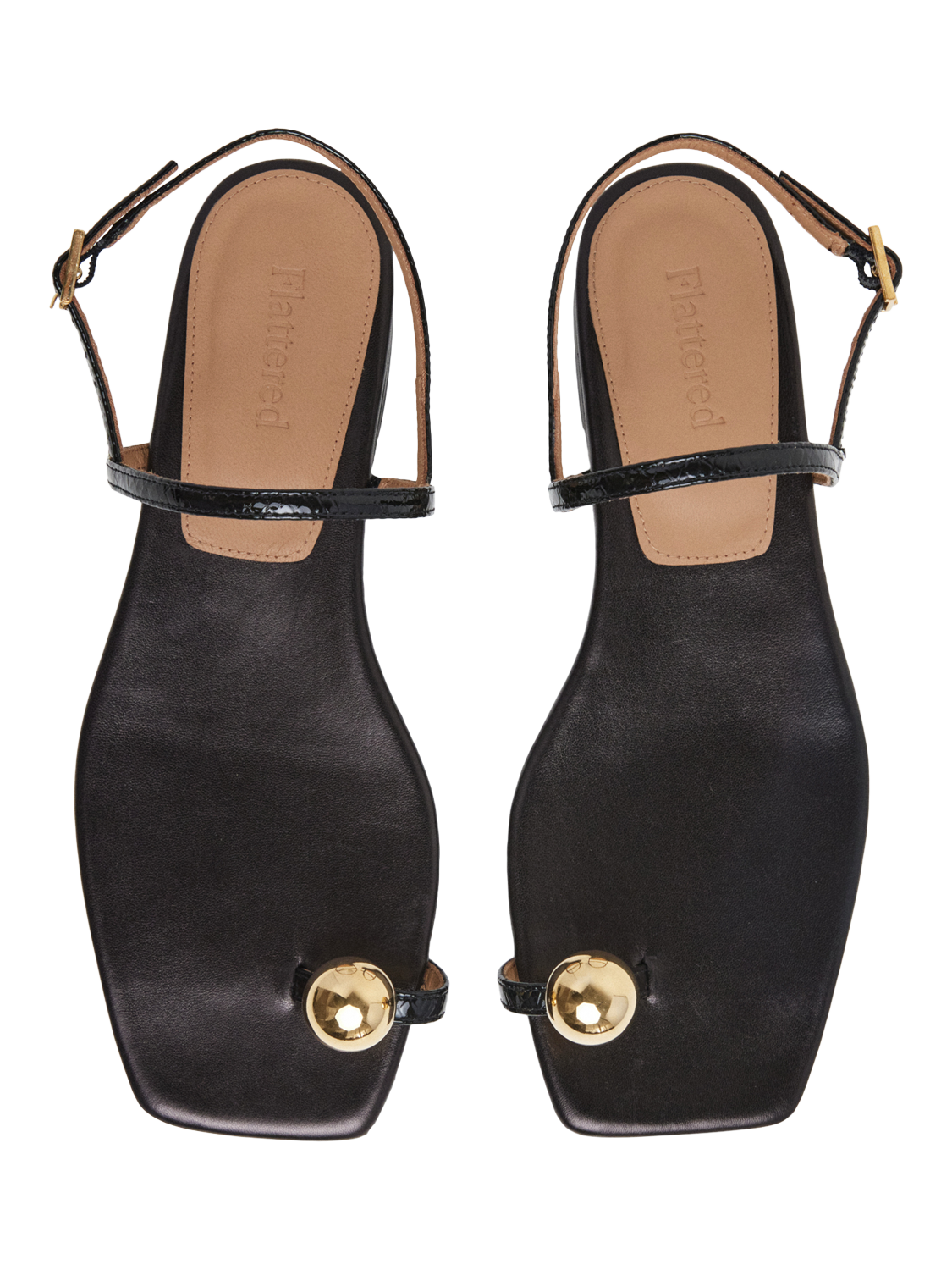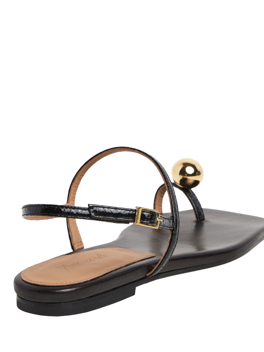 Idris is a minimalist flat sandal with delicate straps that exude understated elegance. The toe strap is adorned with a decorative metalised pearl, whilst the supple upper leather features a glossy surface with a subtle snake-embossed pattern. An adjustable metal buckle closure on the ankle strap allows for a customised and secure fit.