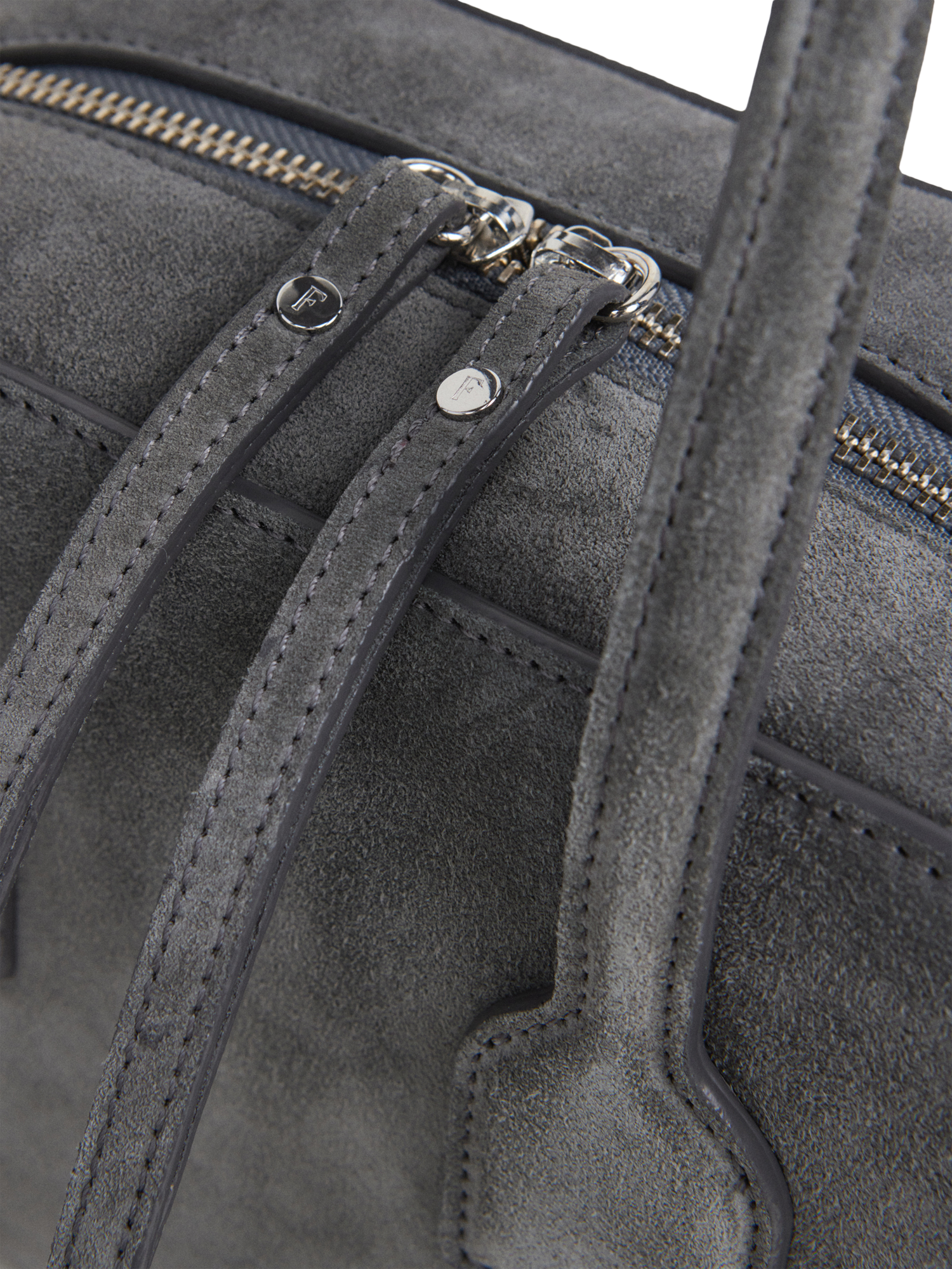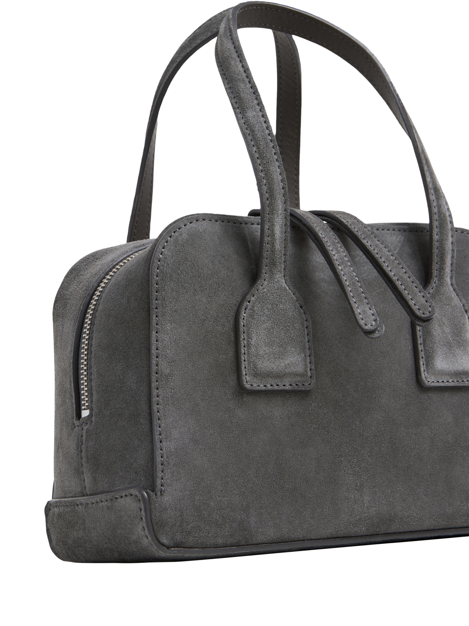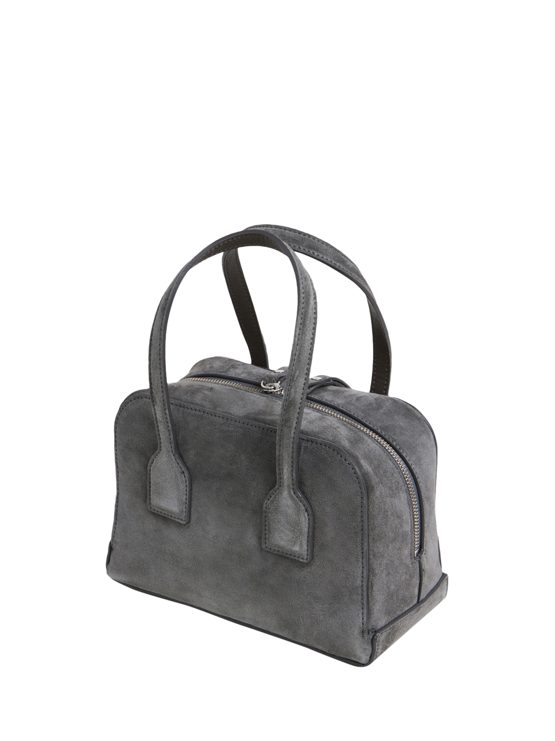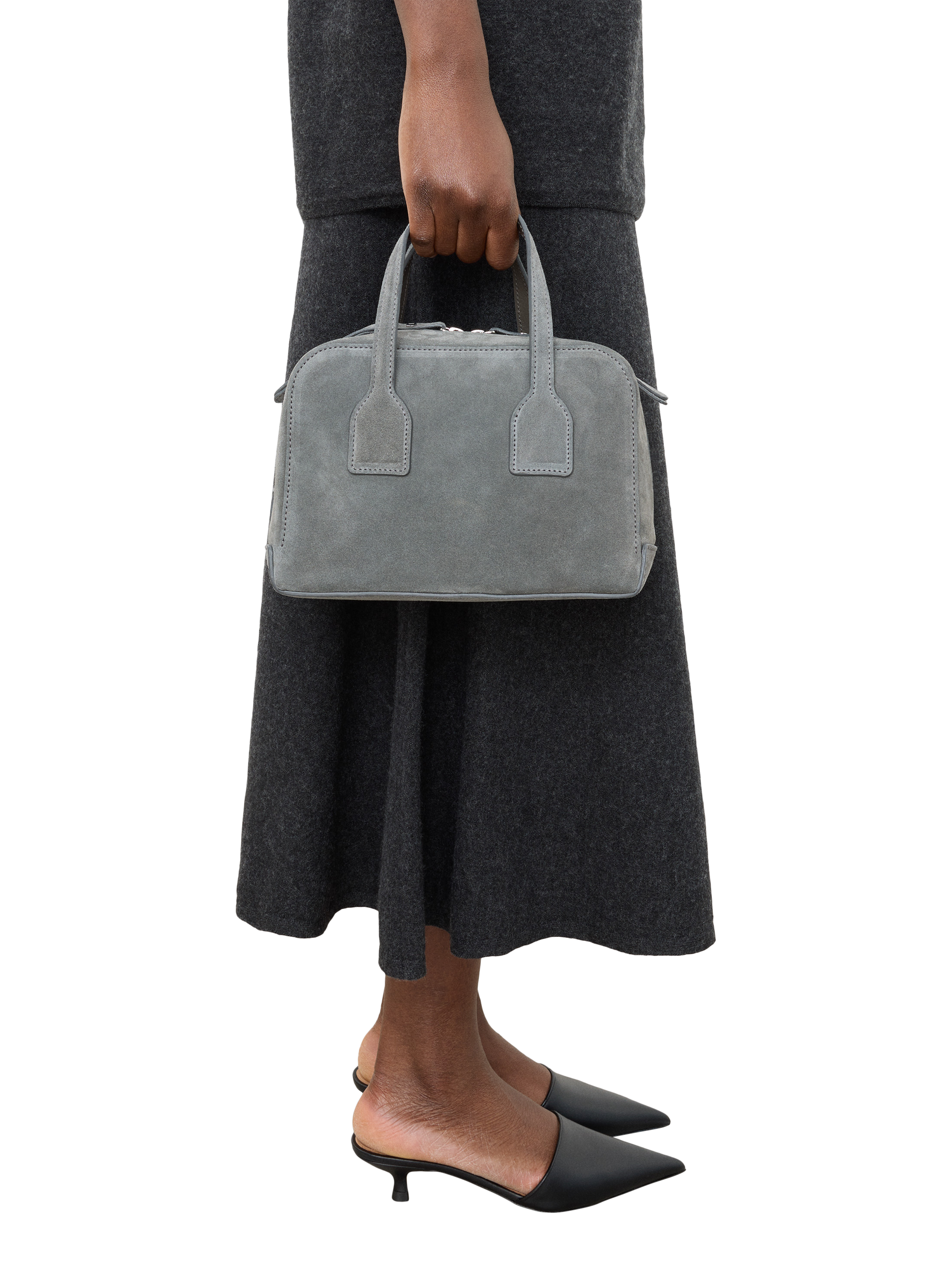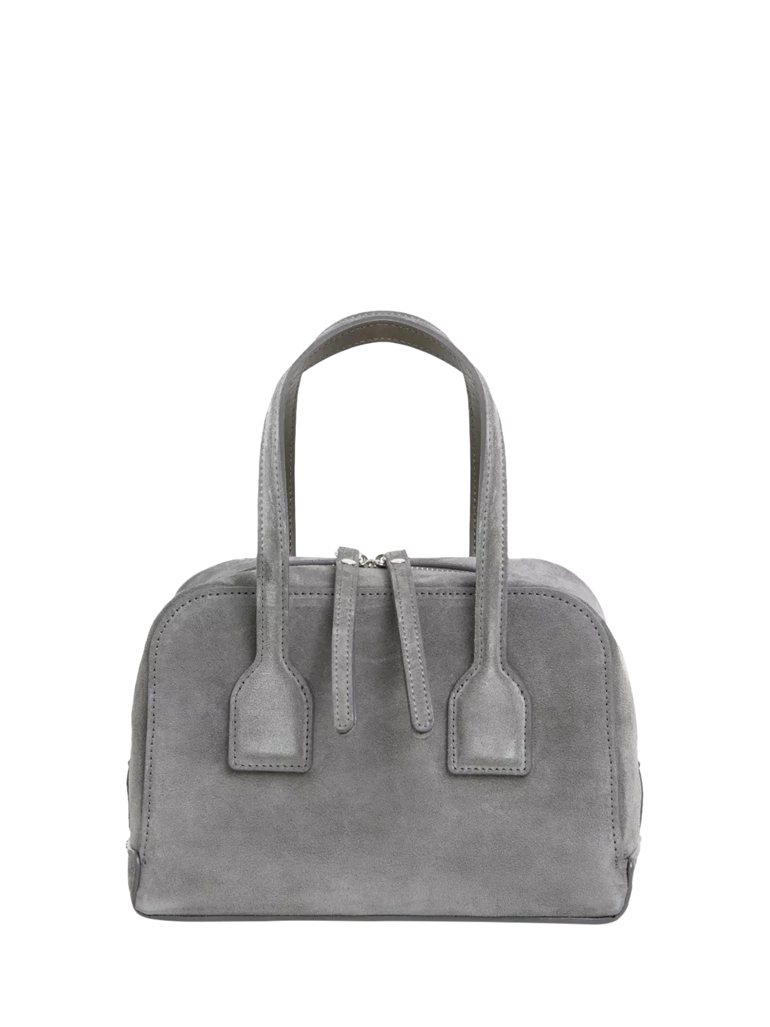 Laci is Flattered's take on the mini Bowler bag that fits all you need. This style features the brand's typical bottom and strap design. Made in Italy, this suede bag is minimalistic, with visible metal hardware and long zip pullers.