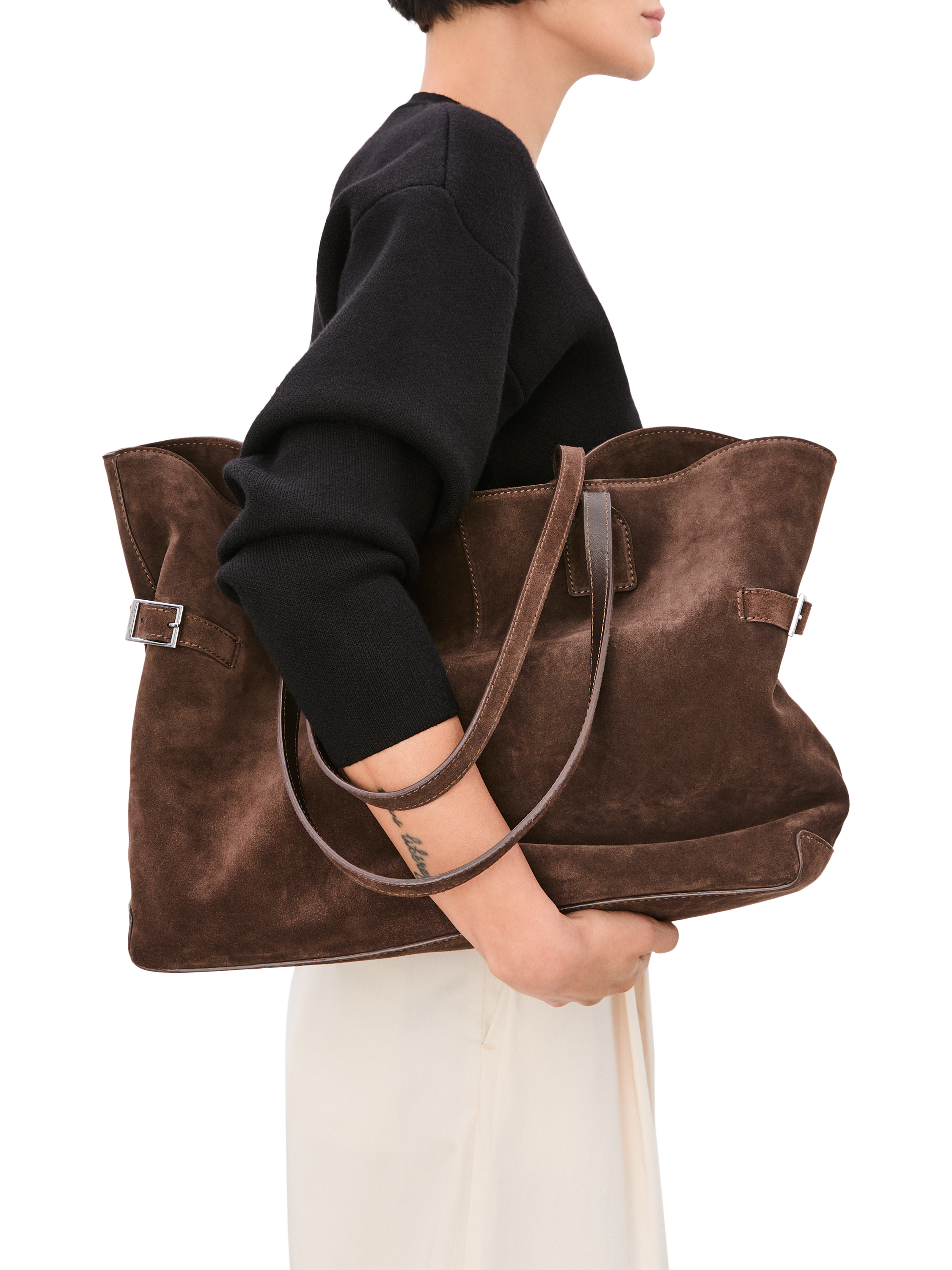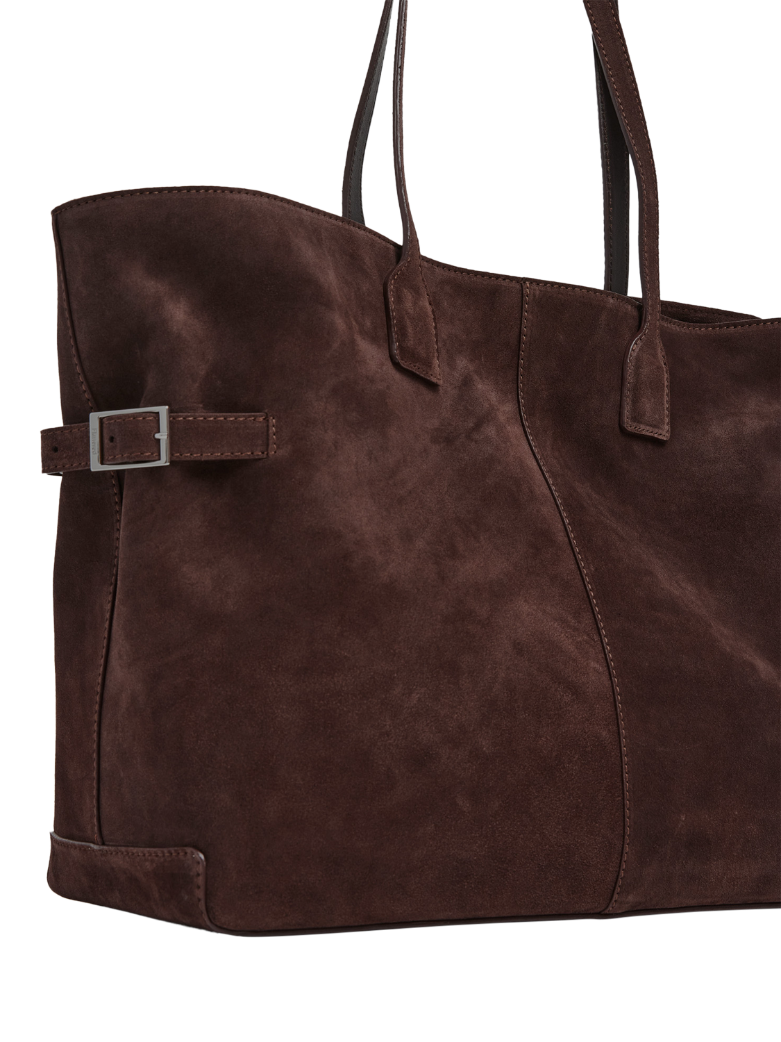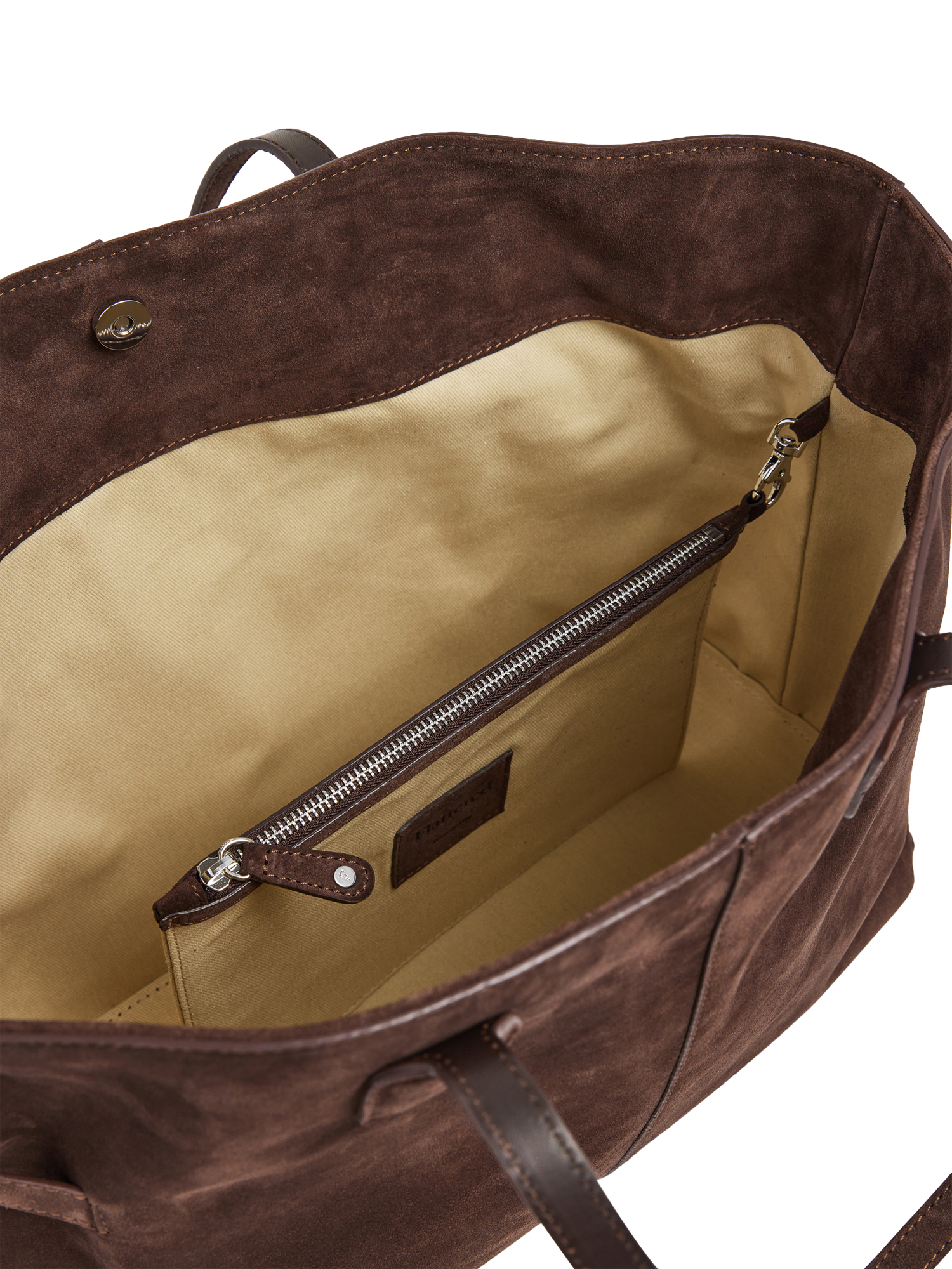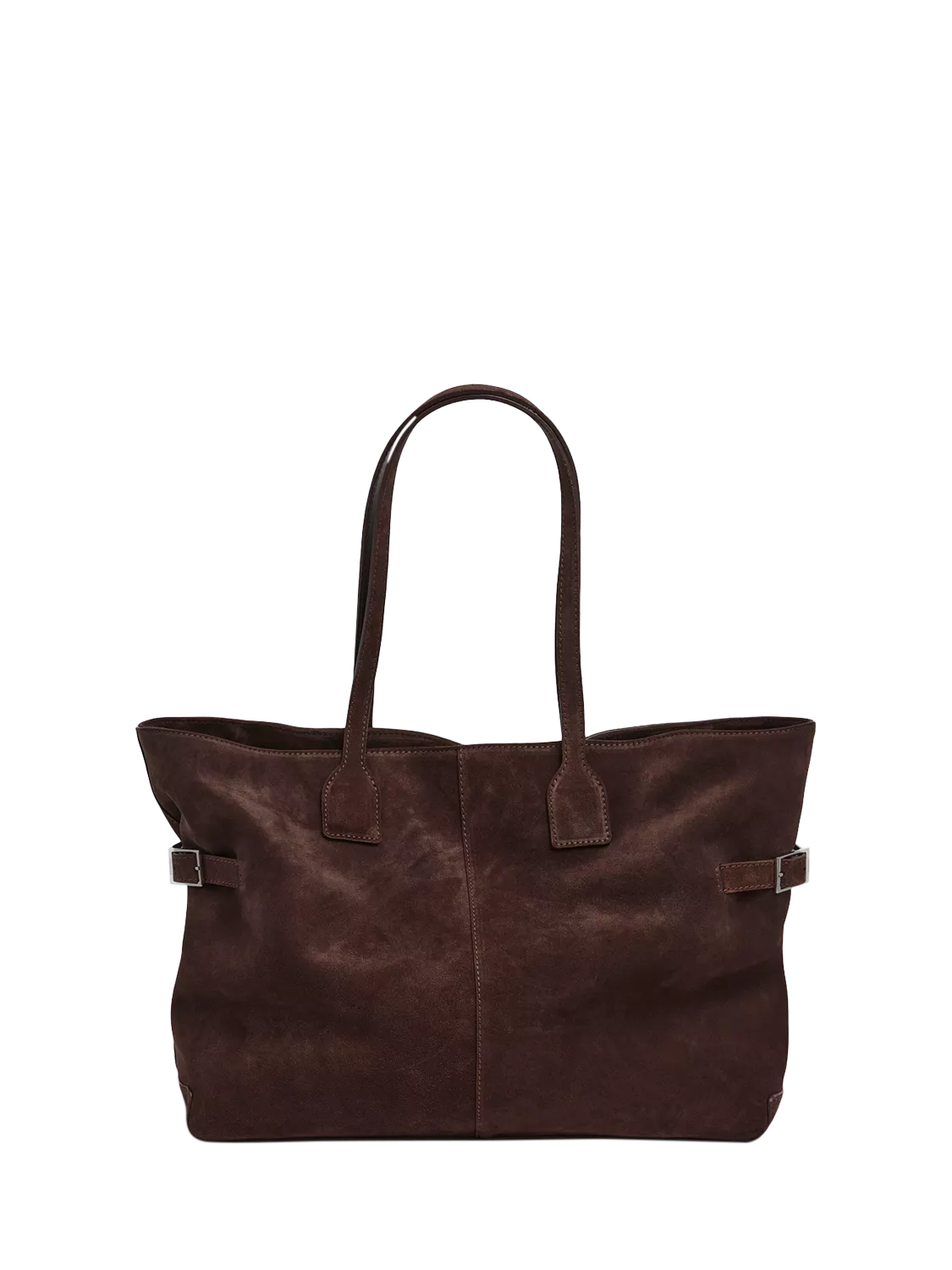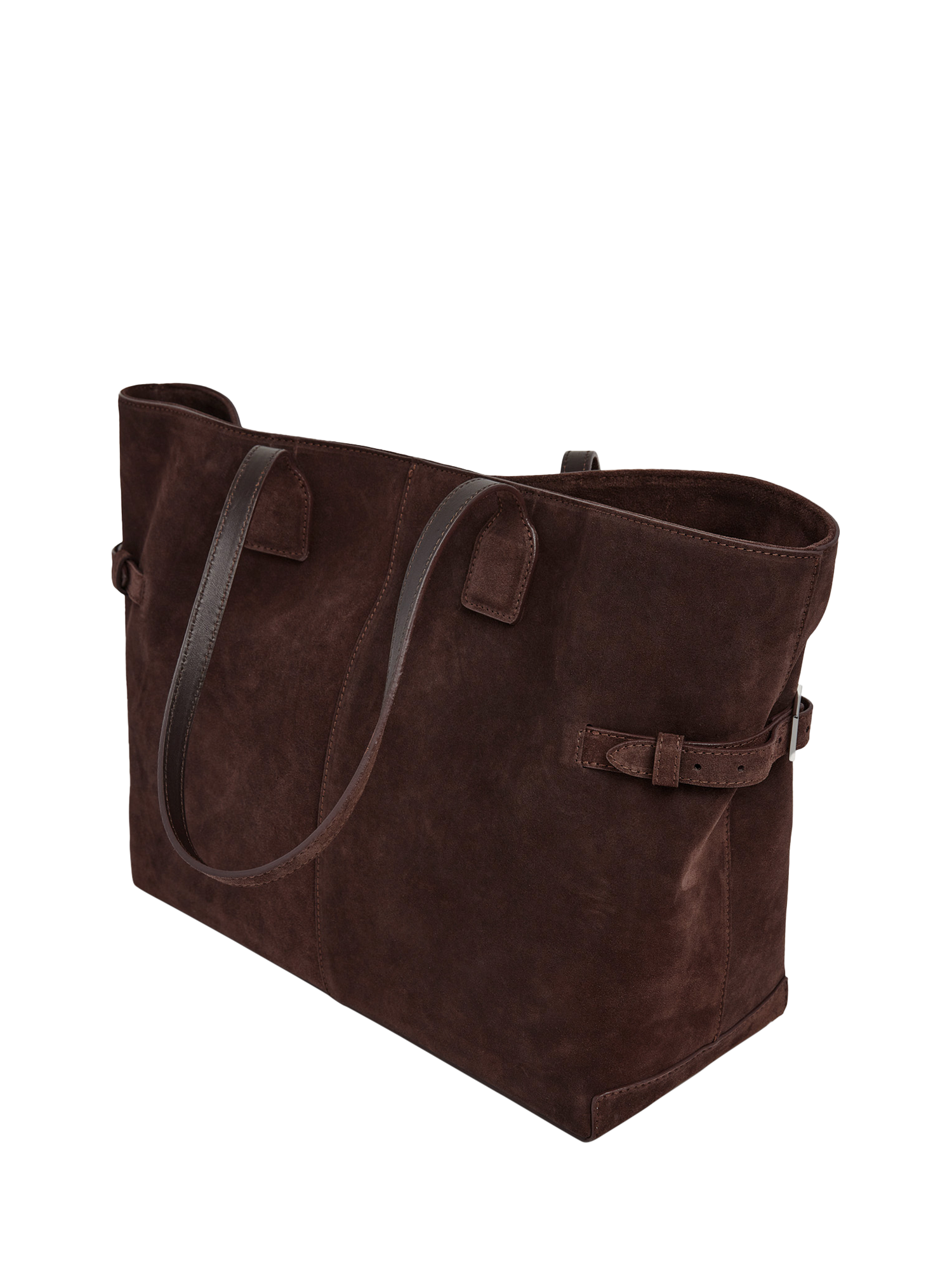 Designed from fine suede with silver-coloured hardware detailing, the bag secures with a magnetic fastening and opens to reveal a spacious interior with a useful zipped pouch.