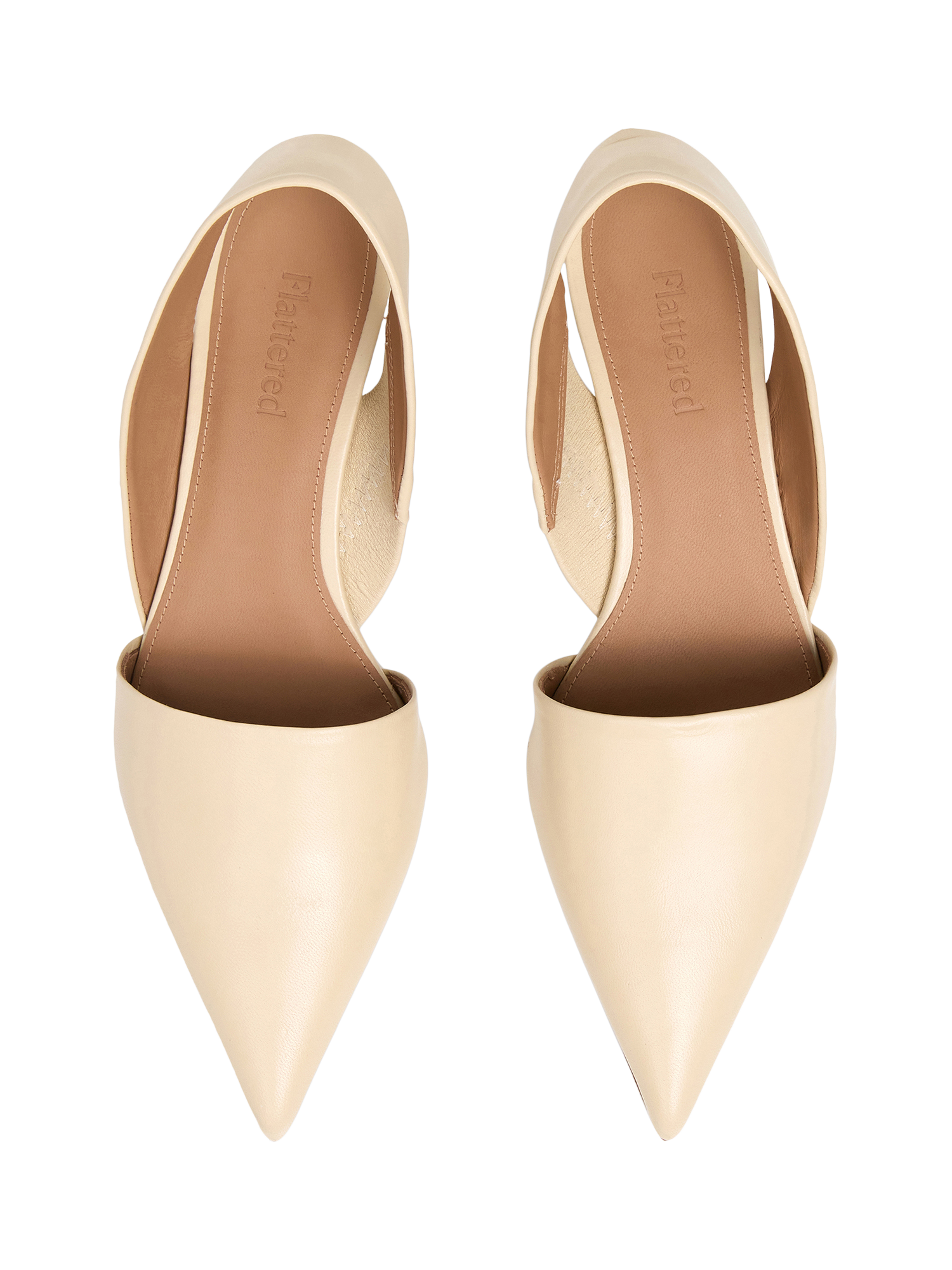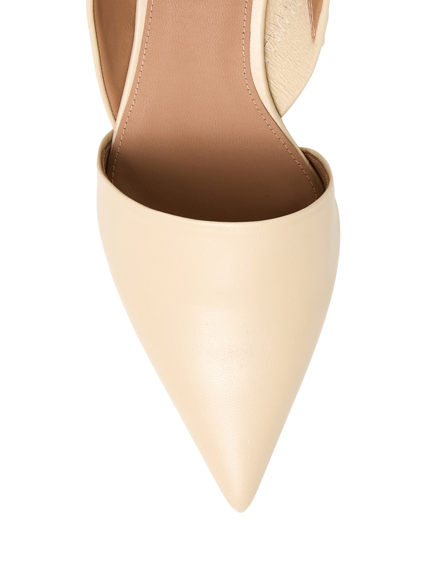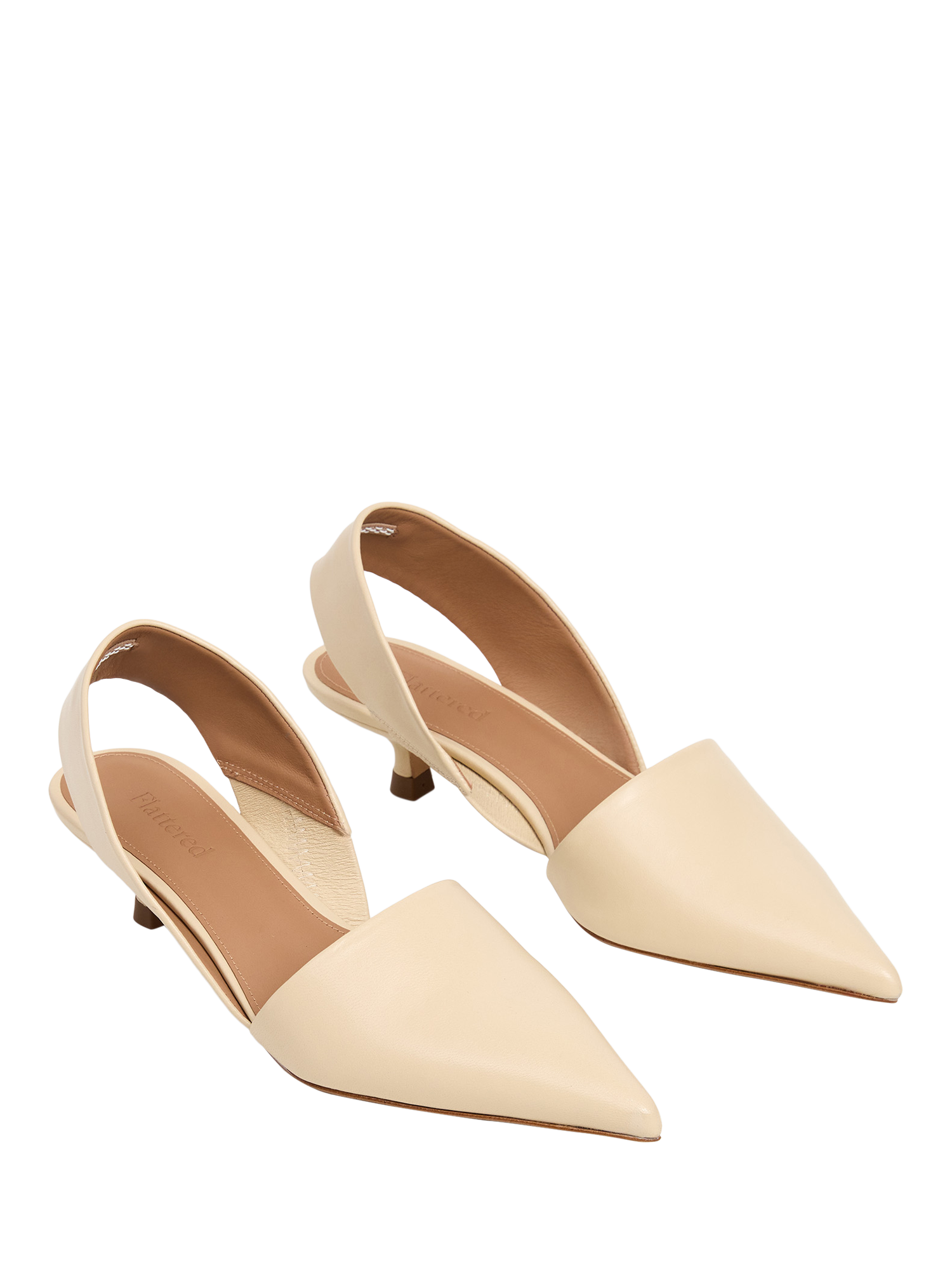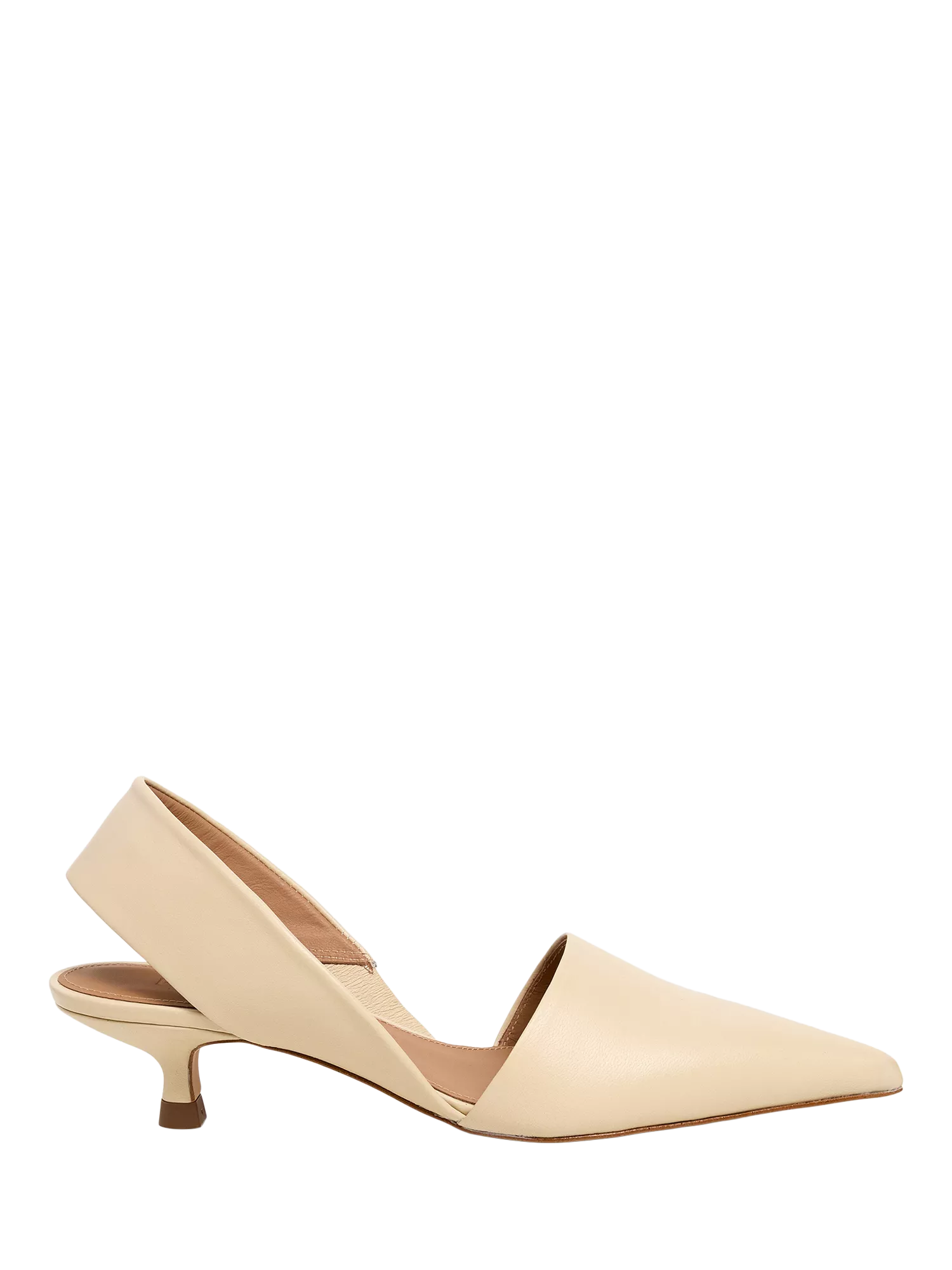 A pair of leather slingback sandals. The pointed toe and low kitten heel keep you ready for everyday plans, while the playful court shoe design adds a clever twist to your style.