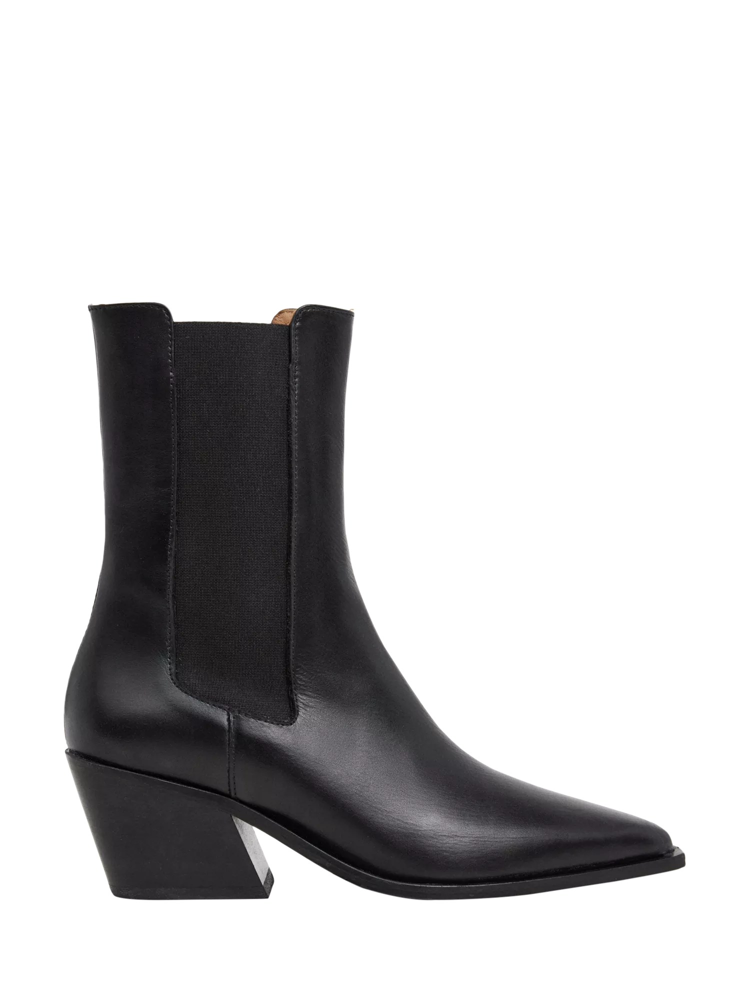A classic low-rise boot with a sleek pointed toe and slightly angled block heel.
