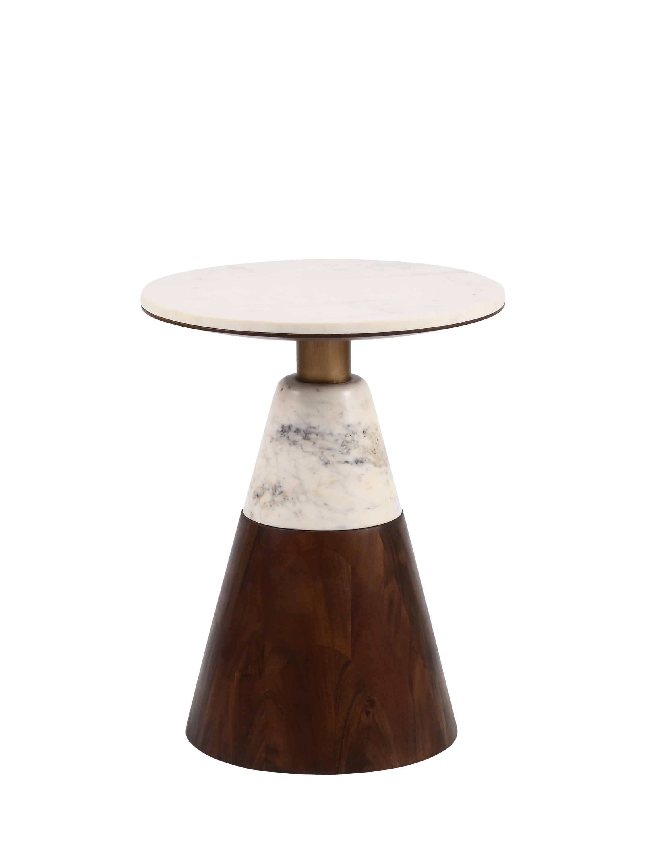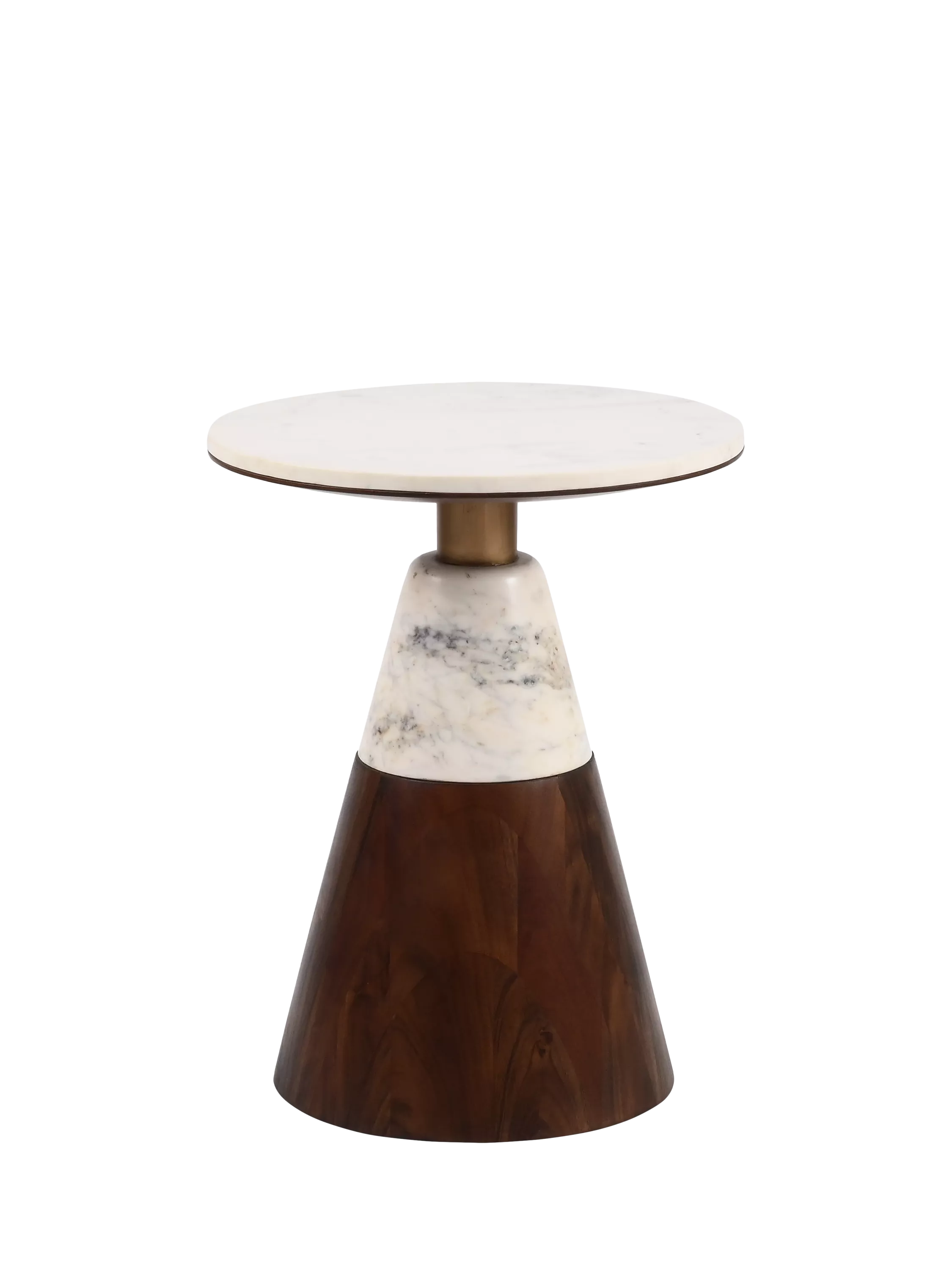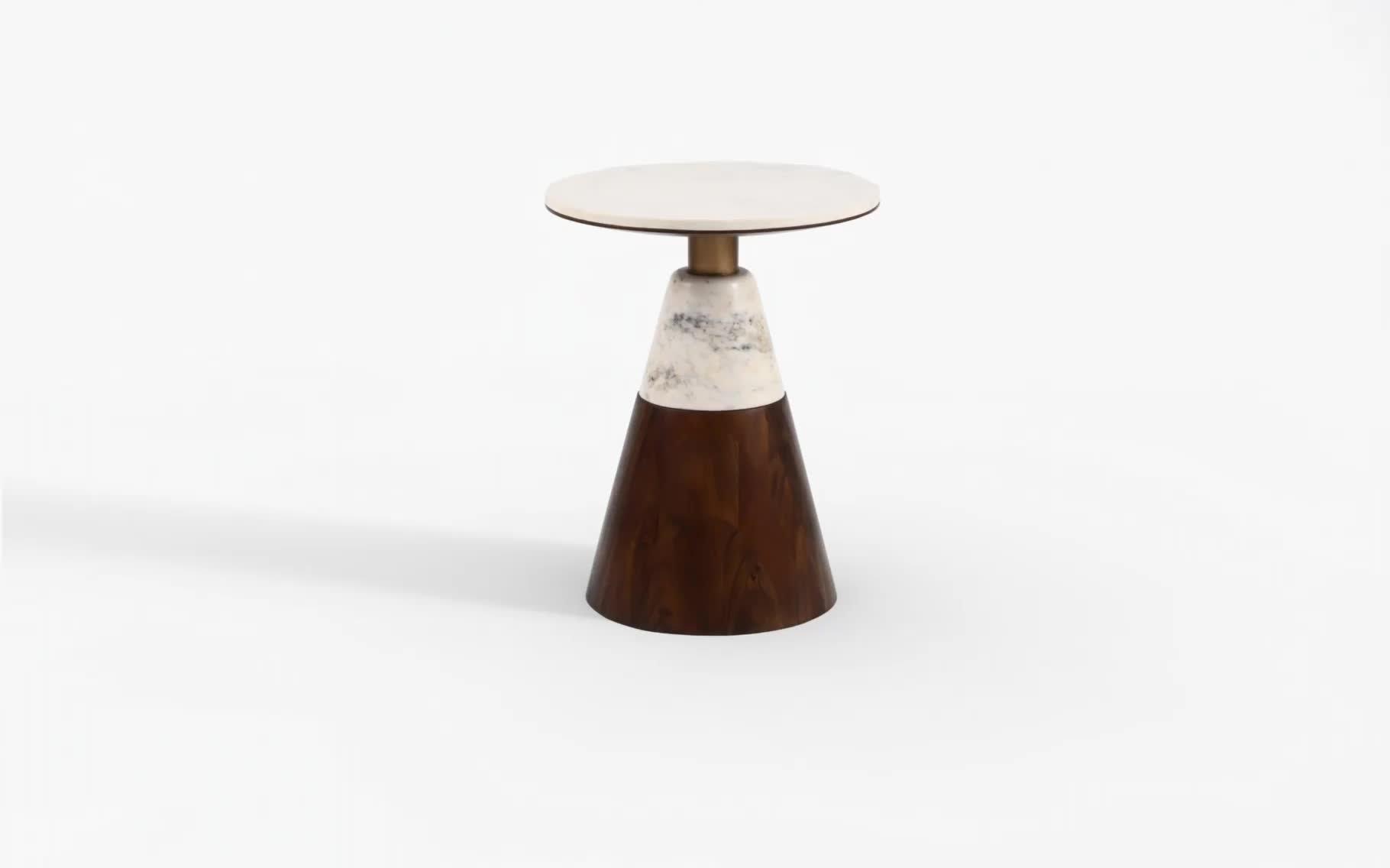This sculptural piece commands attention through its distinctive three-tier construction: a rich dark brown acacia wood cone provides a grounded, substantial base; a contrasting white marble cylinder creates a striking mid-section transition; and a perfectly round marble top completes the composition with refined elegance.