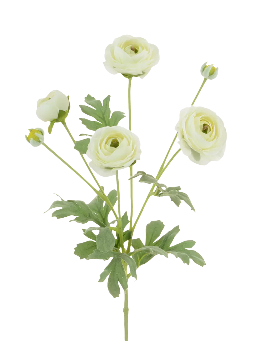 This stylish faux Ranunculus is the epitome of summer prettiness. Layer upon layer of soft, realistic petals form the open blooms, which are complemented by dainty buds and fronds of lush green foliage. The wired stem can be cut or bent to achieve the desired length for a bespoke arrangement.