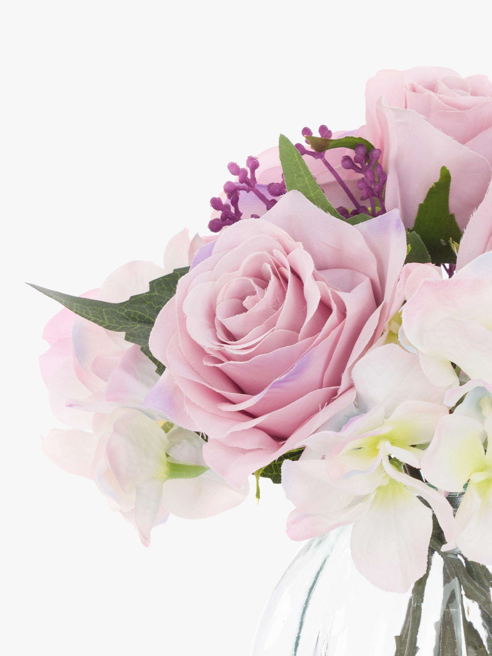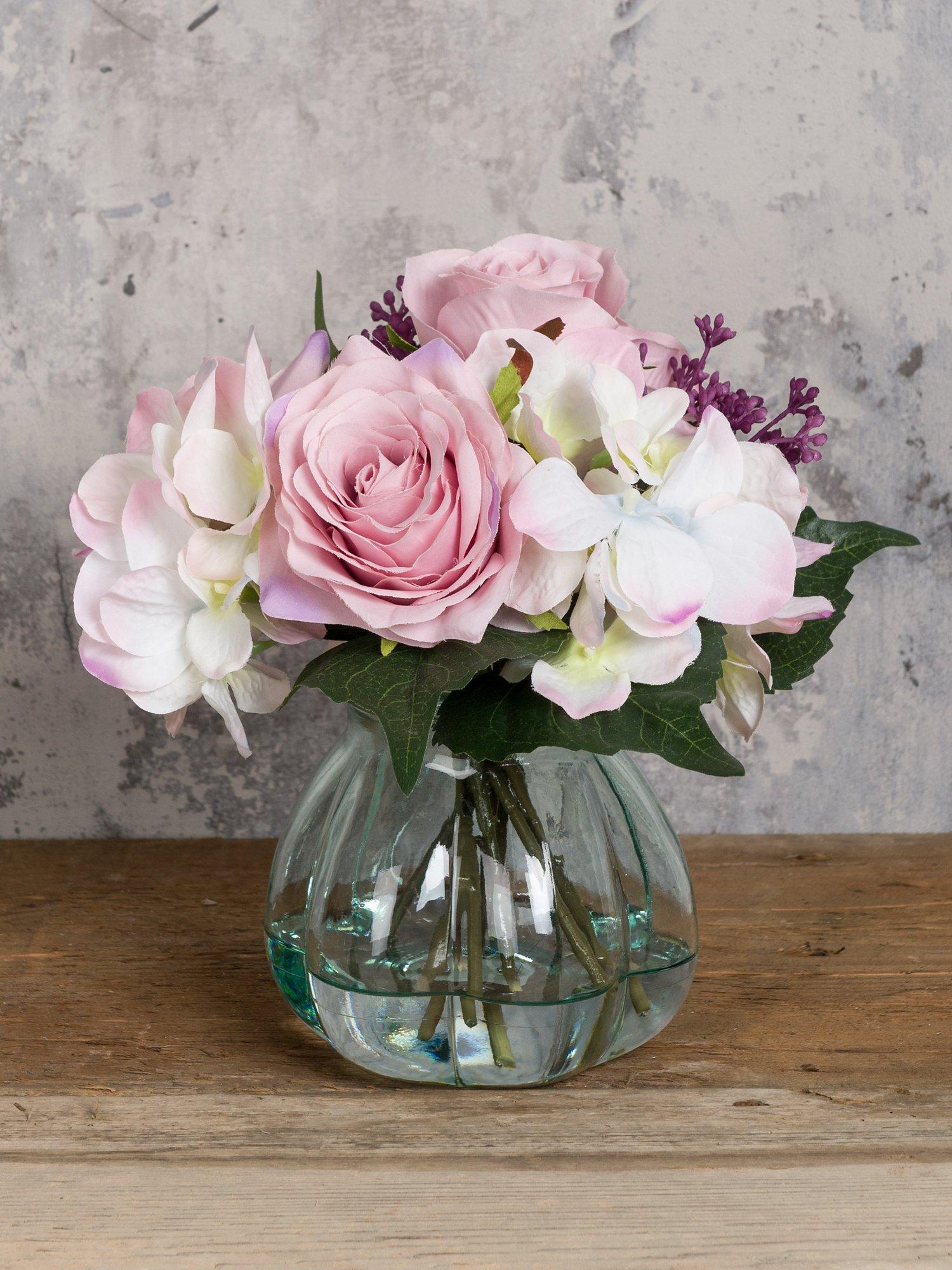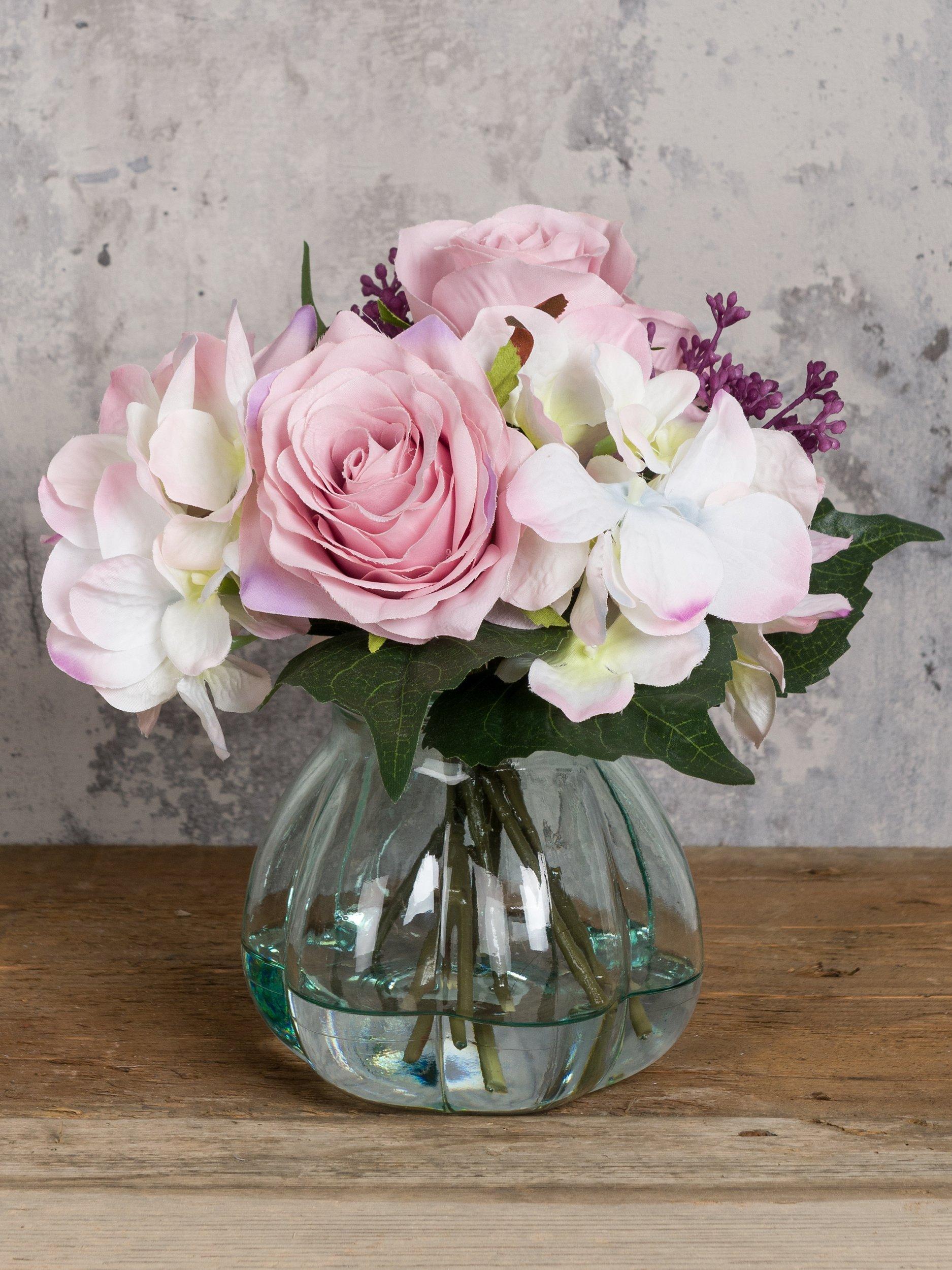 This pretty arrangement features a lovely mix of floral stems, set in a recycled glass vase. With authentic detail and colouring, this charming piece would make a delightful gift for someone special.