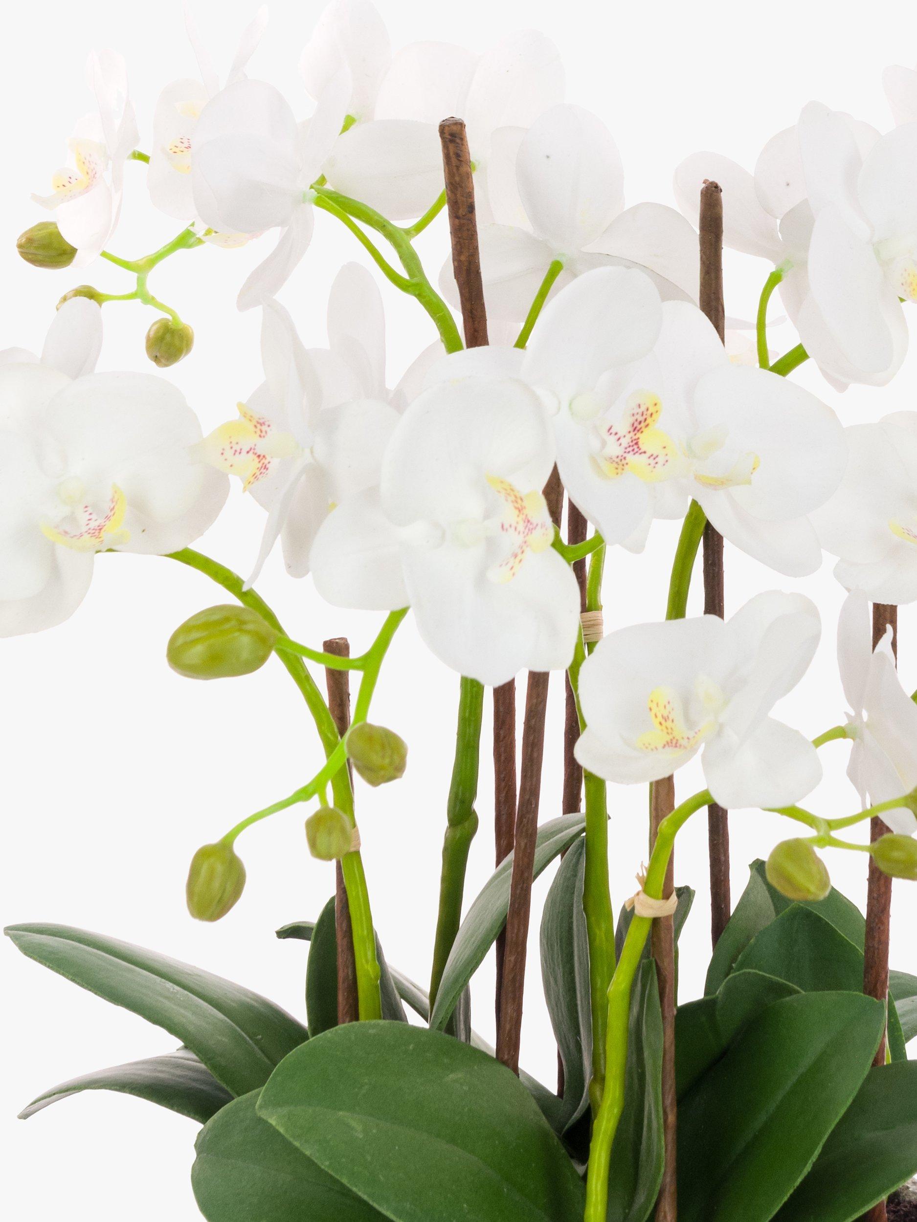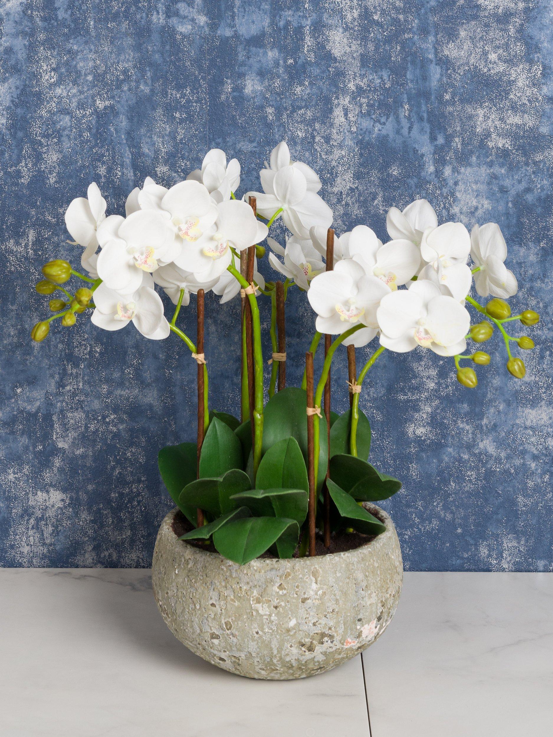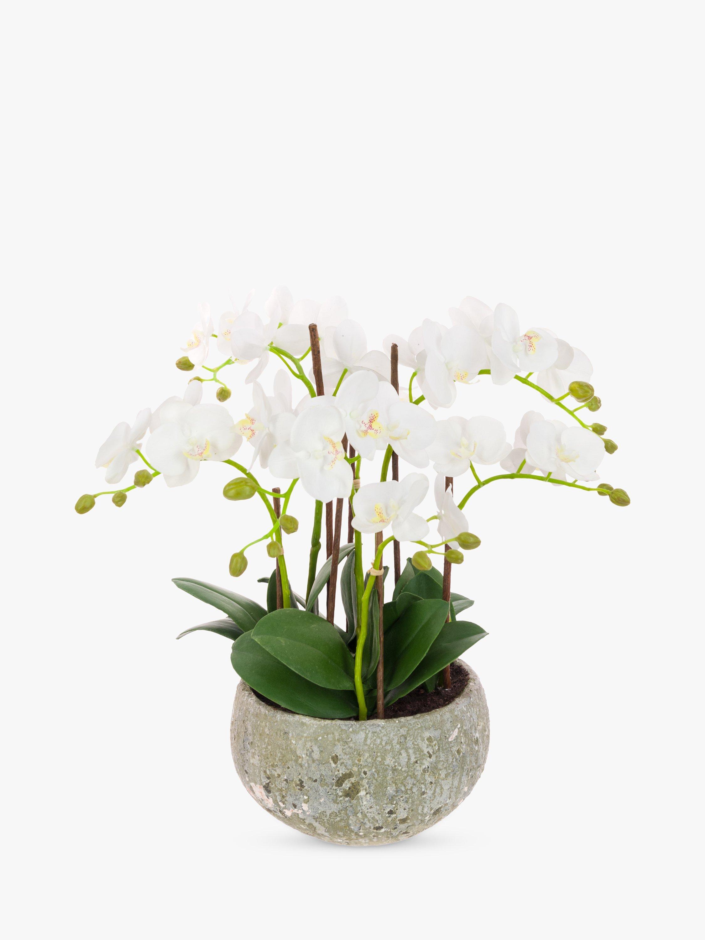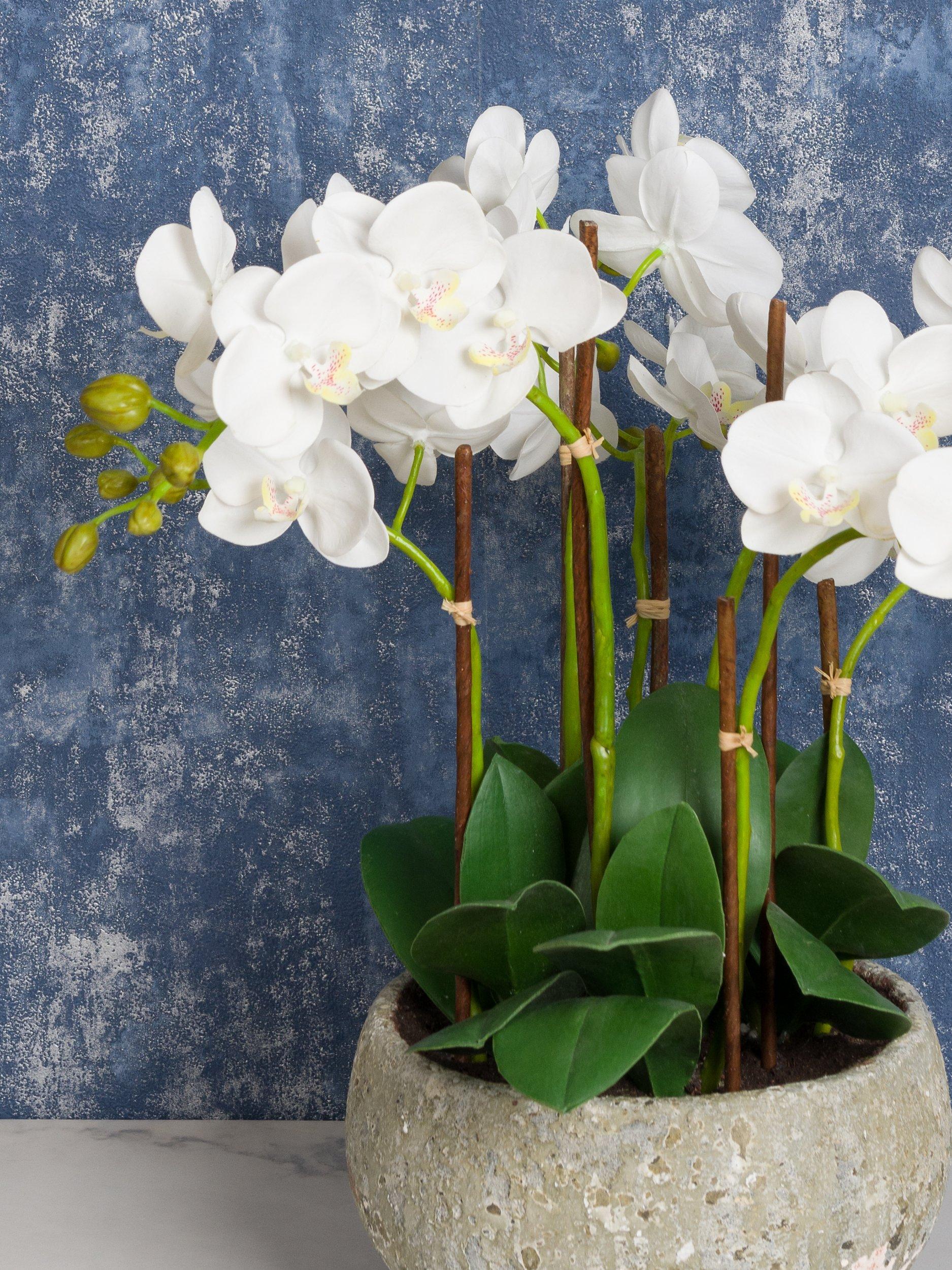 Looking for an alternative option to a floral arrangement? This potted orchid in a natural clay pot fits the bill perfectly. The realistic flower heads, green buds and leaves are set in artificial soil, giving a truly lifelike appearance.