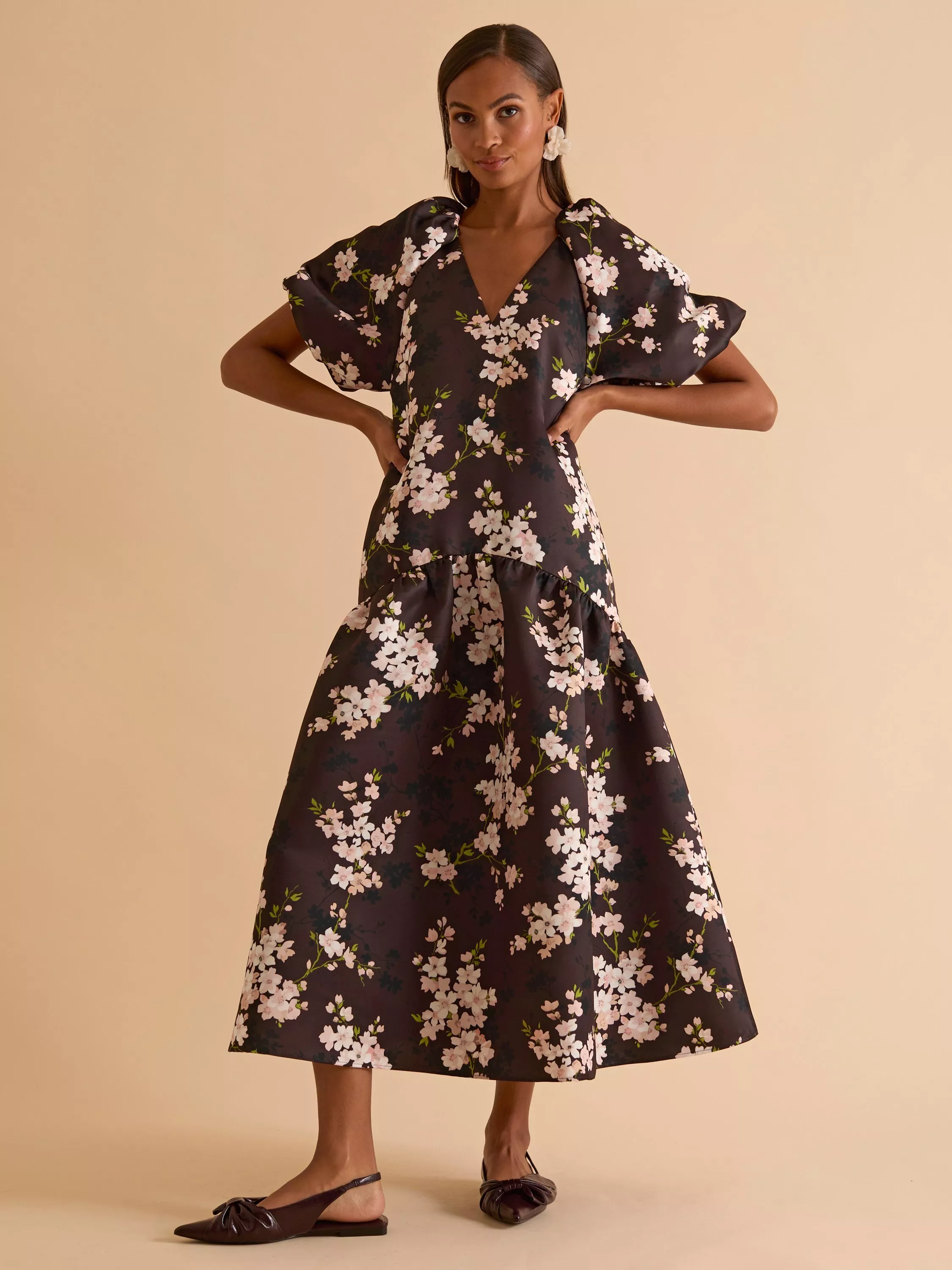This voluminous silhouette midi dress is a true Florere signature. The combination of the dramatic blouson sleeves and a chocolate blossom print makes this dress a seasonal showstopper.
