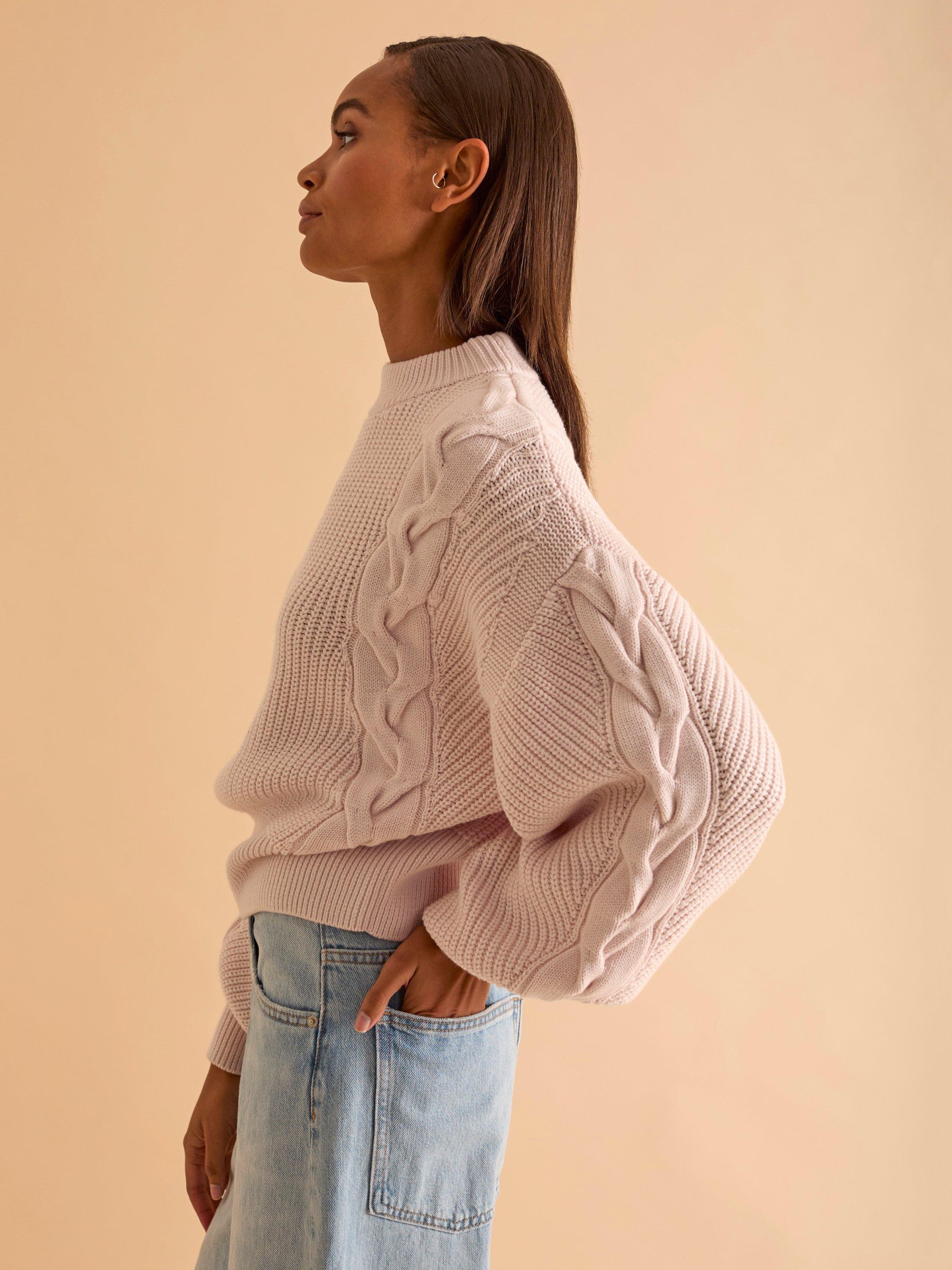 Crafted in the softest Wool blend, this chunky, cable knit detail jumper, featuring a high neck and blouson sleeves, is a true season staple.