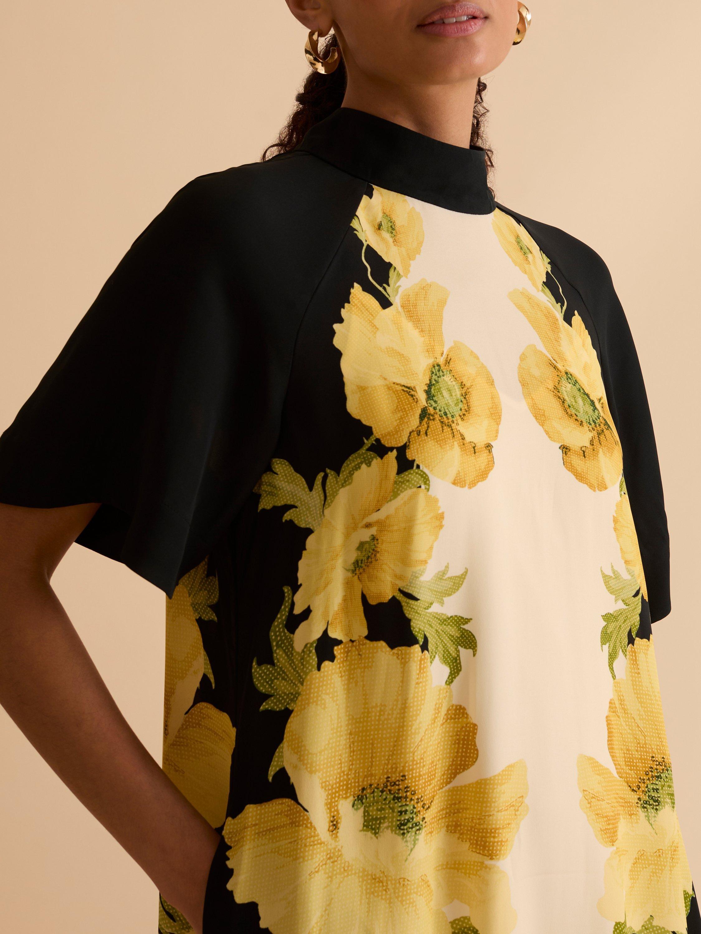 This high neck maxi column dress is the perfect showcase for a signature eye-catching floral print. The tie neck and pockets complete the look.