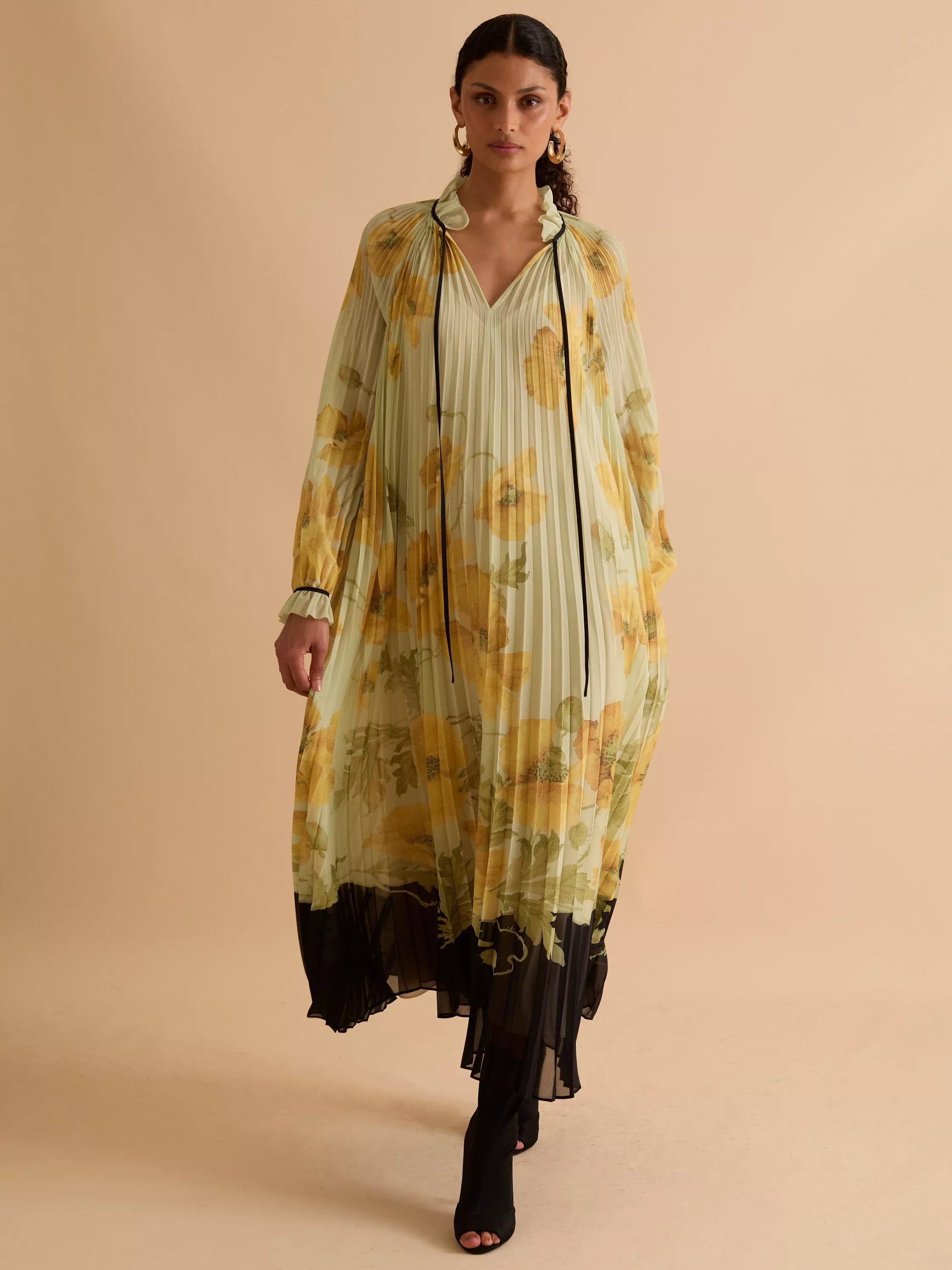 This signature pleated midi dress has a contrast neck tie and cuff detailing - elevating a classic silhouette.