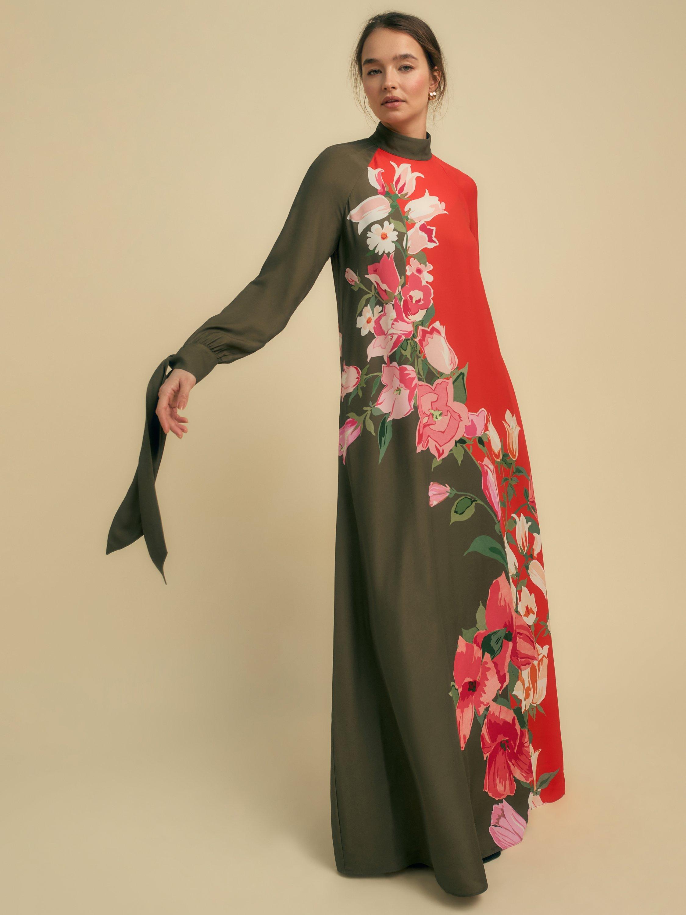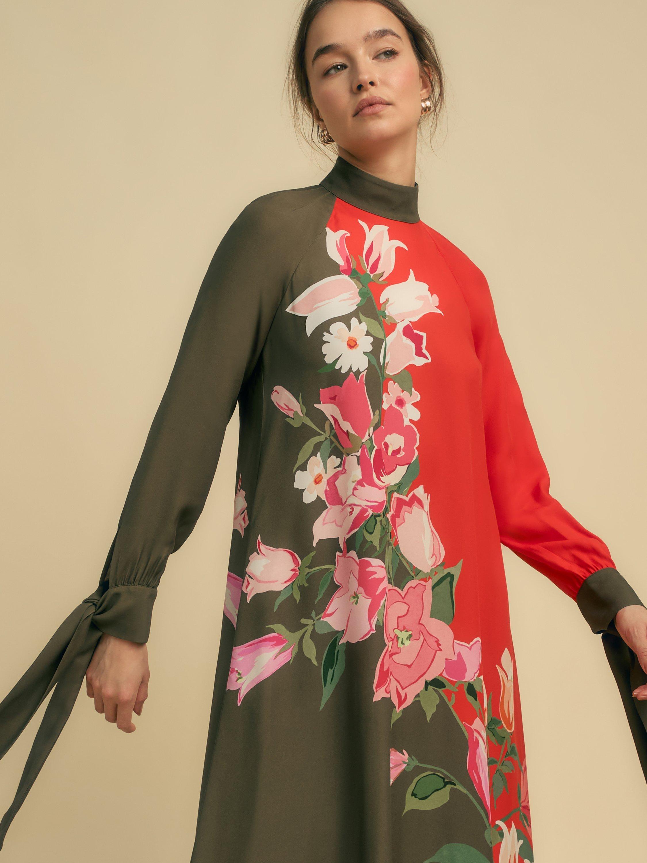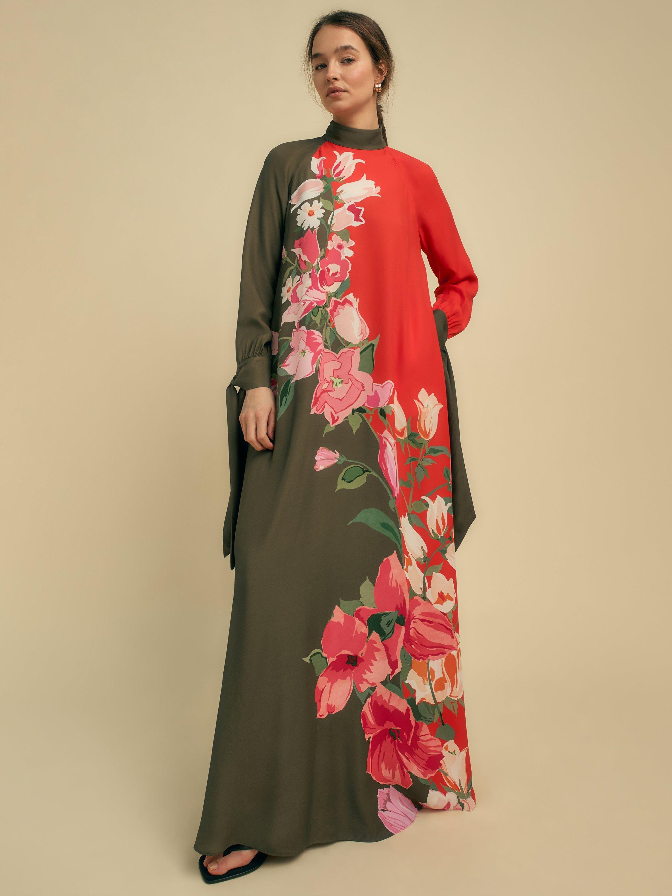 This modern bias cut dress is the perfect showcase for the Peony Bloom print.- Fit and flare- Zip back- Separate cami lining- Crew neck- Batwing sleeves- Zip cuffs- Curved waist seam- Maxi length- Peony Bloom Print.
