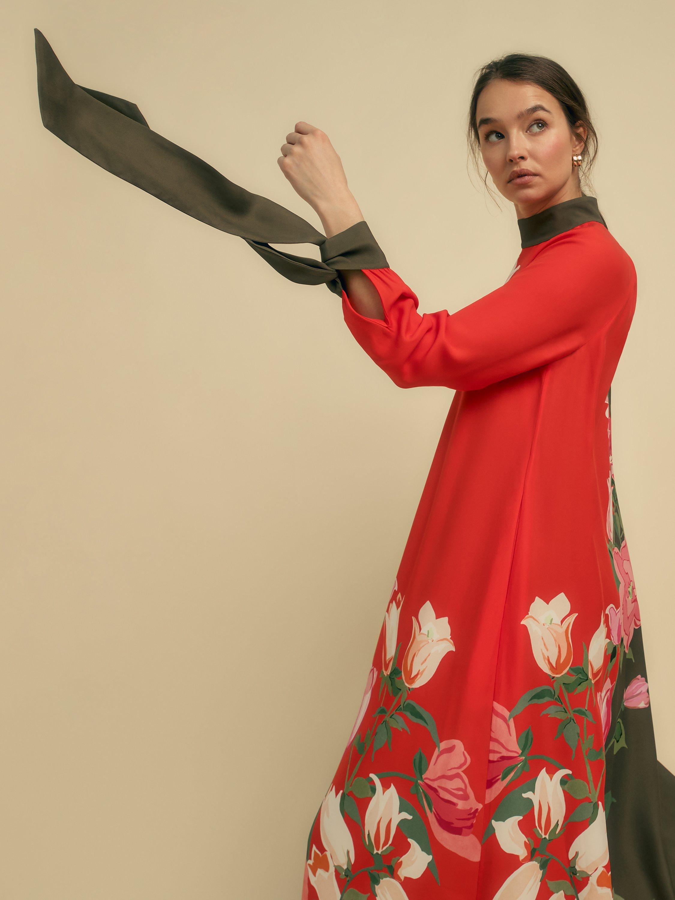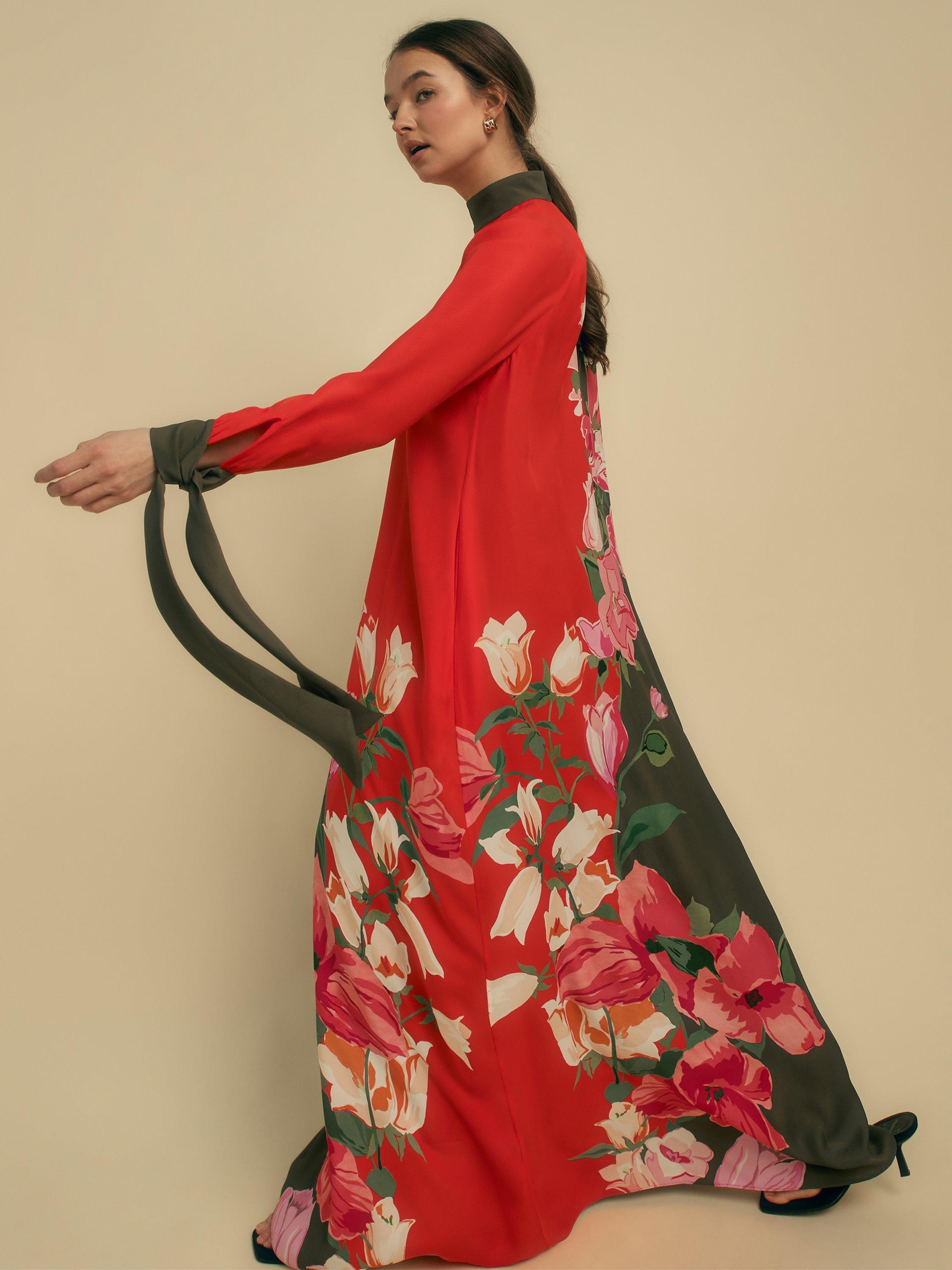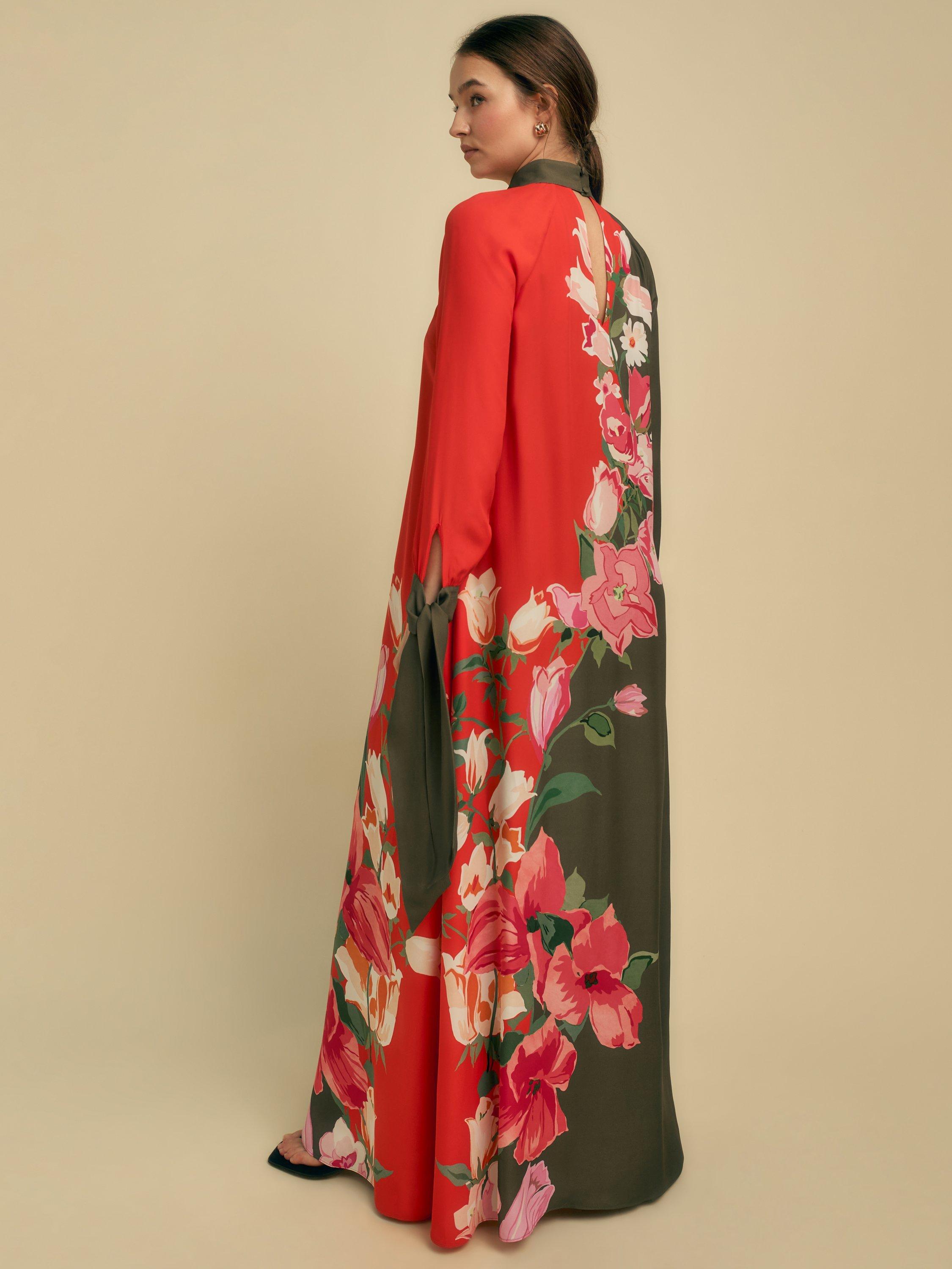 This modern bias cut dress is the perfect showcase for the Peony Bloom print.- Fit and flare- Zip back- Separate cami lining- Crew neck- Batwing sleeves- Zip cuffs- Curved waist seam- Maxi length- Peony Bloom Print.