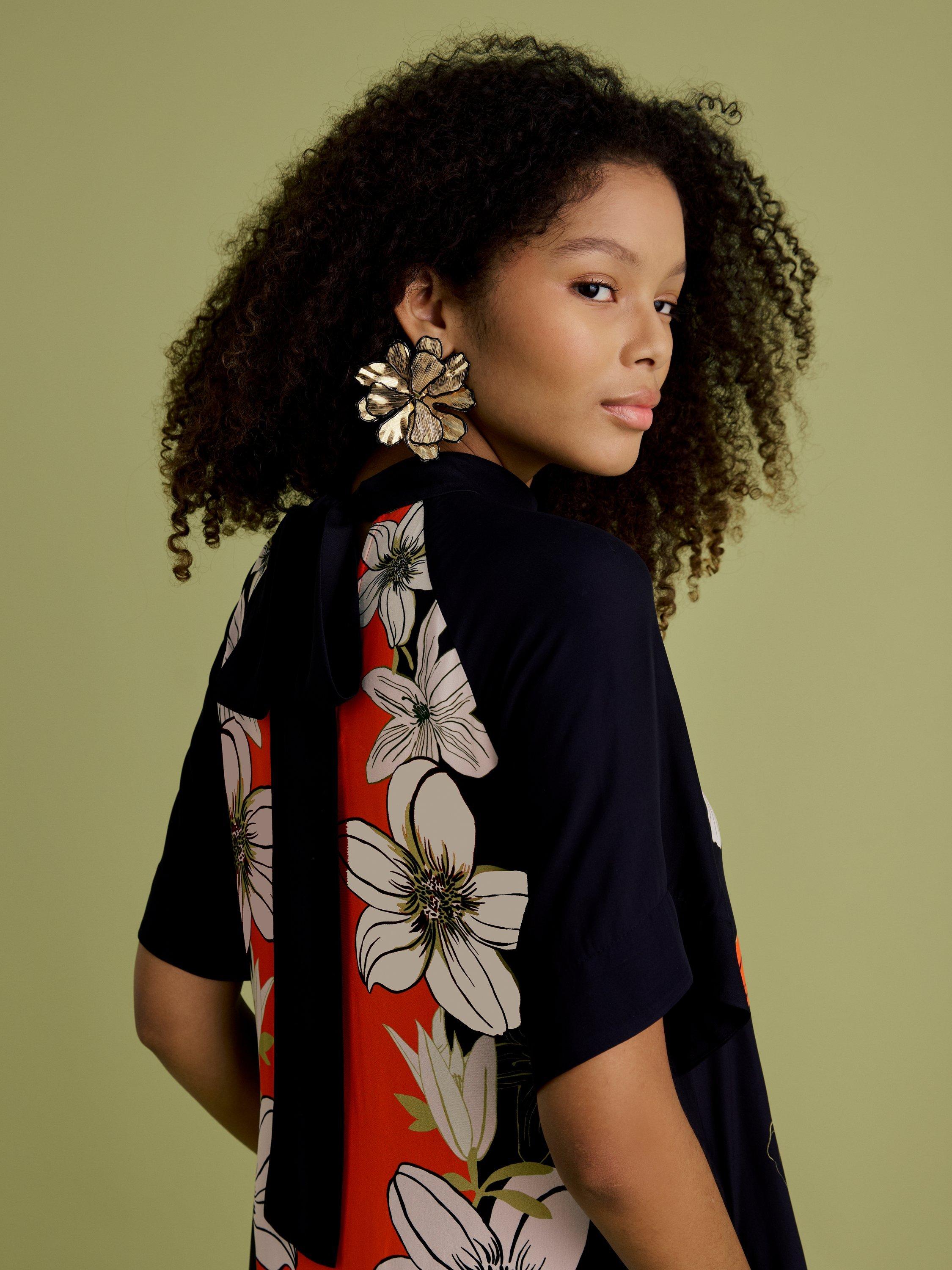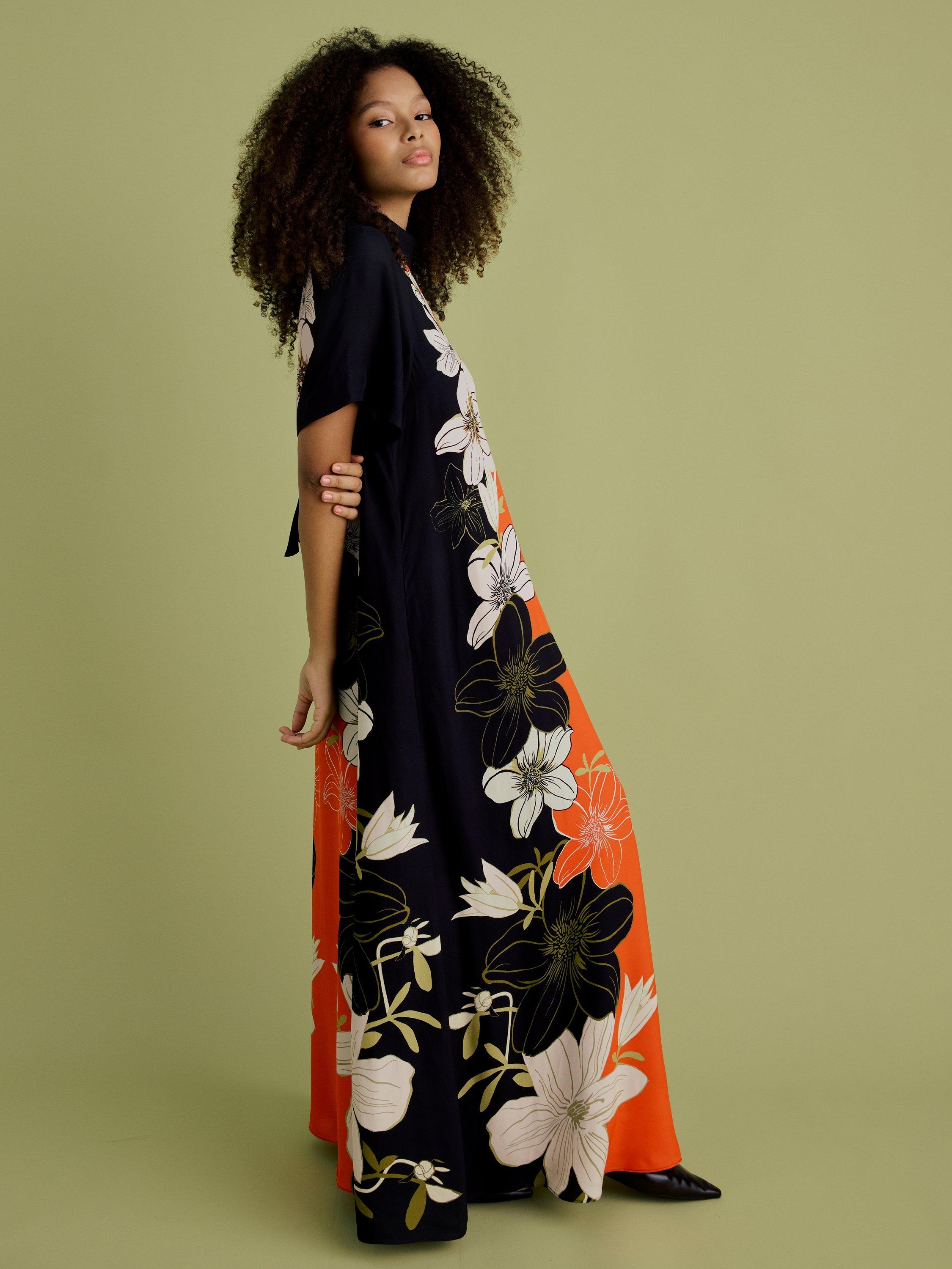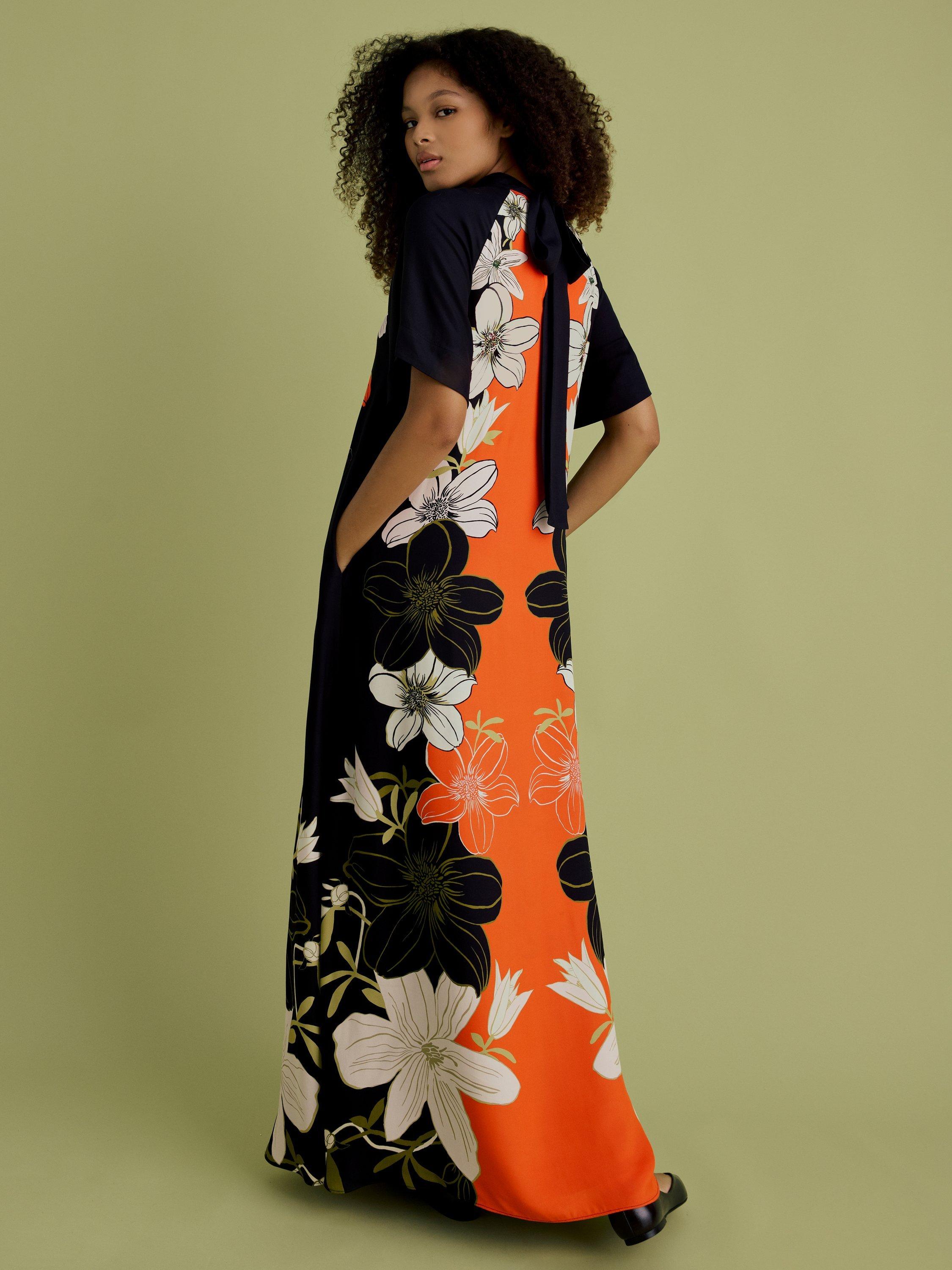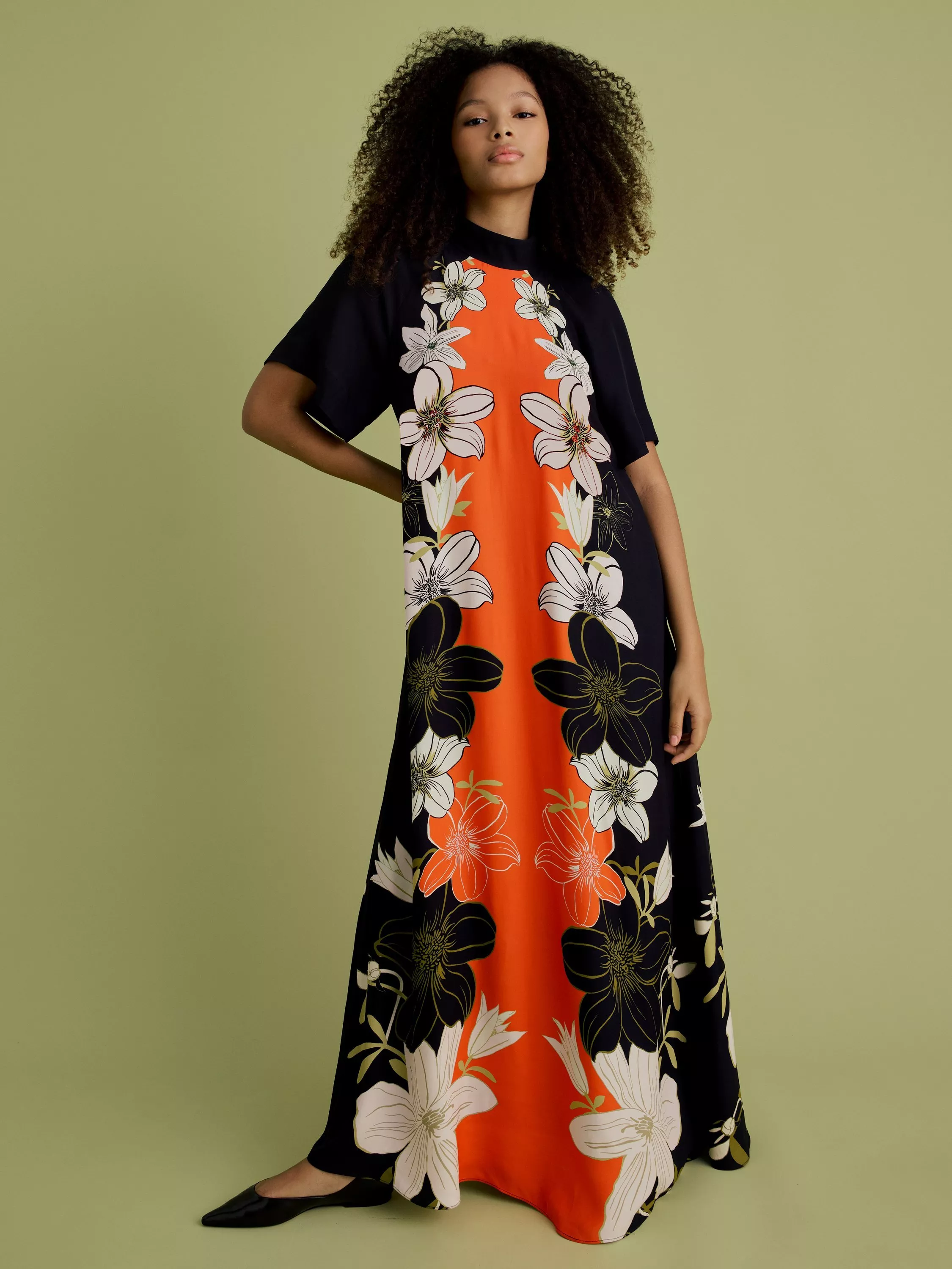 This high-neck maxi column dress is the perfect showcase for a signature FLORERE eye-catching floral print. The tie back and pockets complete the look.