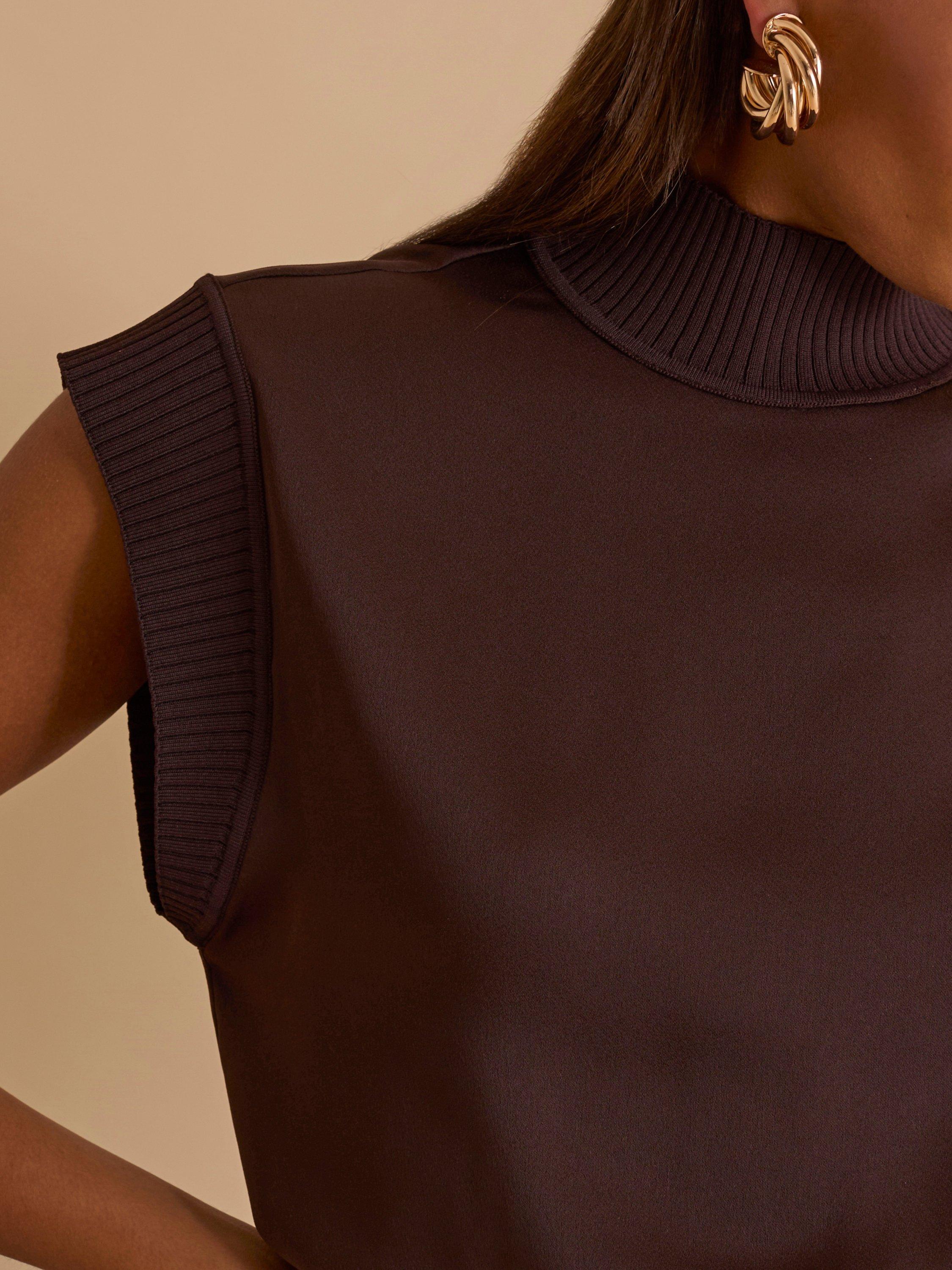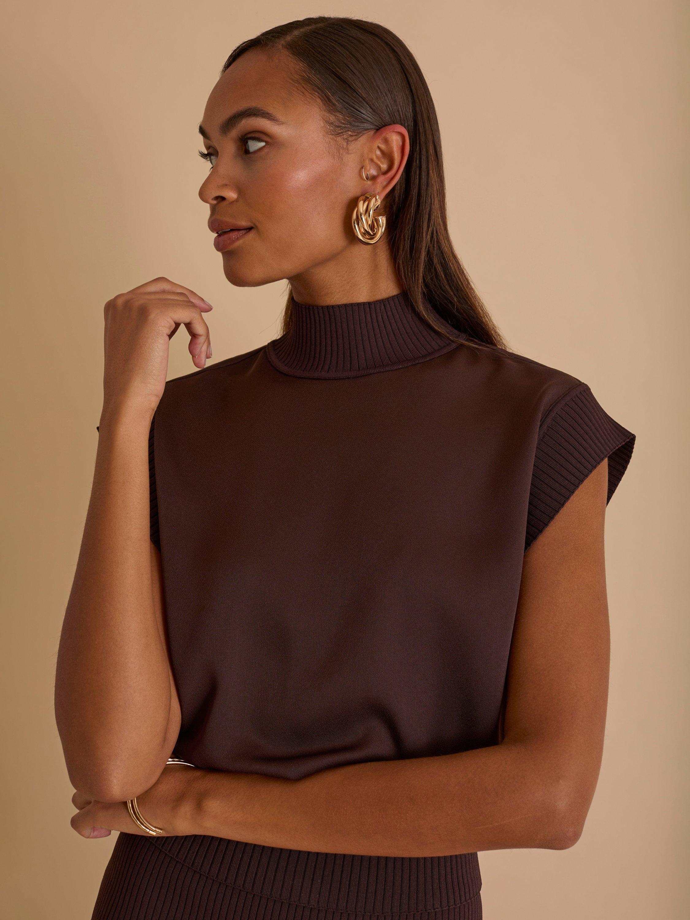 With a knit rib collar and hem band, this satin top takes a signature fabric combination and updates it.