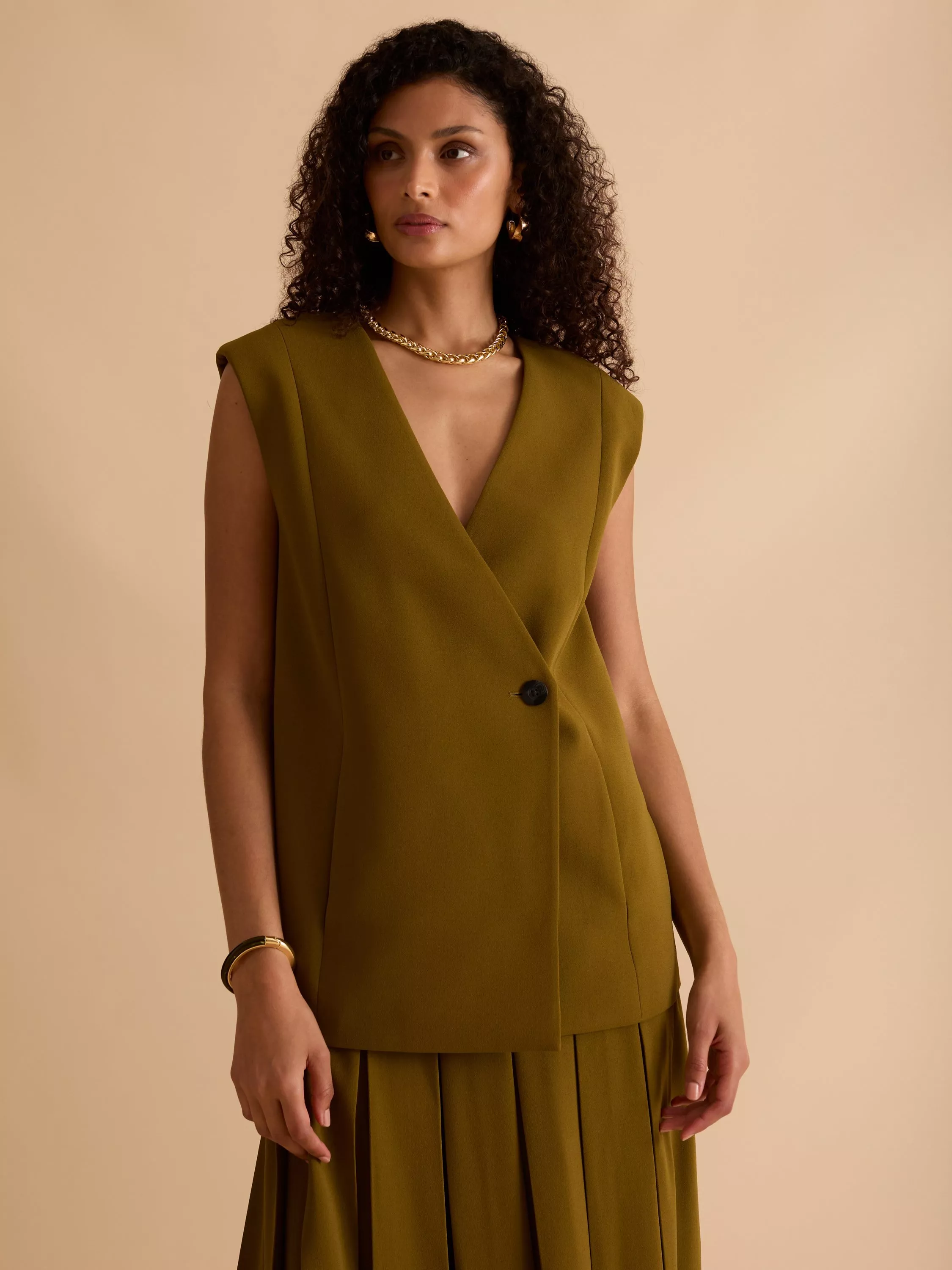 This longline waistcoat offers a modern take on classic tailoring. The perfect pairing with a pleated skirt.