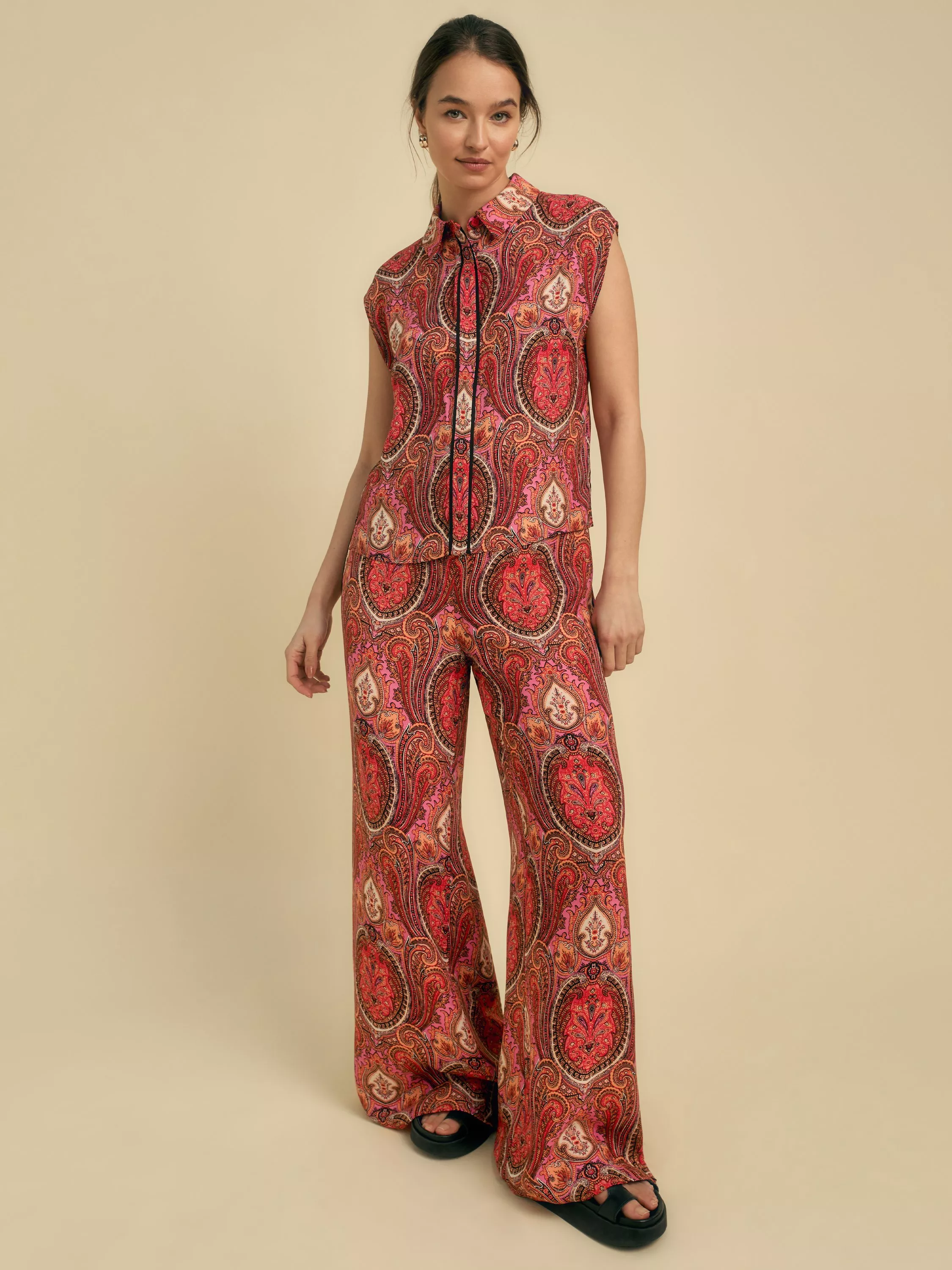 A flattering wide leg silhouette in bright hues gives this classic paisley print a contemporary spin.