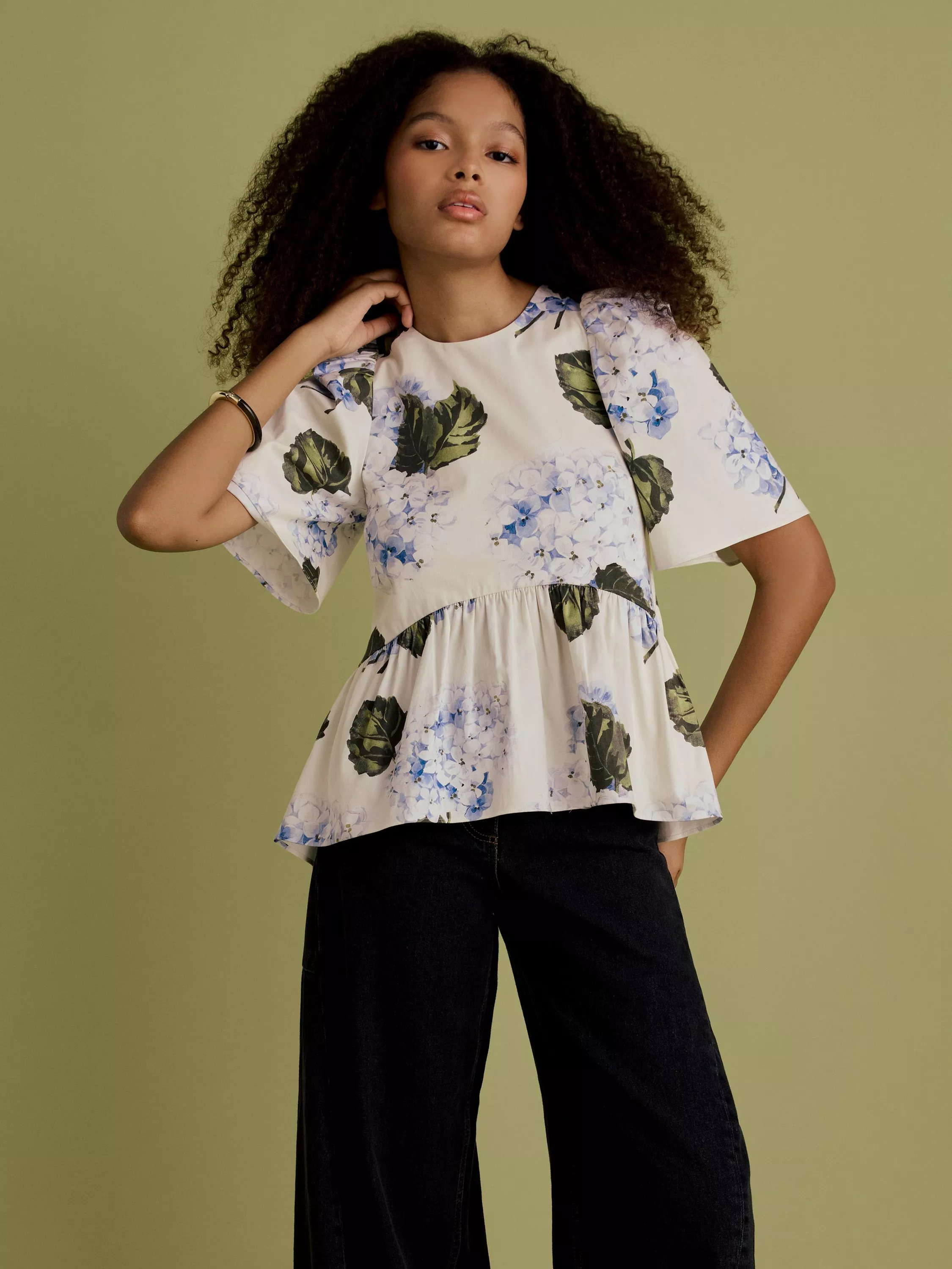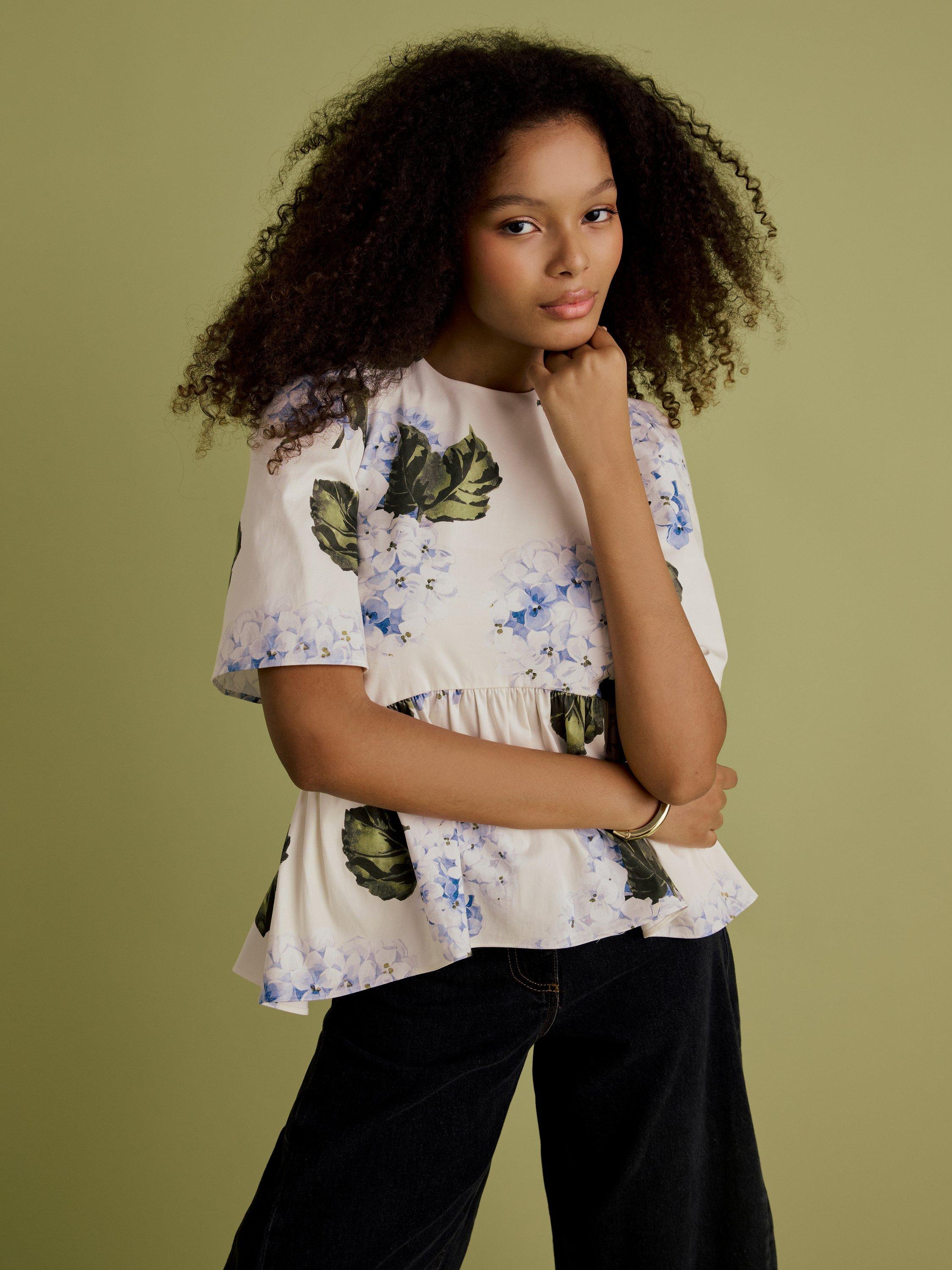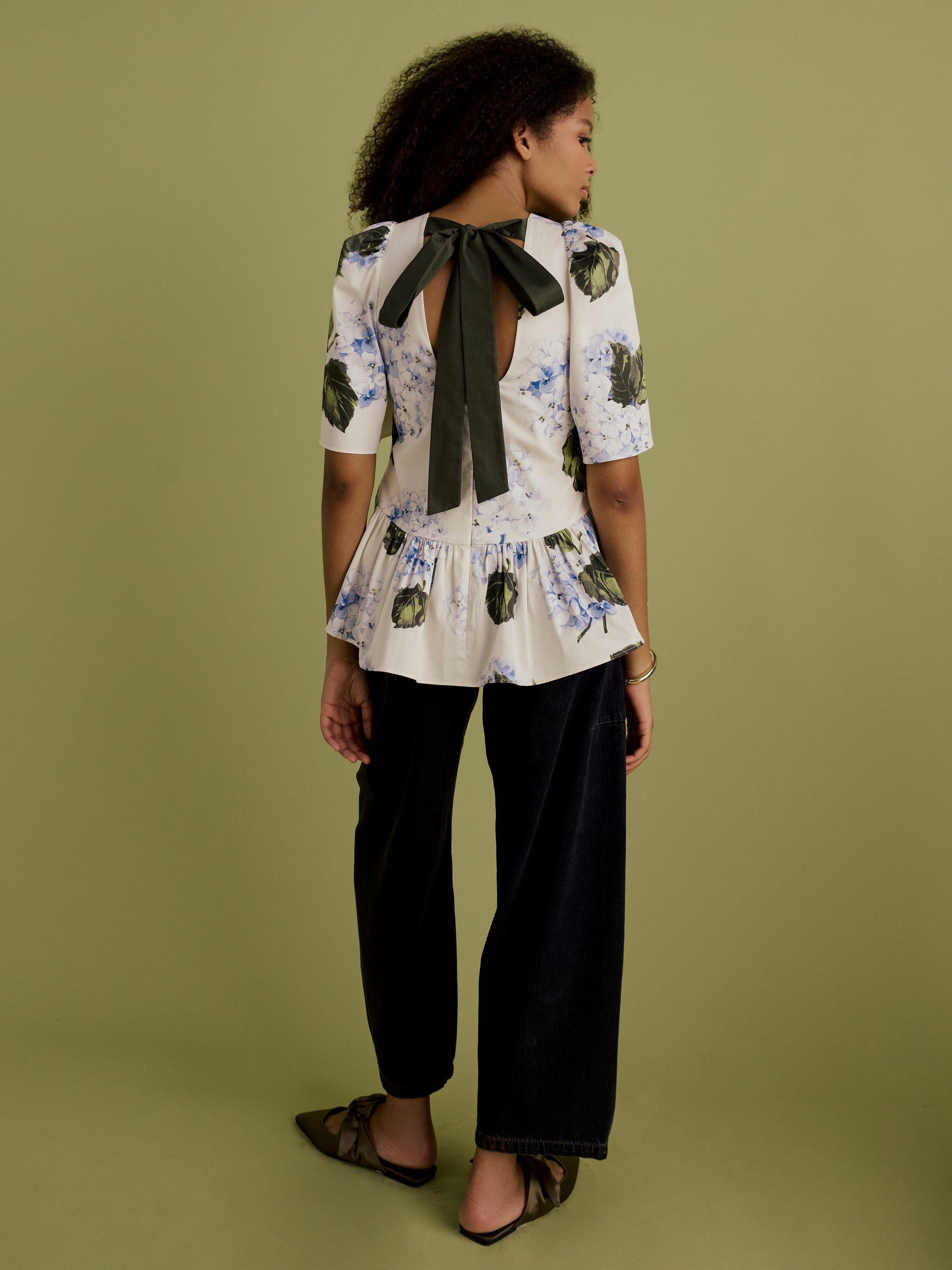 This cotton peplum top with dramatic puff sleeves is the perfect silhouette to showcase the yellow Hydrangea Bloom print. Relaxed fit. Tie back. Lined. High neck. Puff sleeves.