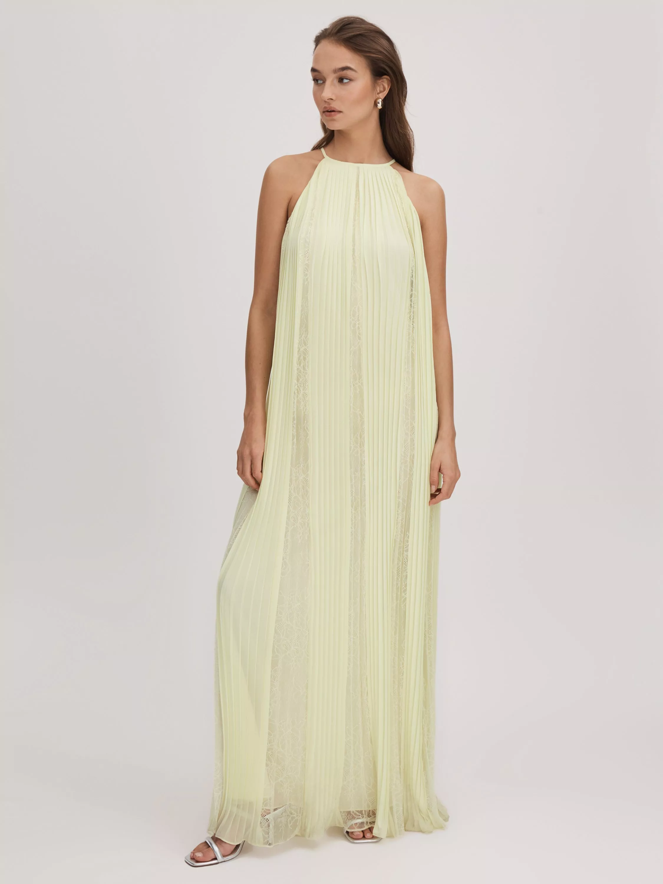 Beautifully draping down with pleat and lace panels, this maxi dress from FLORERE is topped with a high halter tie neckline. In a stunning pale yellow, it's a beautiful choice for special events and occasions.