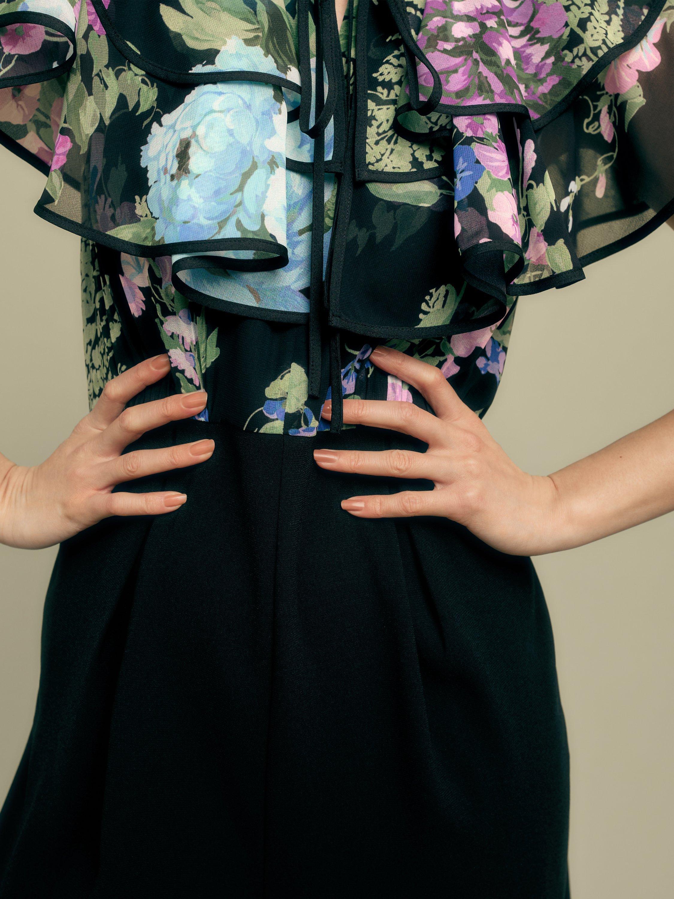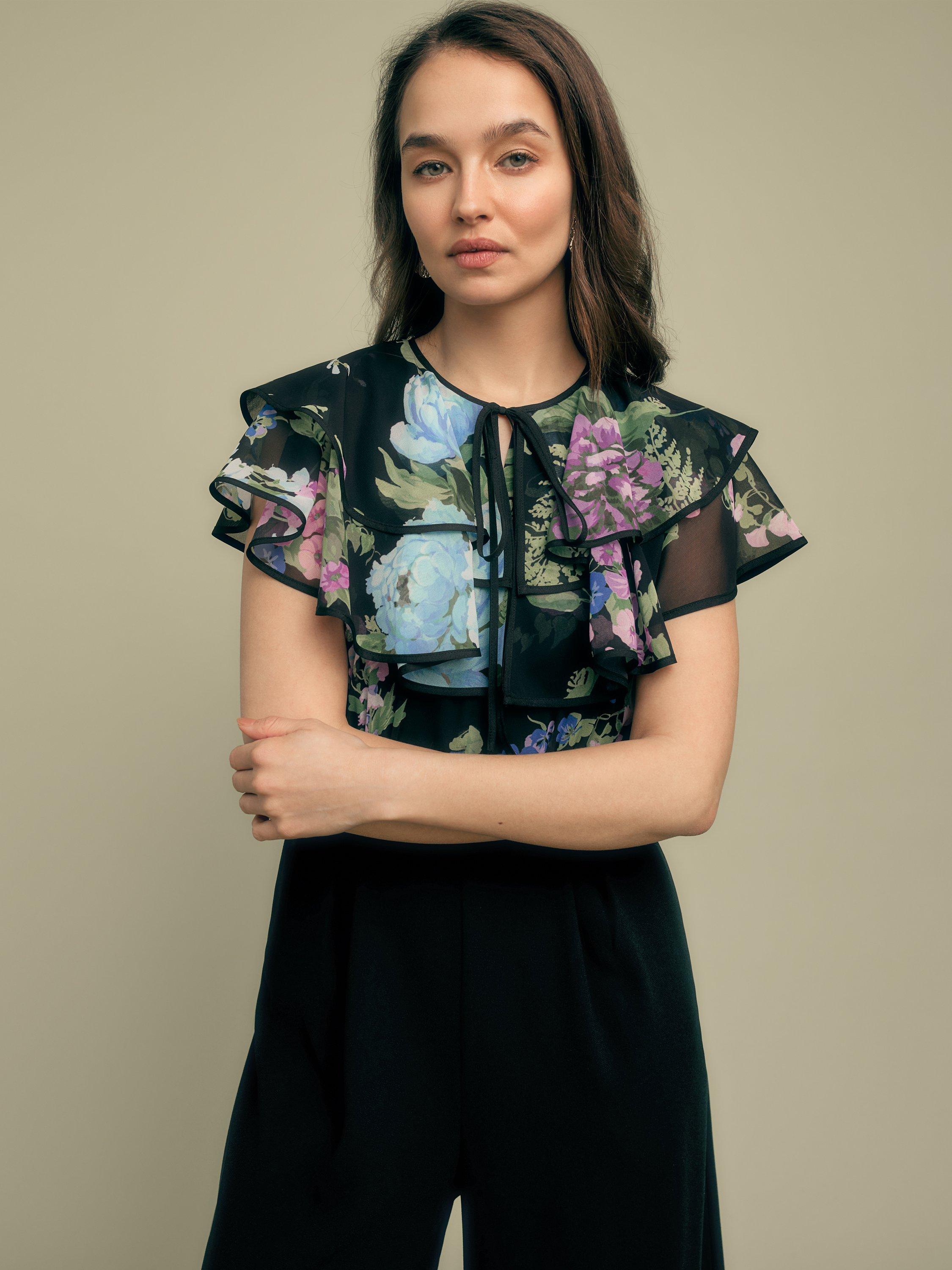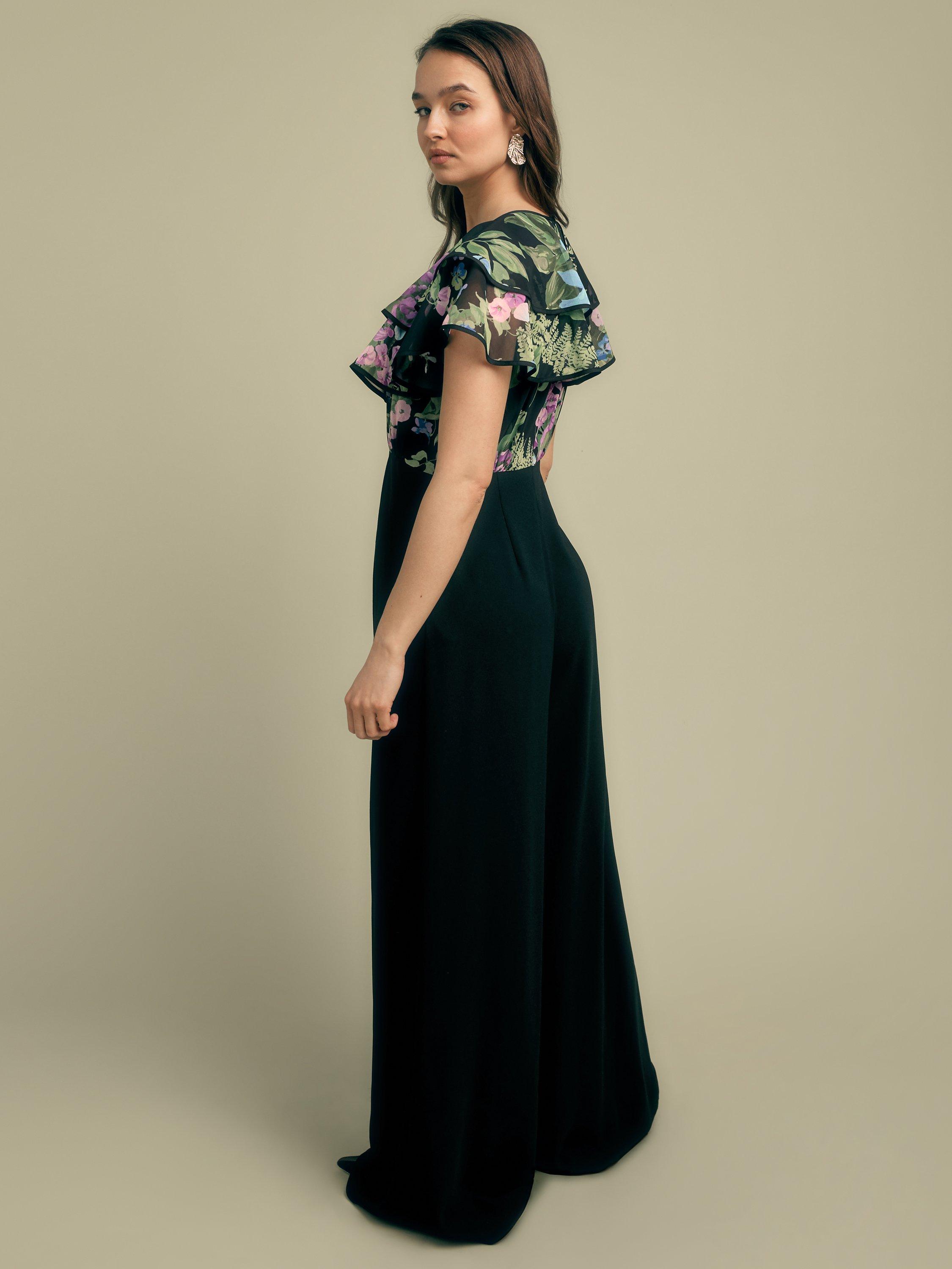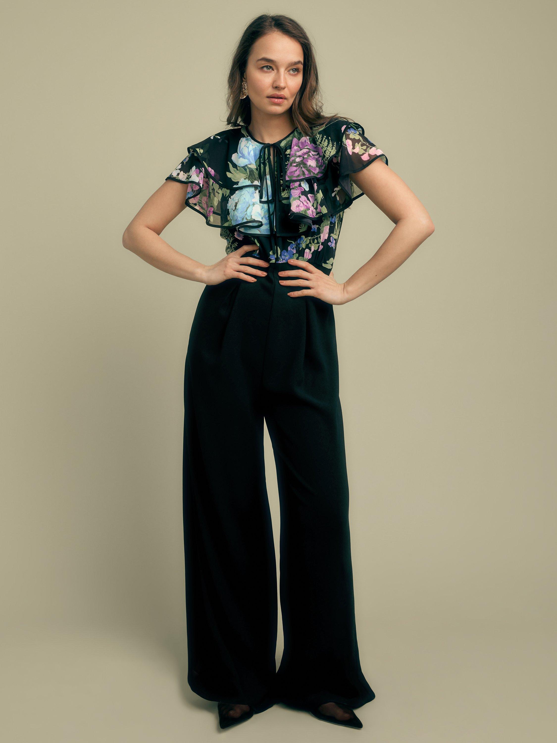 Romantic ruffles and a delicate tie neck combine with a wide leg crepe trouser to create the ultimate jumpsuit.