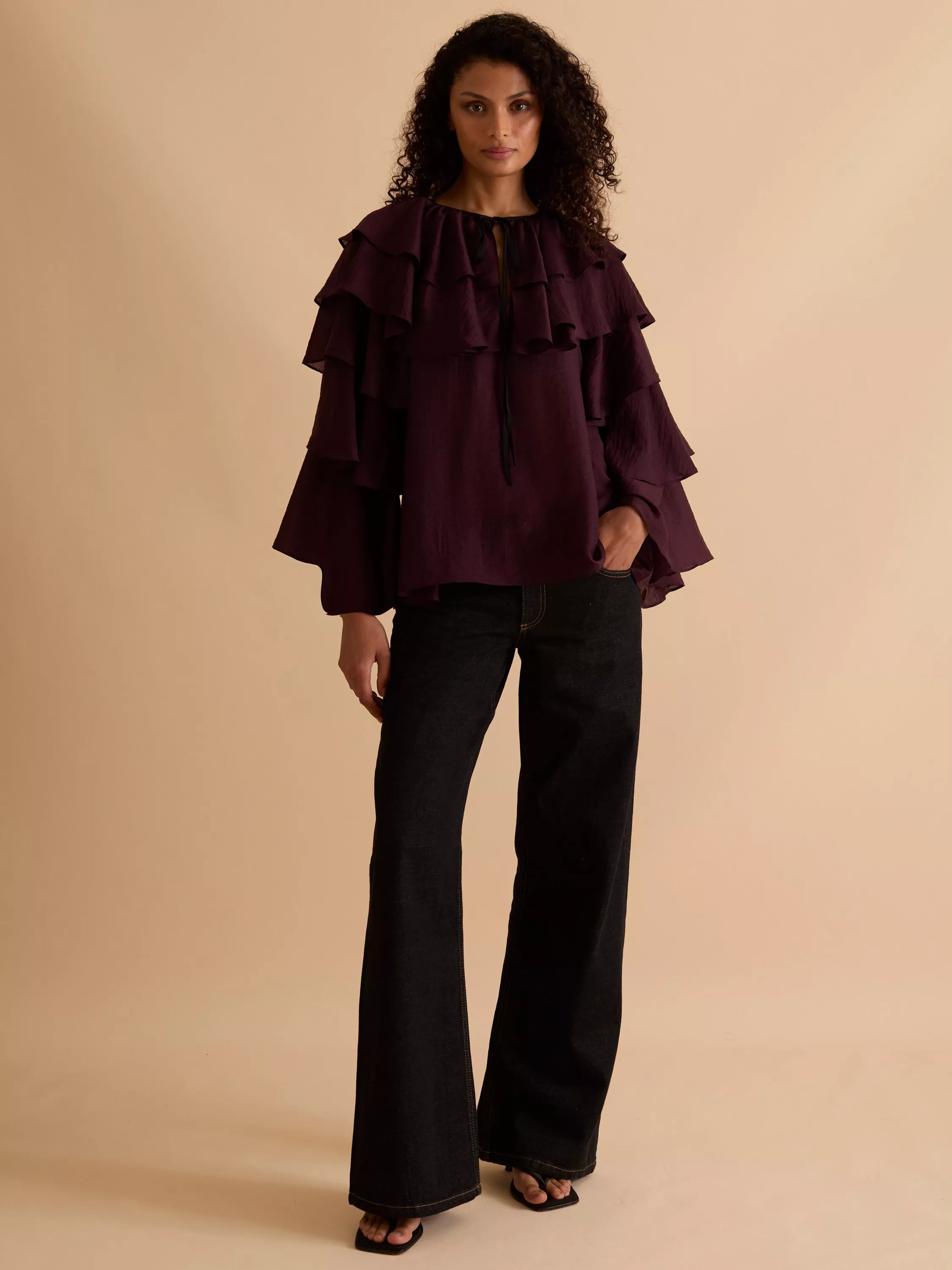 A dramatic ruffle neckline combines with tiered sleeves and a contrast neck tie.