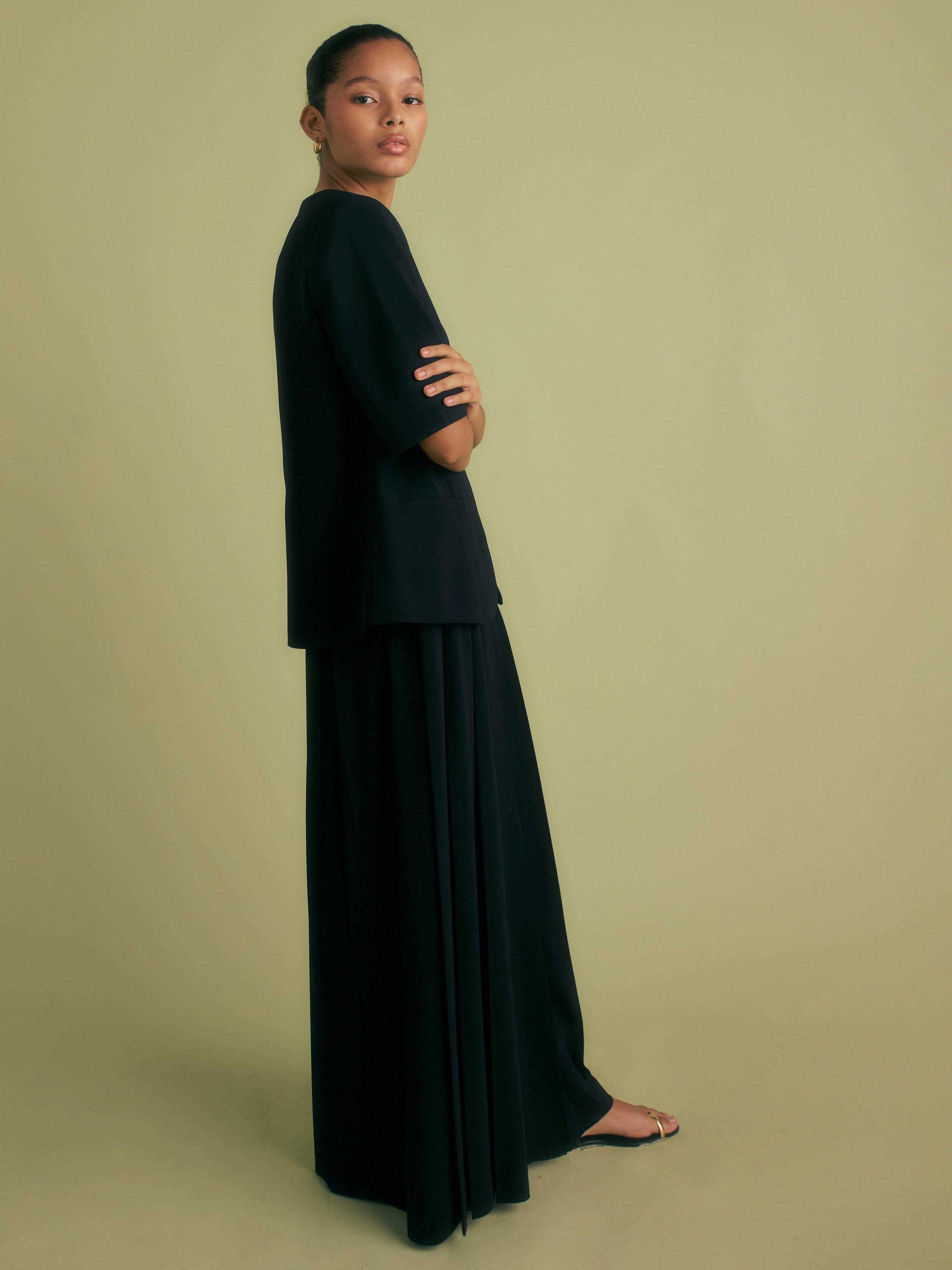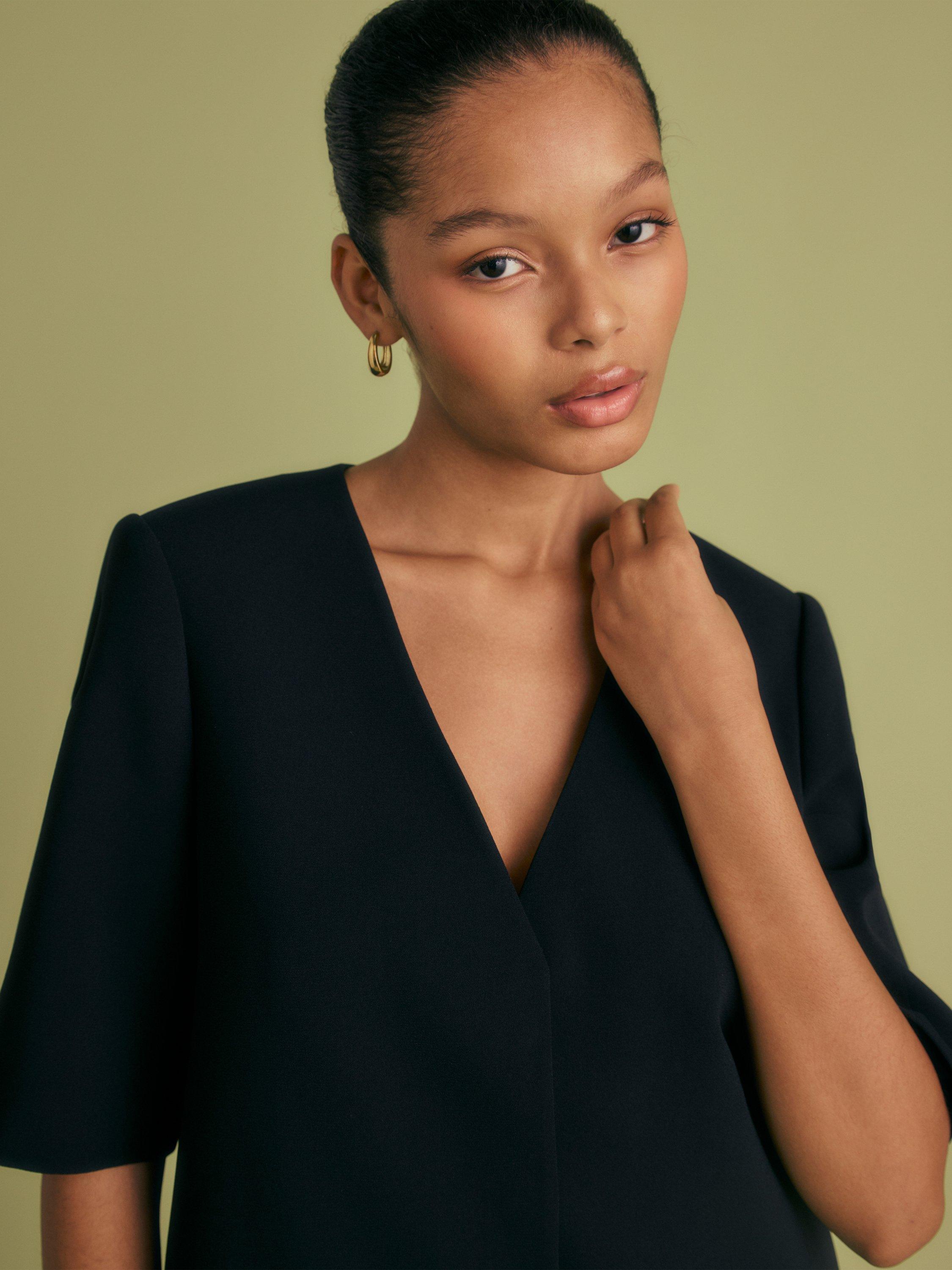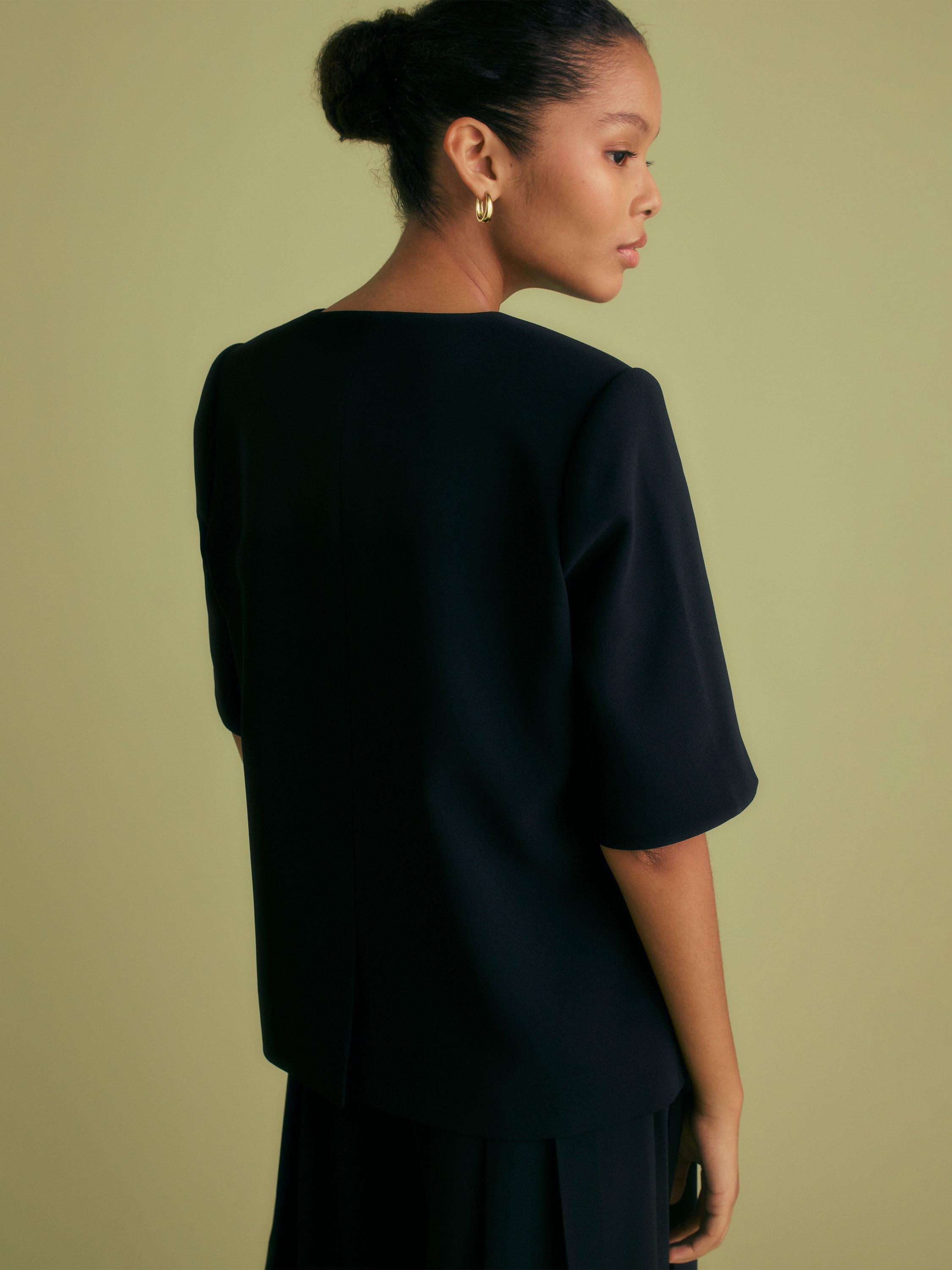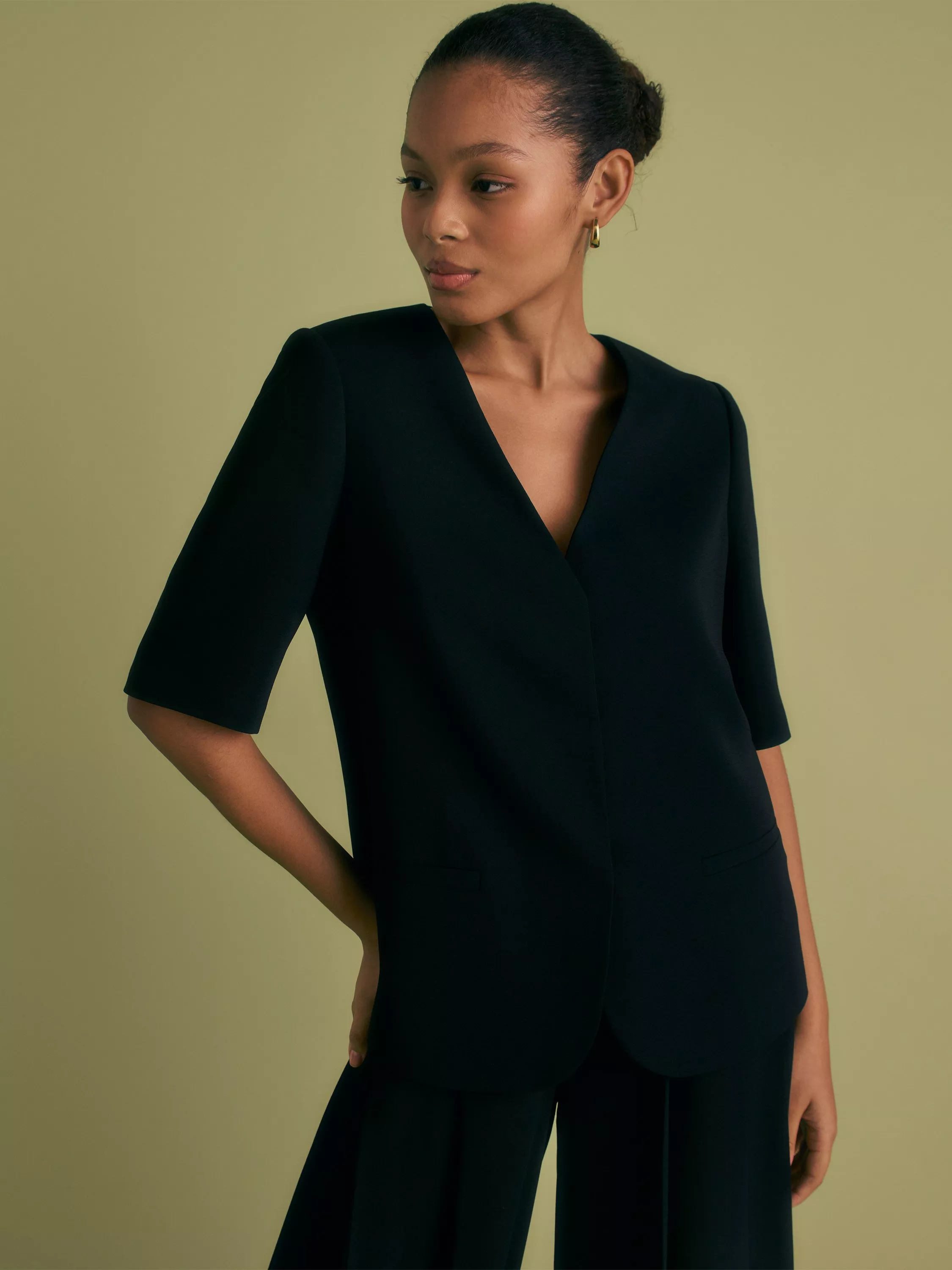 This collarless, short sleeved blazer offers a modern take on classic tailoring and is a perfect pairing with wide leg trousers.