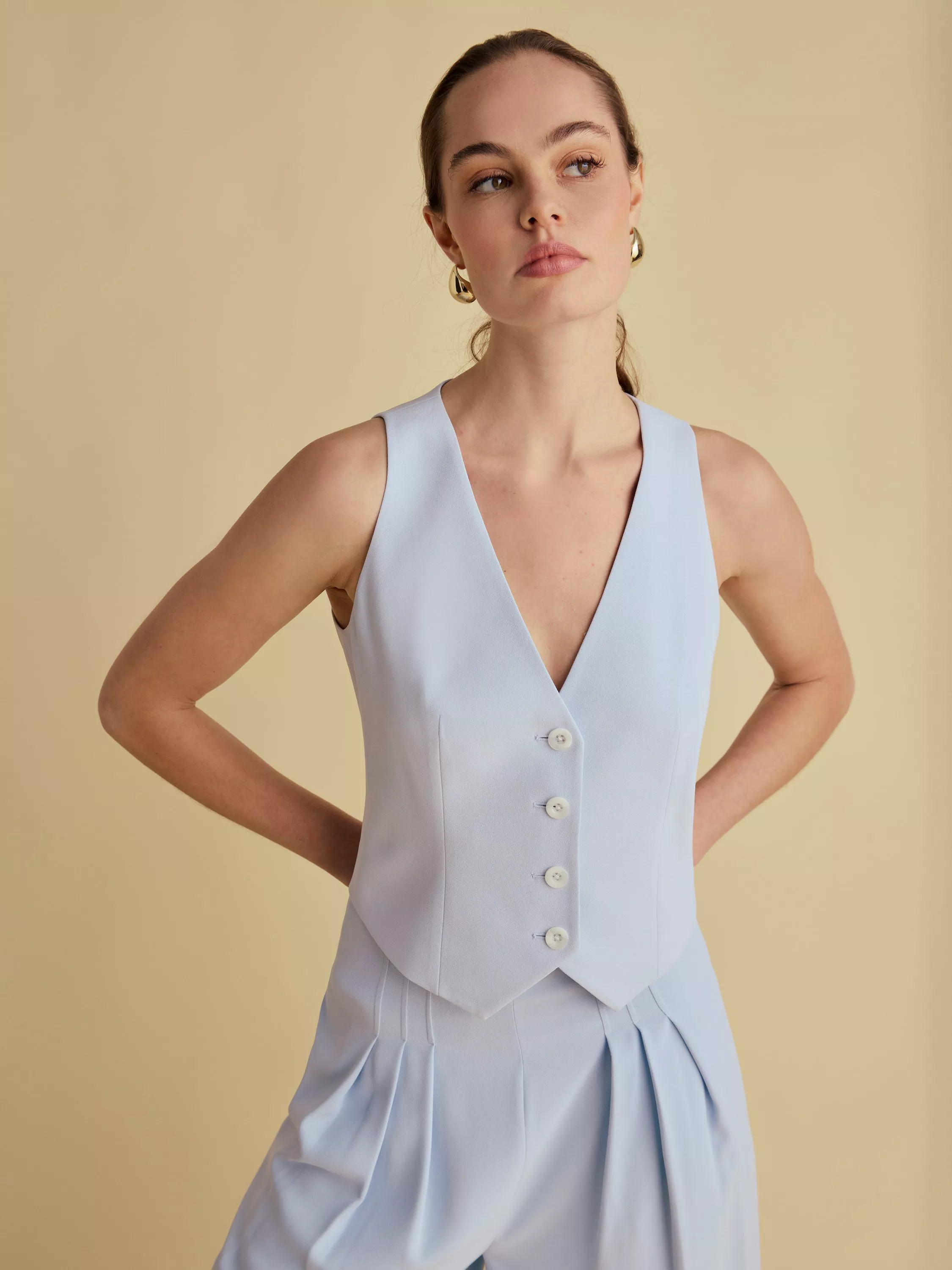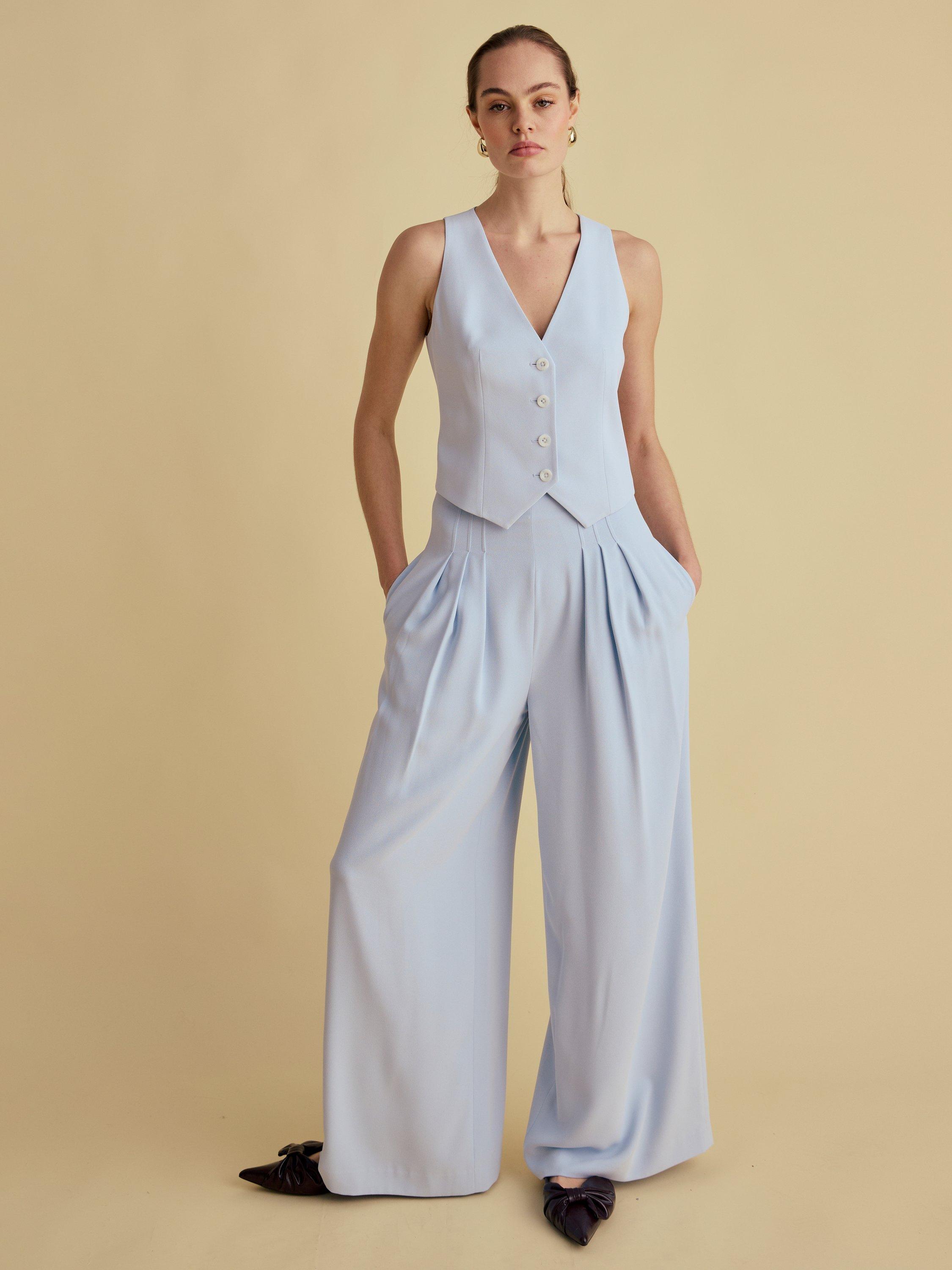 A modern twist on the waistcoat, this style is clean cut and in the perfect pale blue. Pair with High Waisted Wide Leg Trousers for the ultimate tailored look.