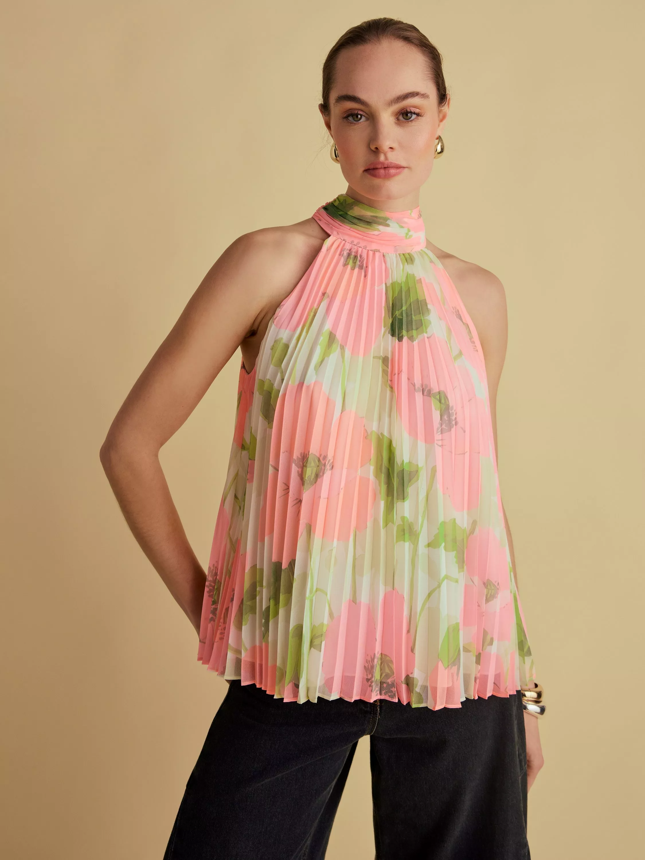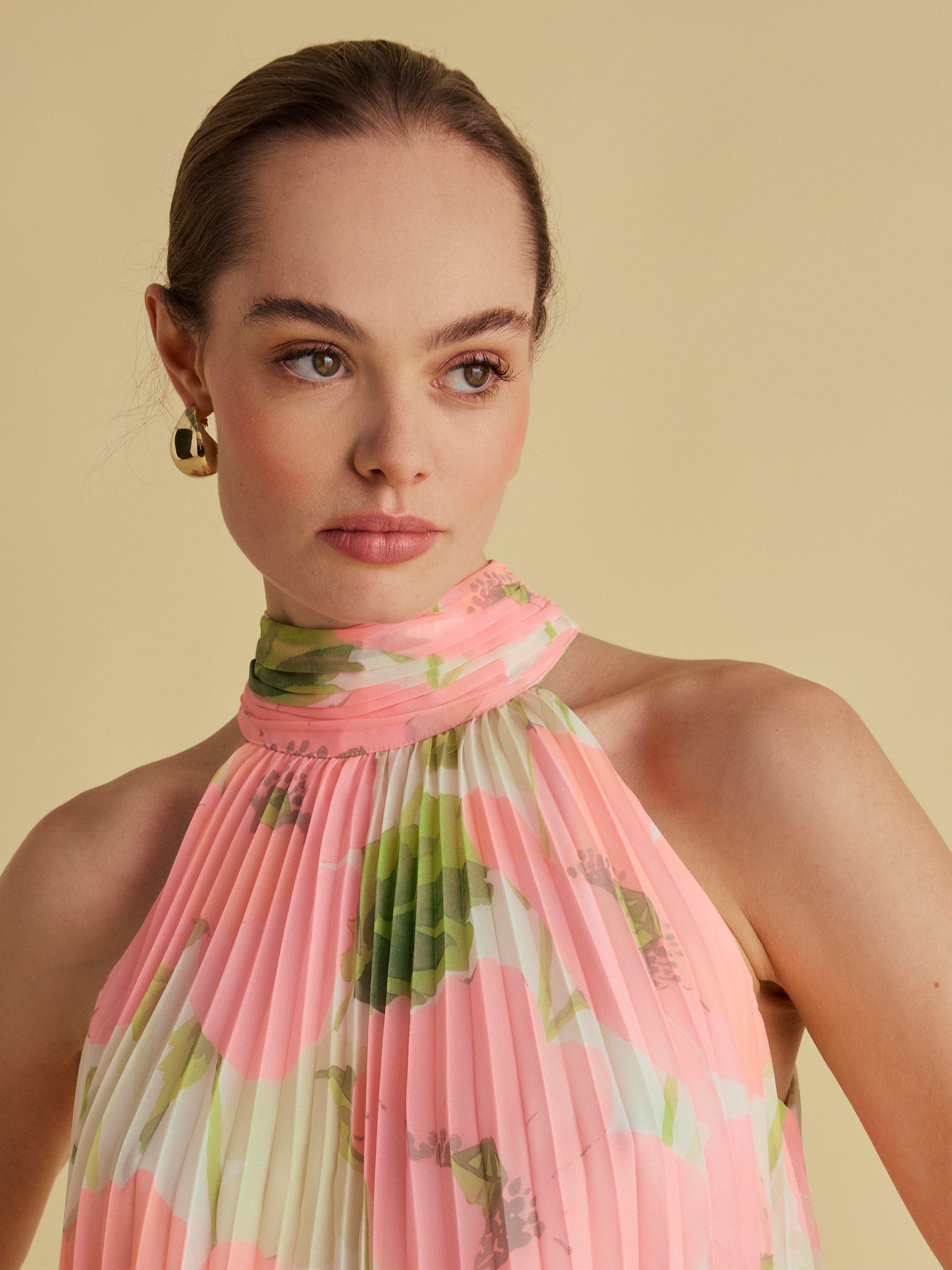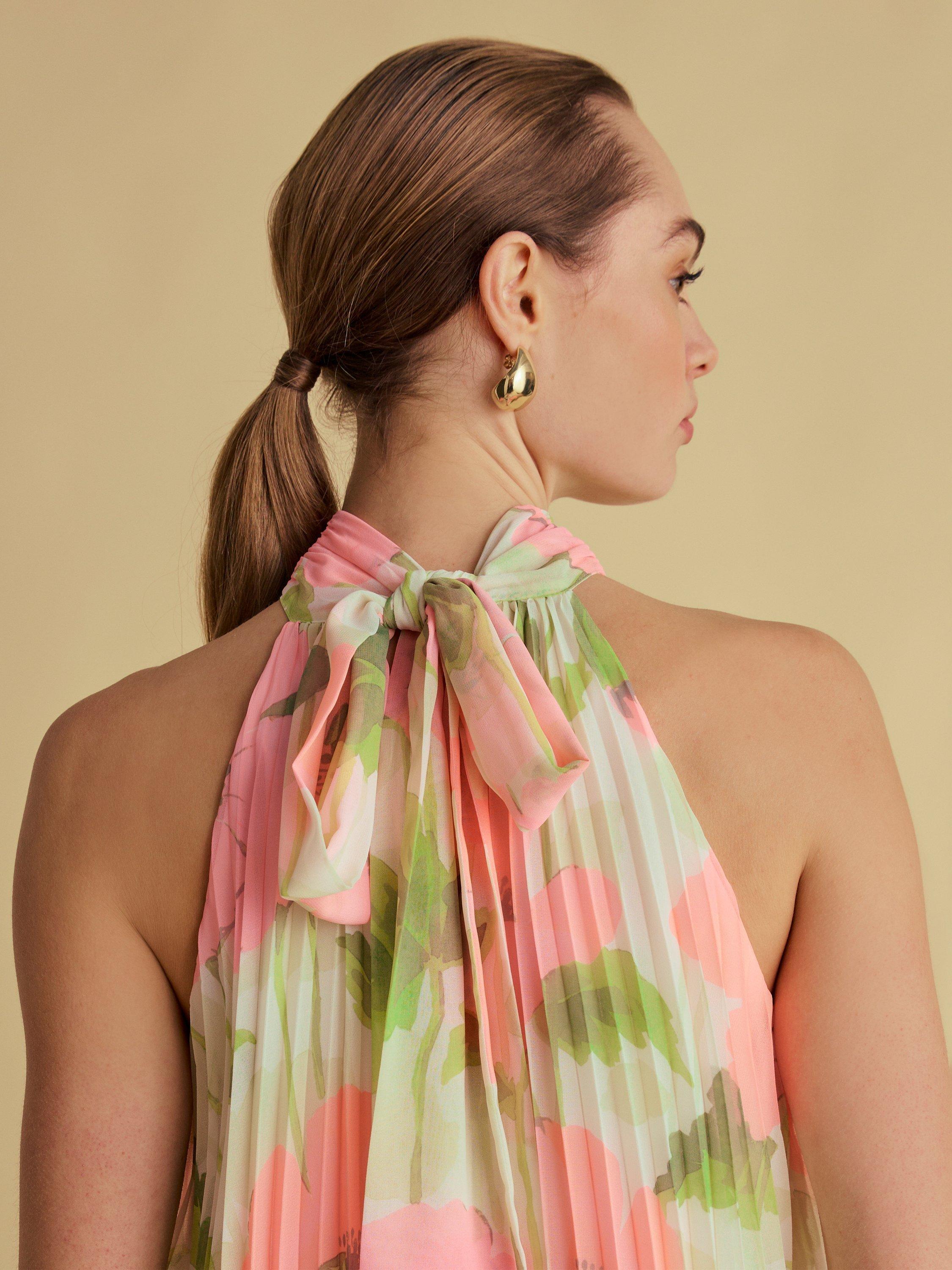 This pleated halterneck top with a tie back detail is the perfect showcase for a signature Florere floral print. Relaxed fit. Tie back. Fully lined. High neck.