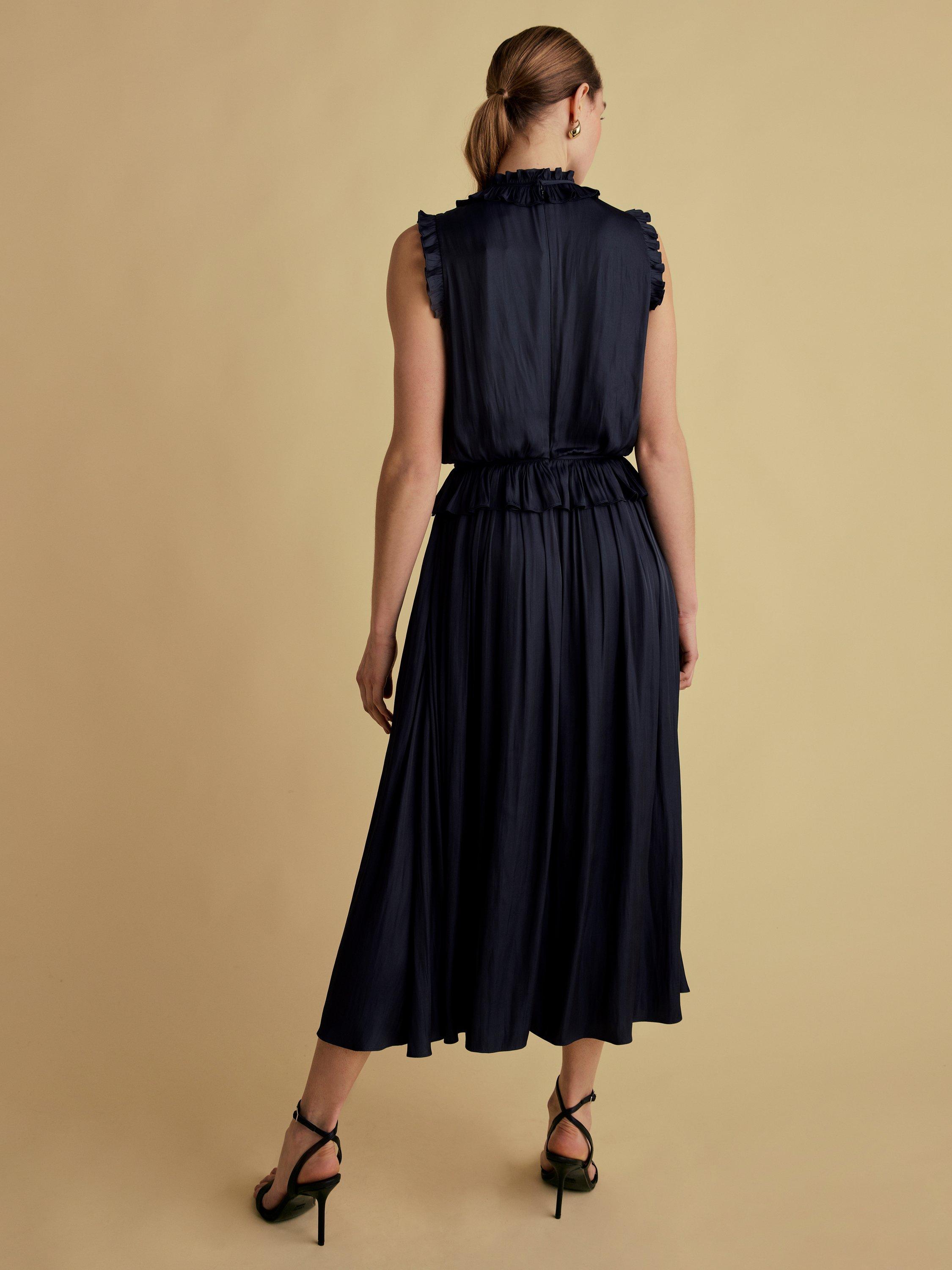 Delicate tie details and feminine frills are paired with a fluid navy satin fabric with a subtle sheen, to create effortless style.