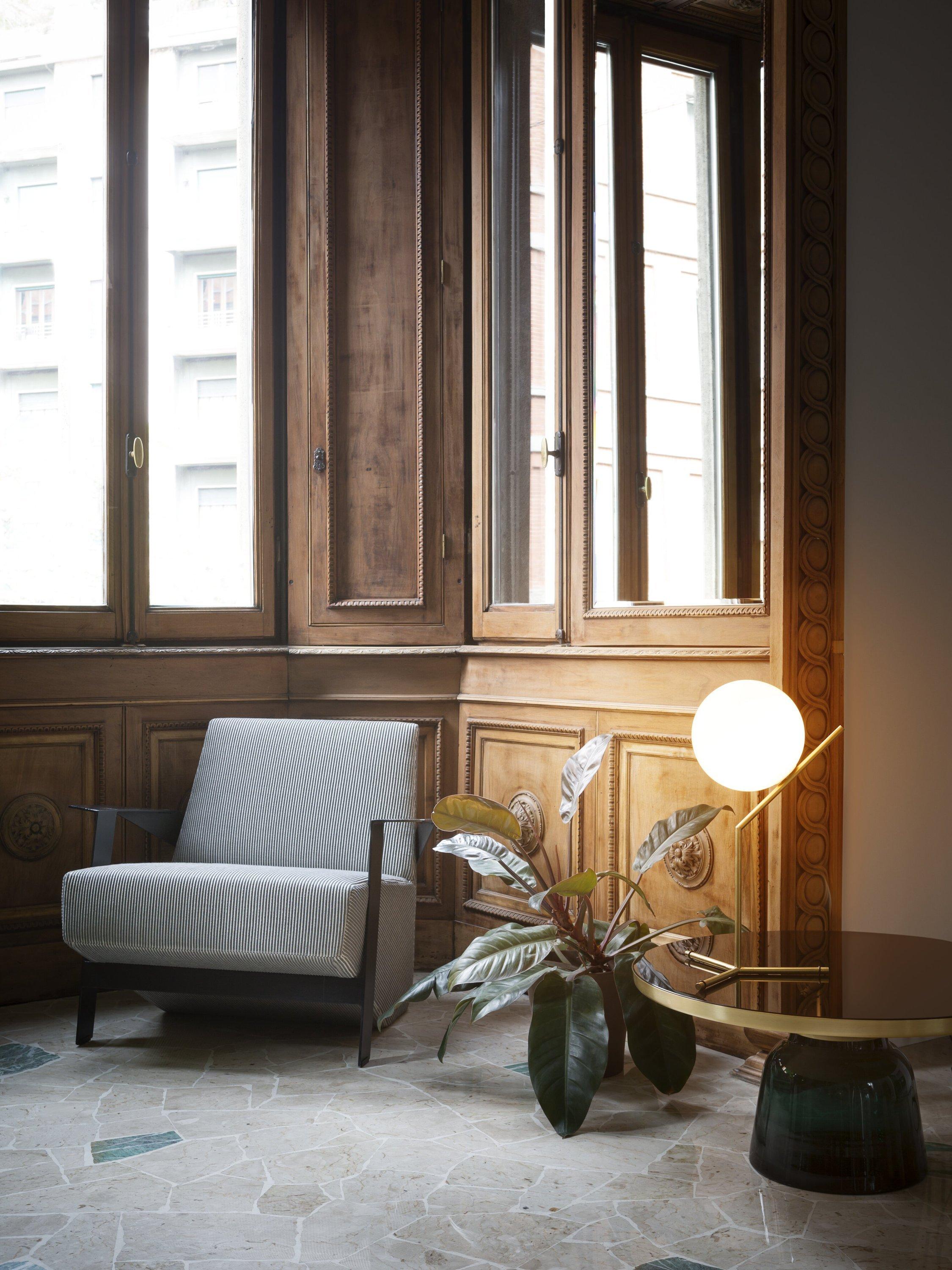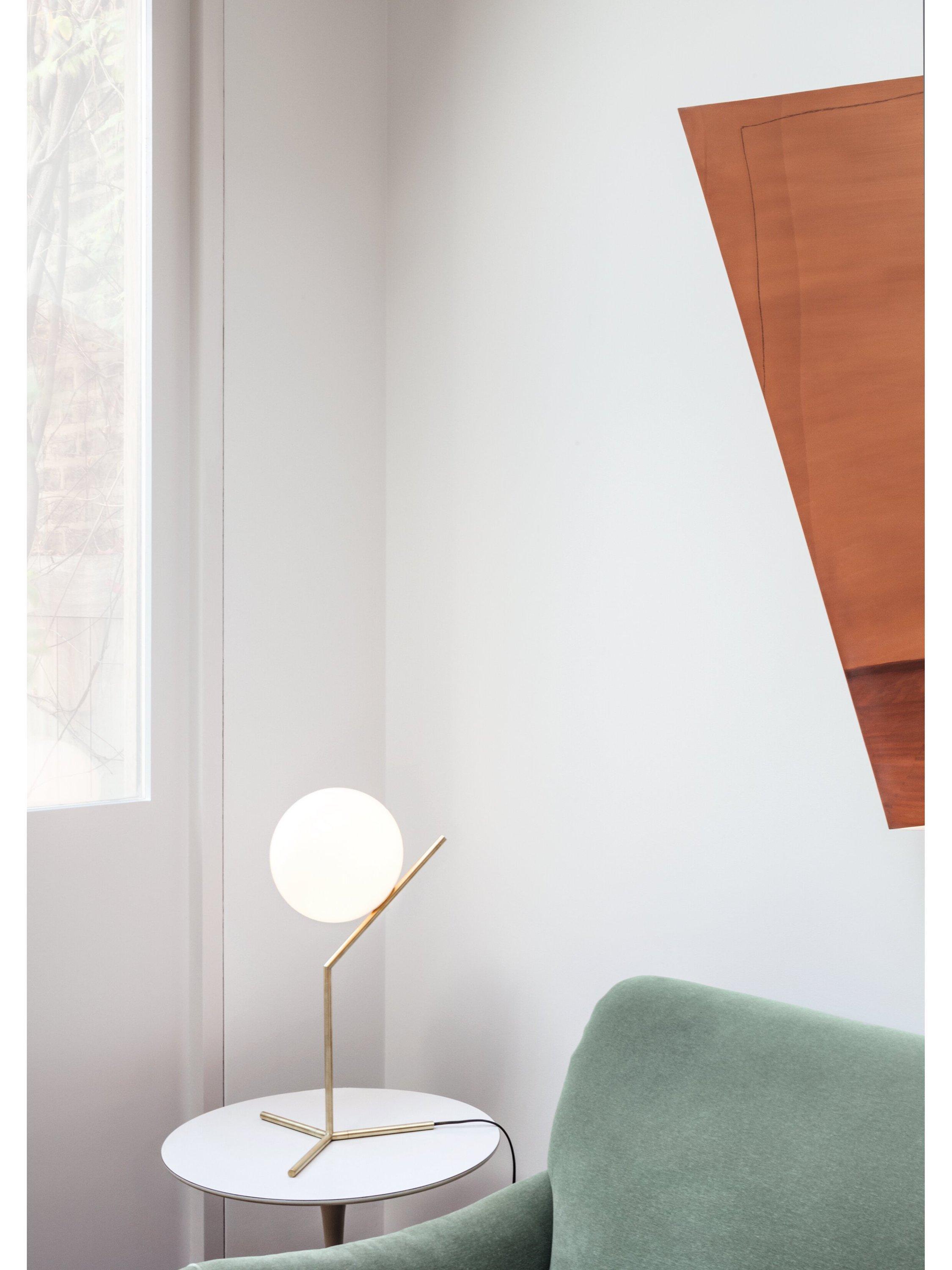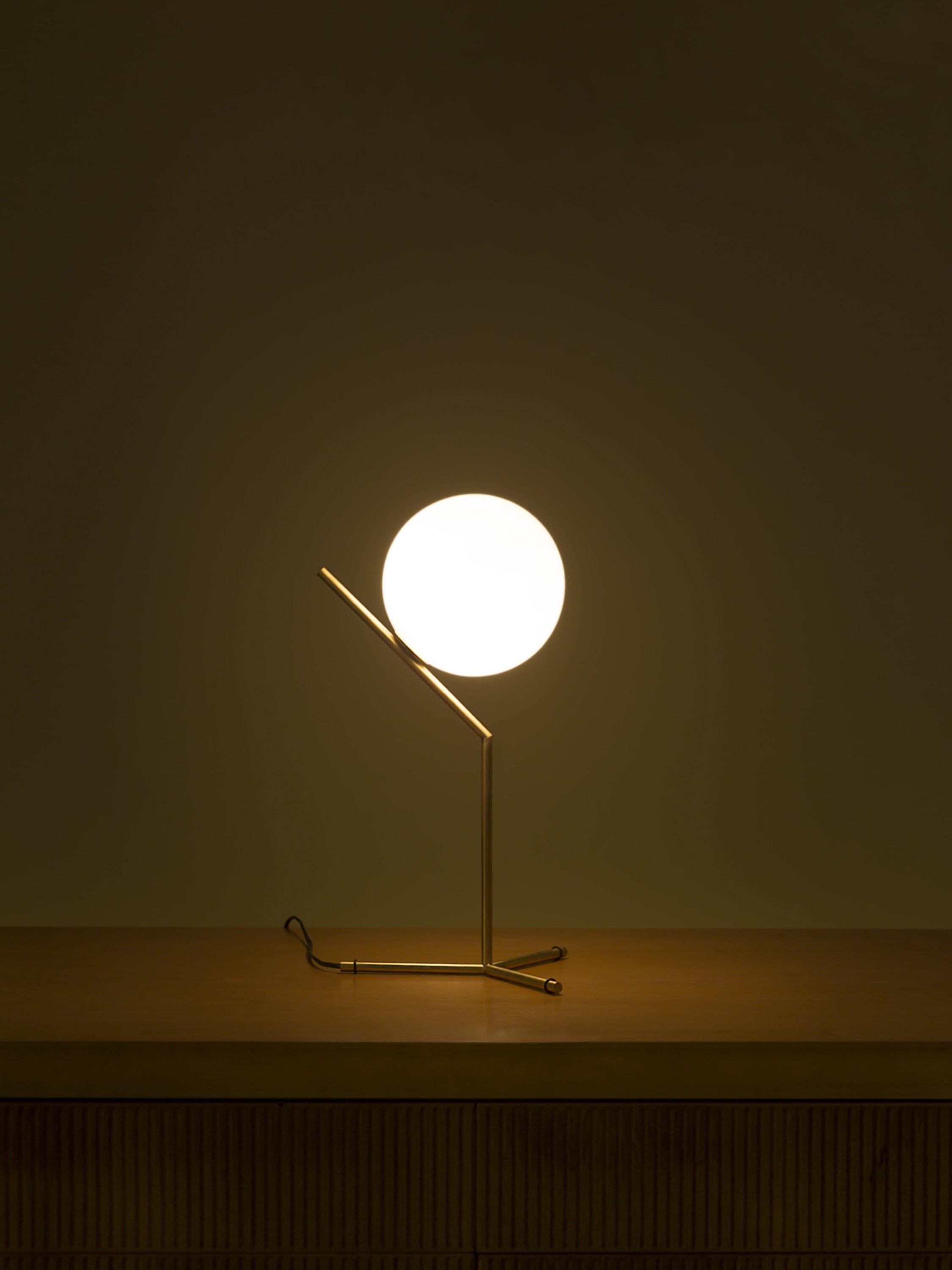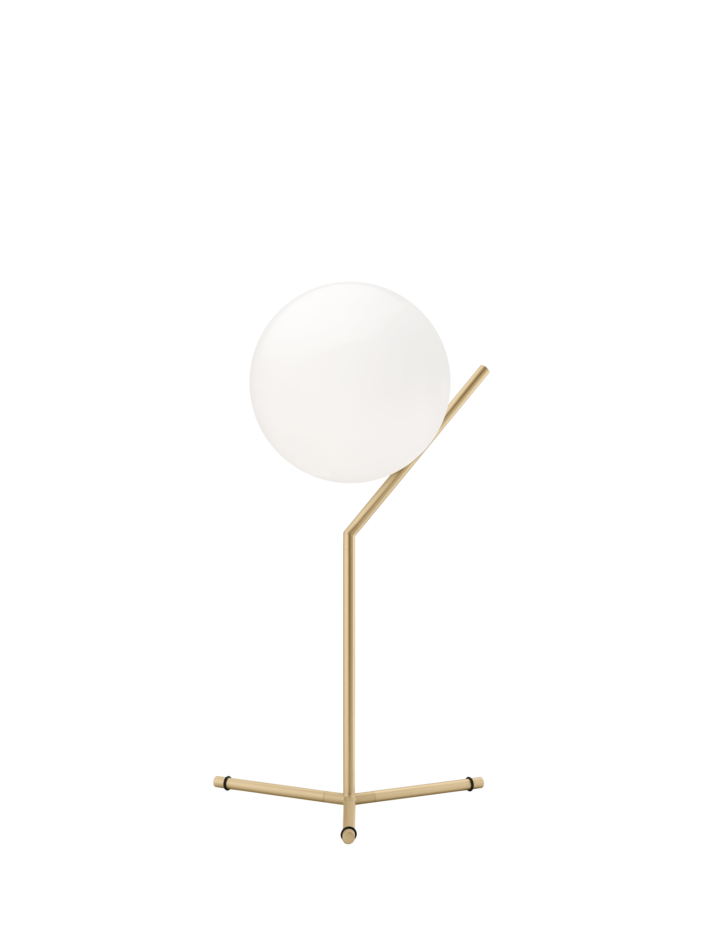 Dimmable table lamp providing diffused light. Designed with a frame and blown glass opal diffuser.