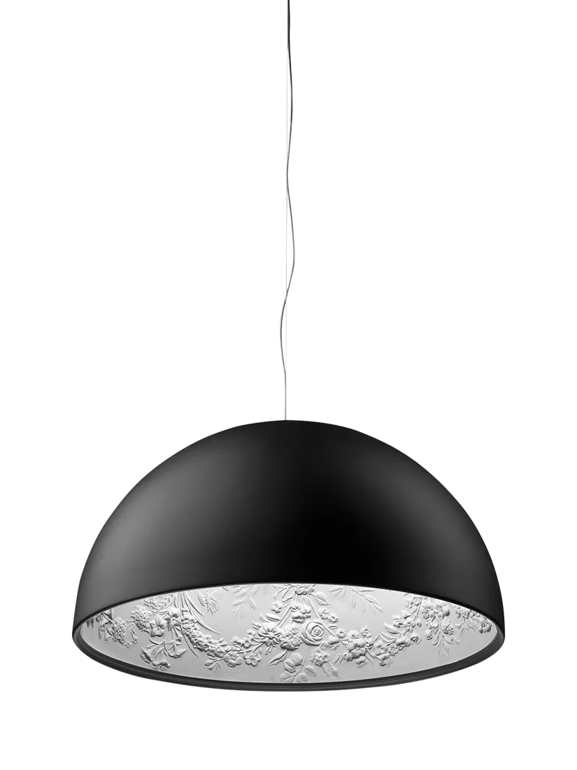 Suspended pendant providing diffused lighting. Made in Italy, the domed cast plaster diffuser features an intricate, textured floral pattern, painted white, which beautifully contrasts with the smooth shade exterior. The design combines traditional-style ceiling plaster work with modern lighting.