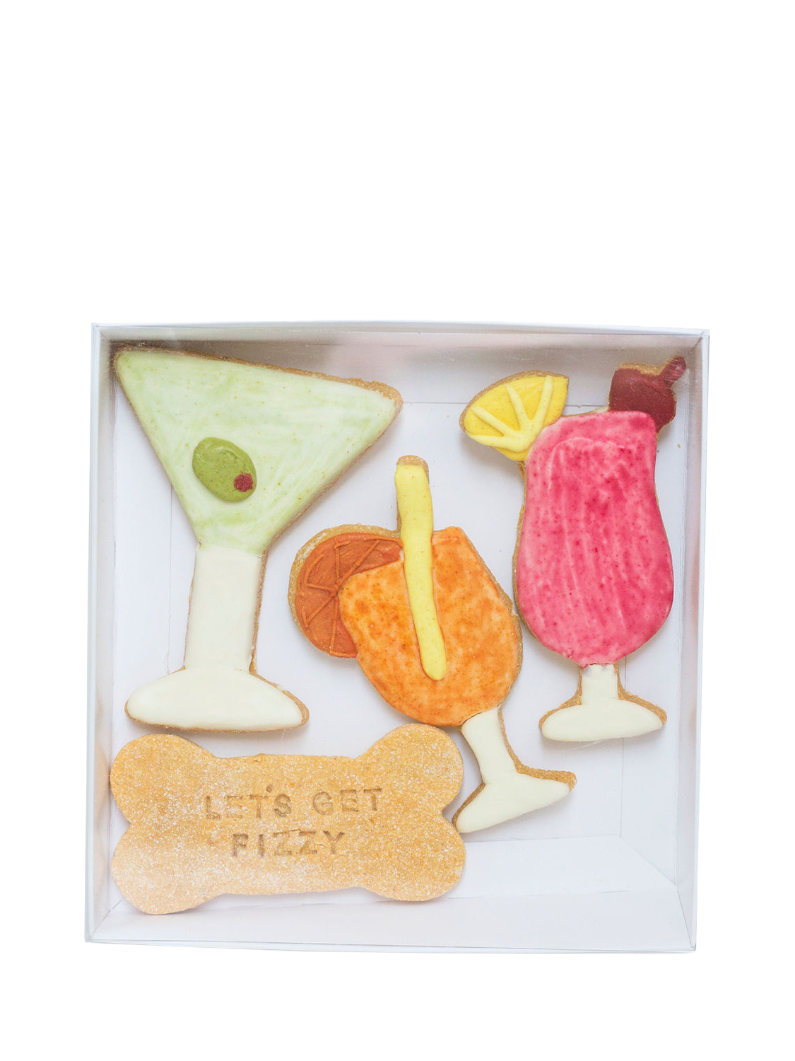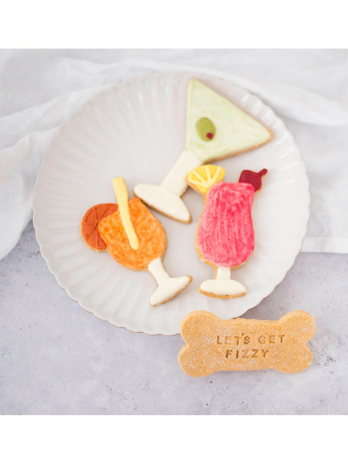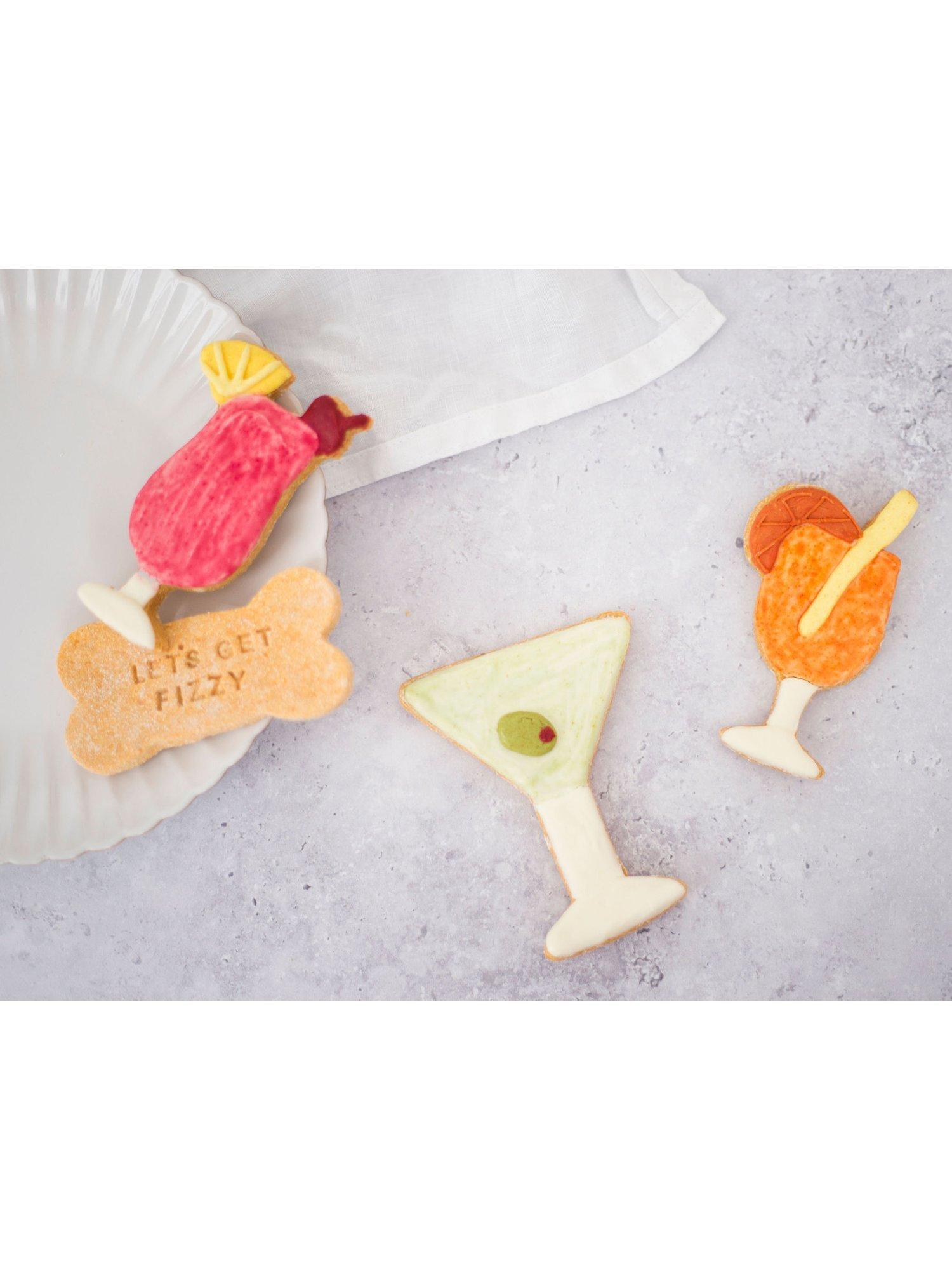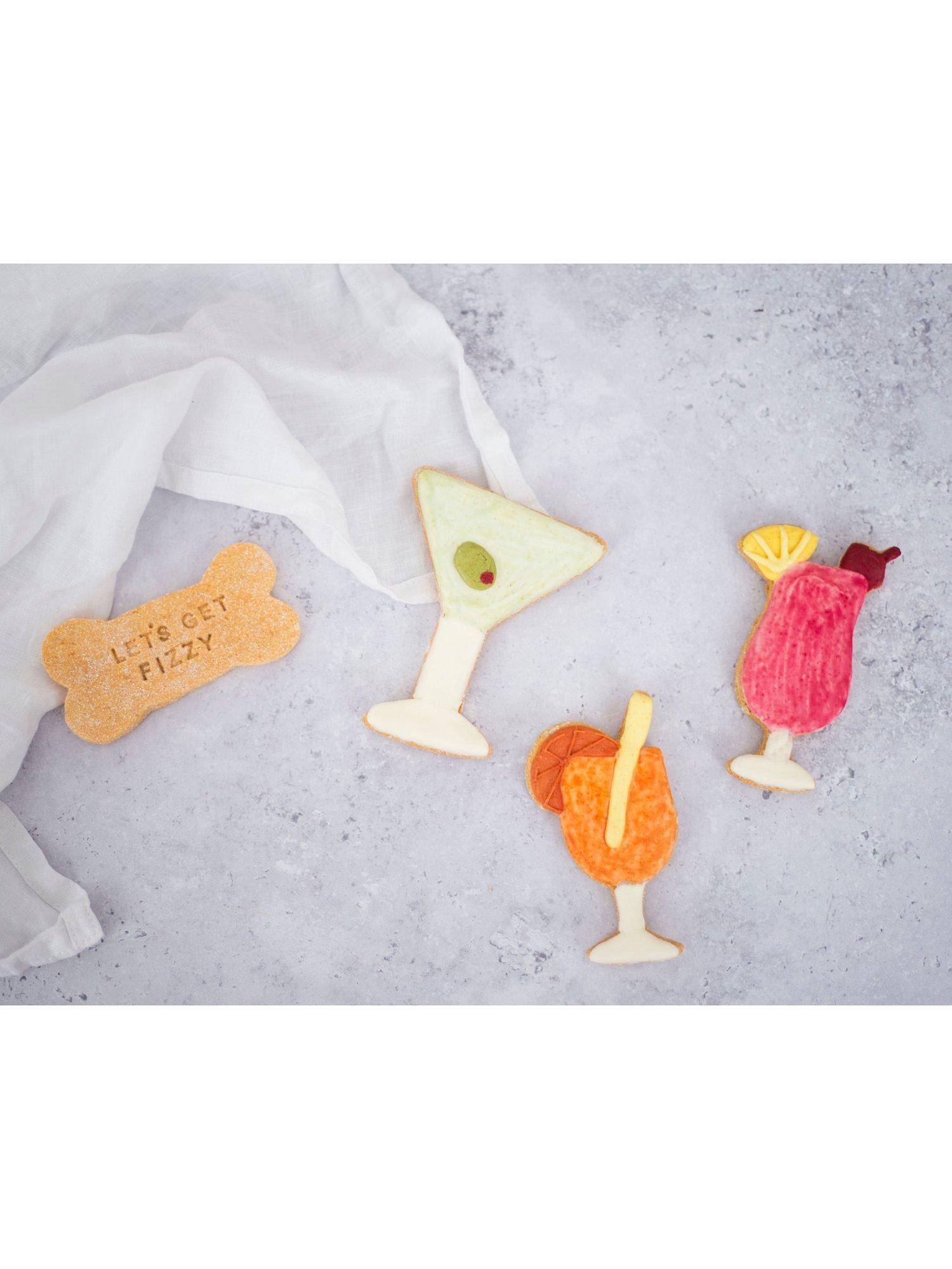 A playful collection inspired by classic cocktails. This set includes a martini, a spritz, a tropical cooler and a stamped bone biscuit to complete the theme. Each design is hand-iced using natural colours and a gentle grain-free dough. A fun treat for celebrations and gifting.