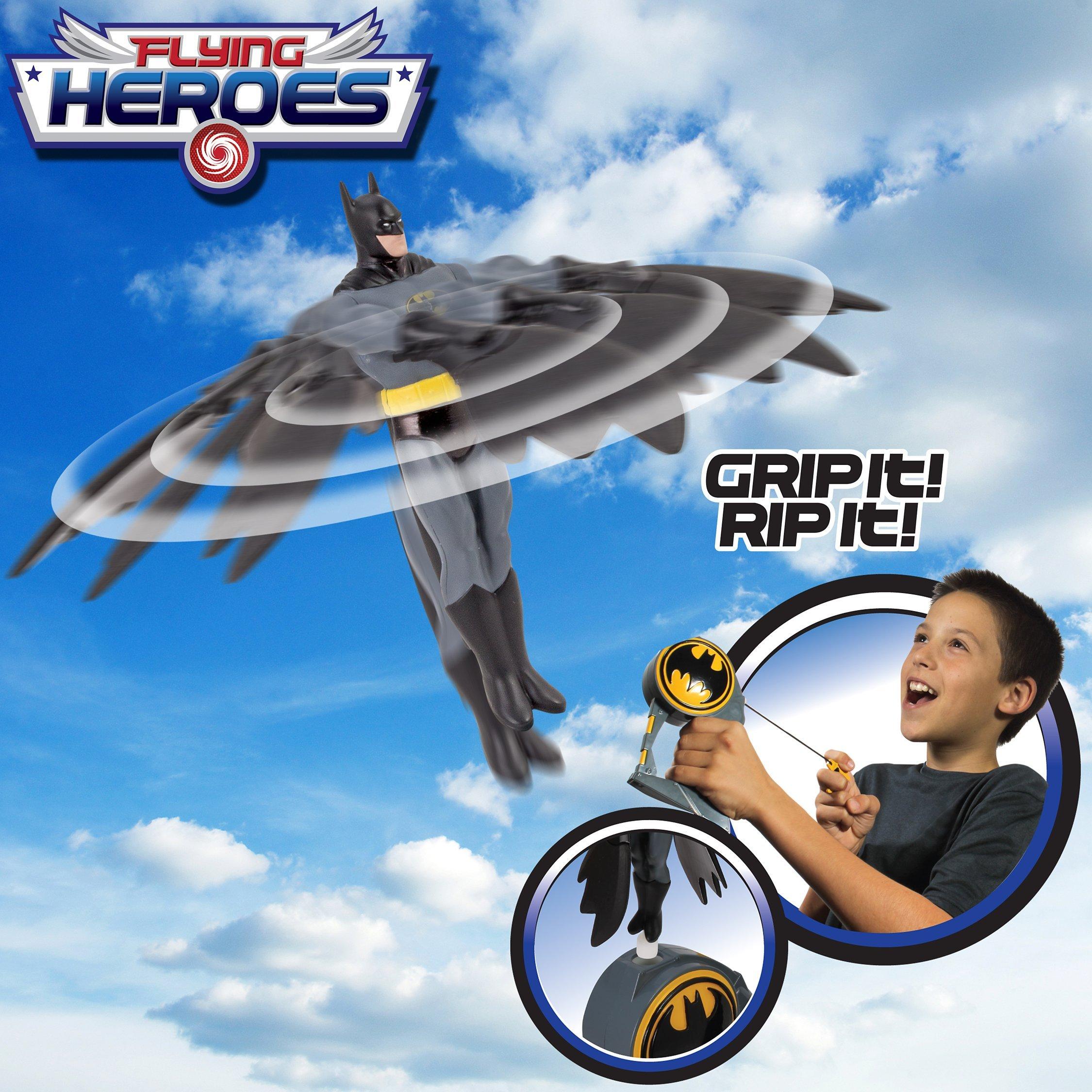 Take control of Batman and help him fight crime in Gotham City. Simply grip the handle then rip the cord back and launch your Batman hero high into the sky. The harder you pull the cord, the faster he will spin and the higher he flies.