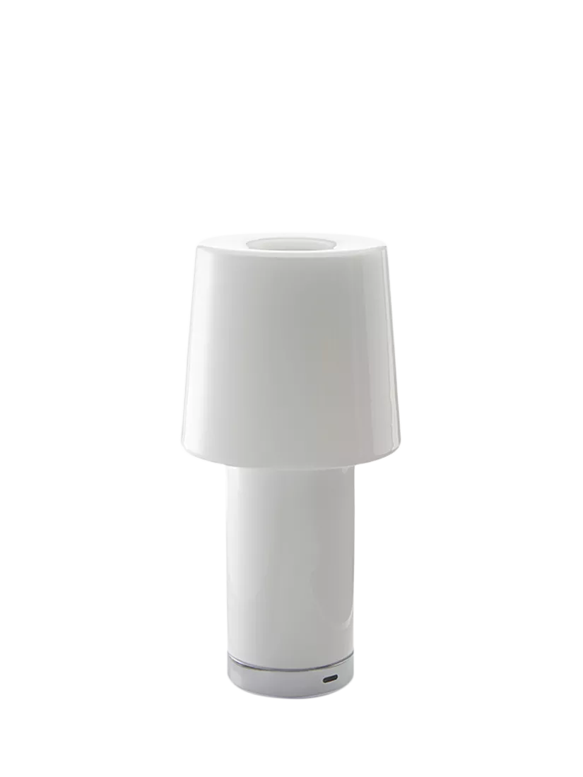 Designed in 2023 by Claesson Koivisto Rune, Cameo is a rechargeable table lamp made of blown glass. A transparent touch button allows for switching on and off and adjusting the light intensity. The lamp is powered by an eight hour battery and is rechargeable via a cable with USB plug, included in the box.