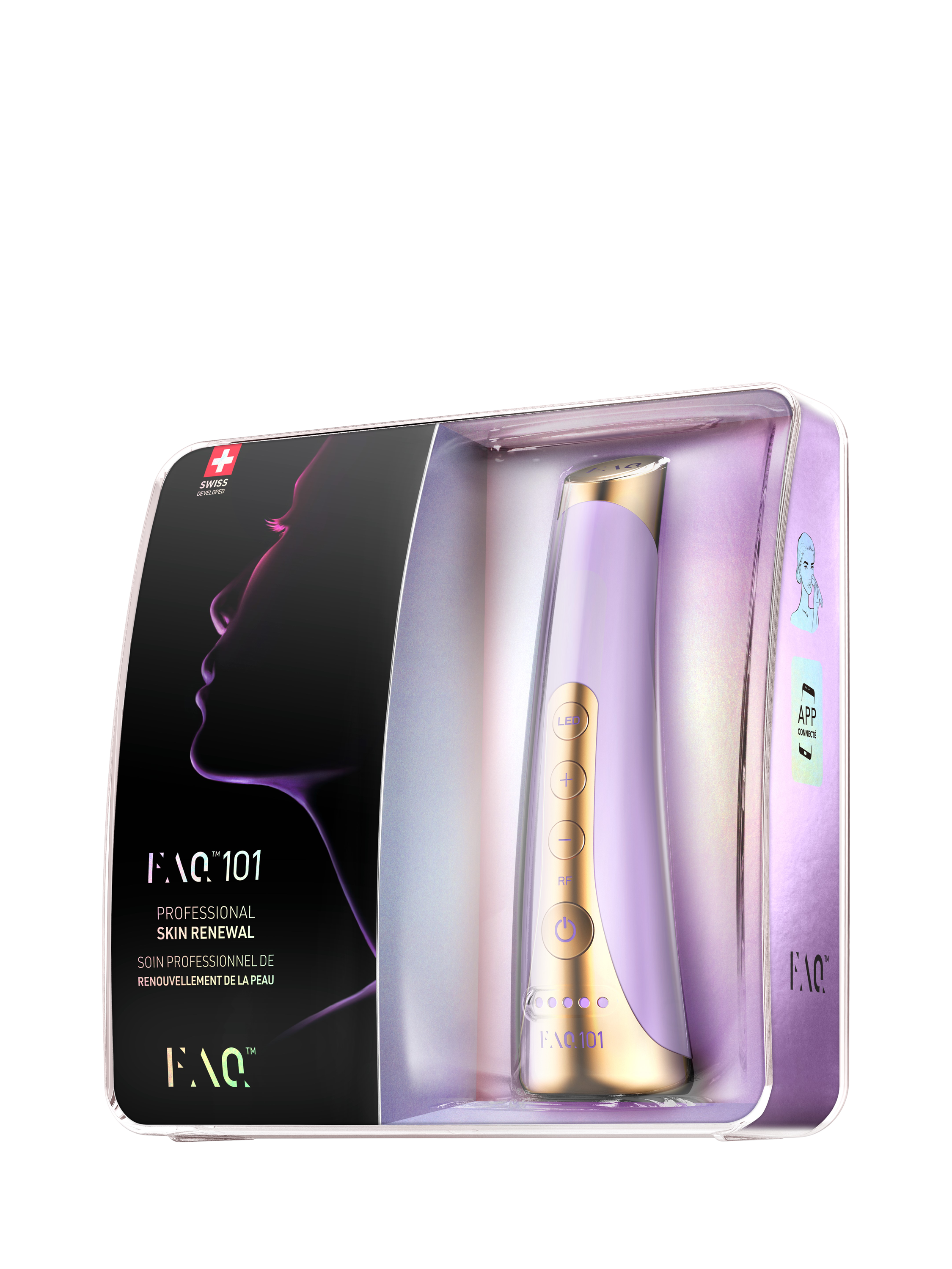 Step into the exciting, unexplored areas of contemporary facial tech fusions, ushering in a new era of clinical-grade anti-ageing. The FAQ™ 101 is an ideal entry into the power-RF & LED-pulse professional rejuvenating treatments at home, featuring heated radiofrequency waves & pulsed red, green & blue LED lights that merge with the now iconic T-Sonic™ pulsations. Premium technologies - enclosed in a sleek, easy-to-use, ergonomic, ultra-hygienic silicone device - ensure a tighter, glowing, instantly V-sculpted complexion in just minutes per day.