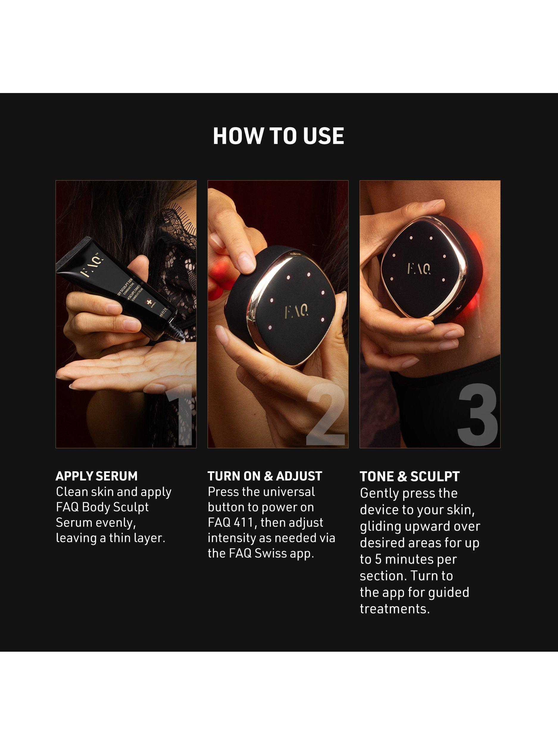 Our recommendation: Microcurrent devices like FAQ™ 411 must be used with a conductive primer. For optimal results, we recommend using FAQ™ Body Sculpt Serum.