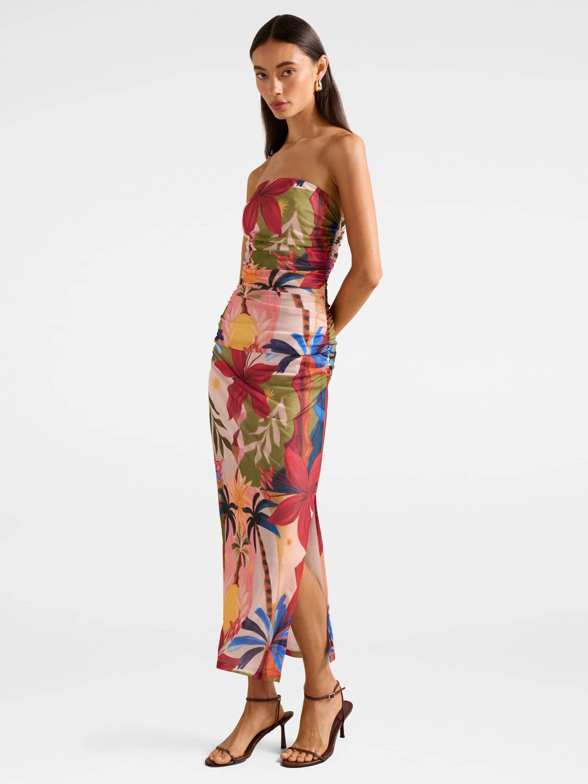 This strapless midi sheath dress features a bandeau neckline and slim fit, making it ideal for sunny days. The lively floral and leaf pattern brings fresh energy to your look, while subtle stretch lining keeps you comfortable.