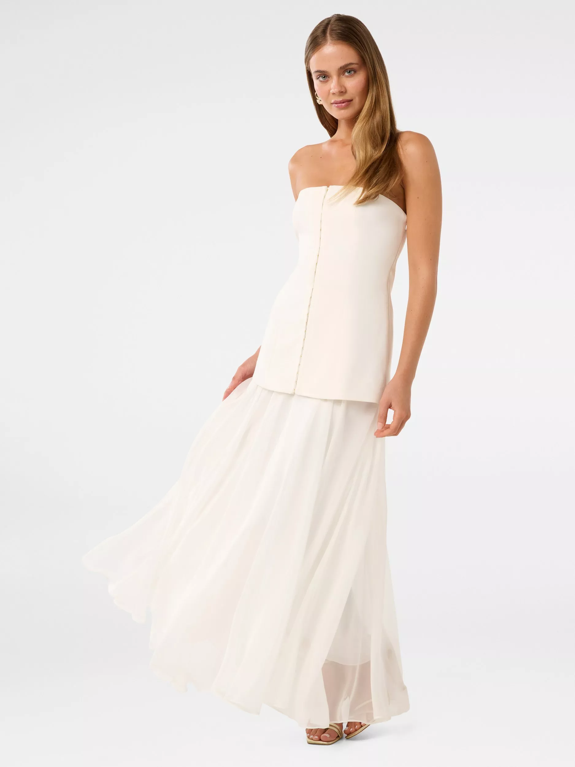 With a form-fitting bodice and a floaty tulle underskirt, this maxi dress from Forever New is topped with a bandeau neckline.