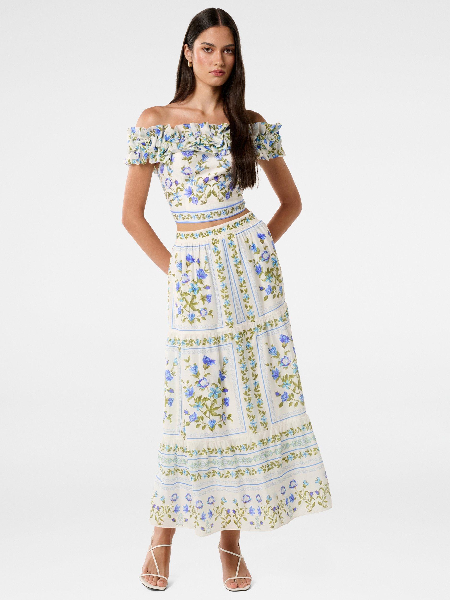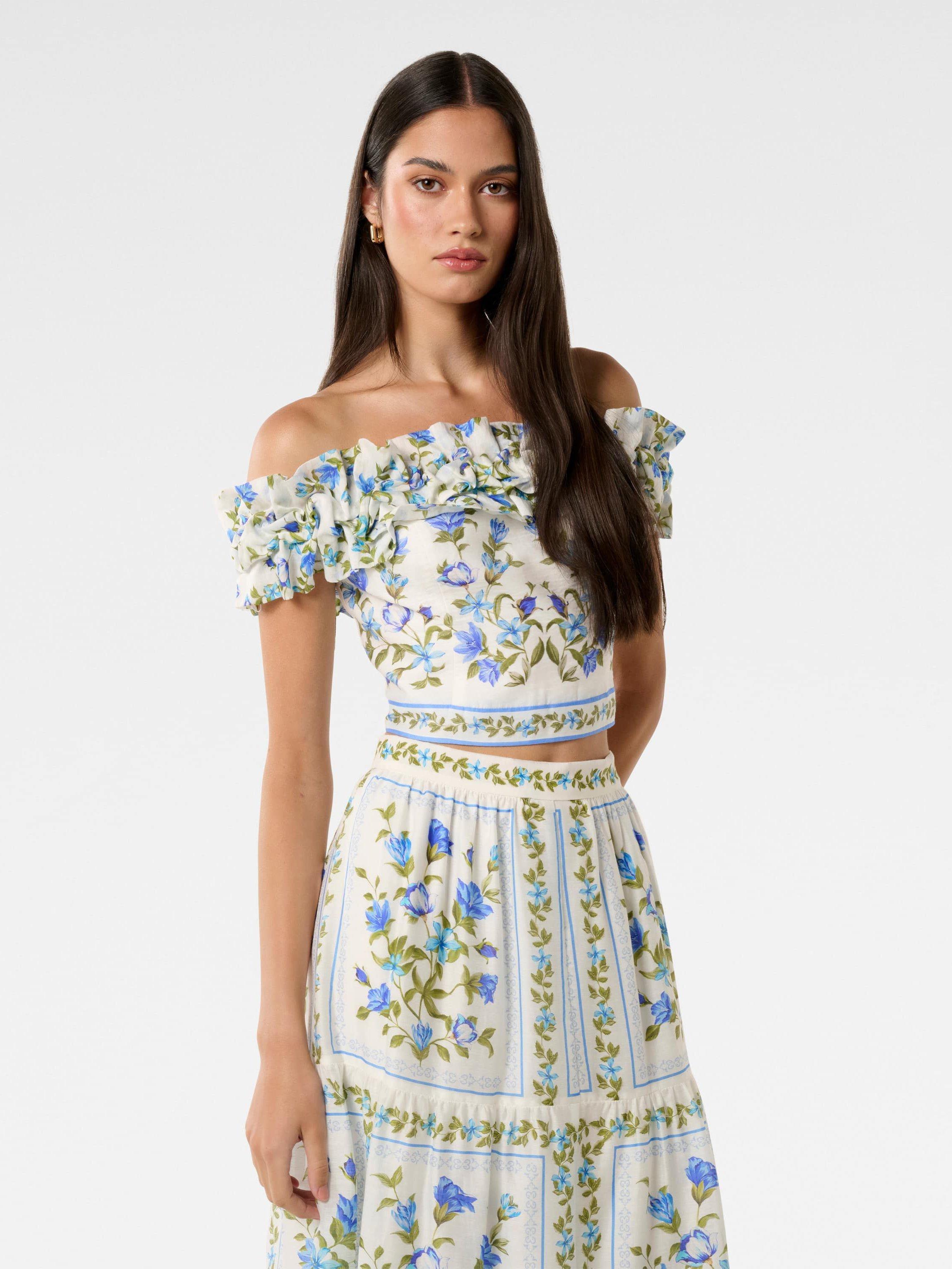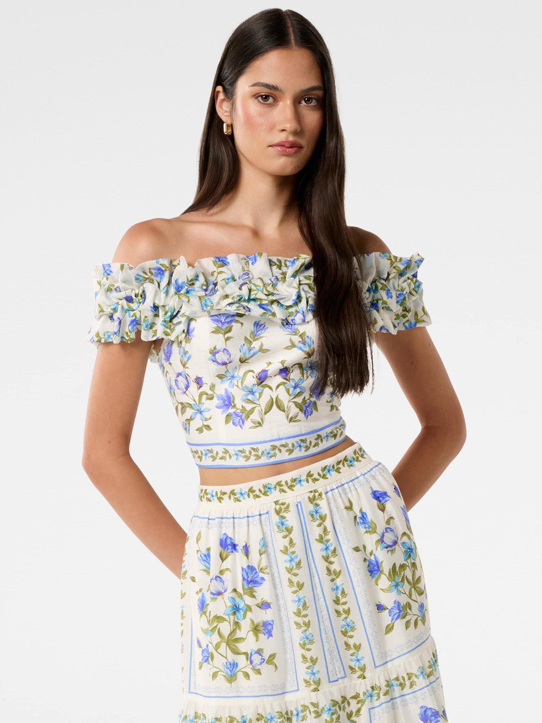 In an off-the-shoulder bardot silhouette, this short sleeve crop top from Forever New is doused in florals and is lightweight and breathable in a linen blend.