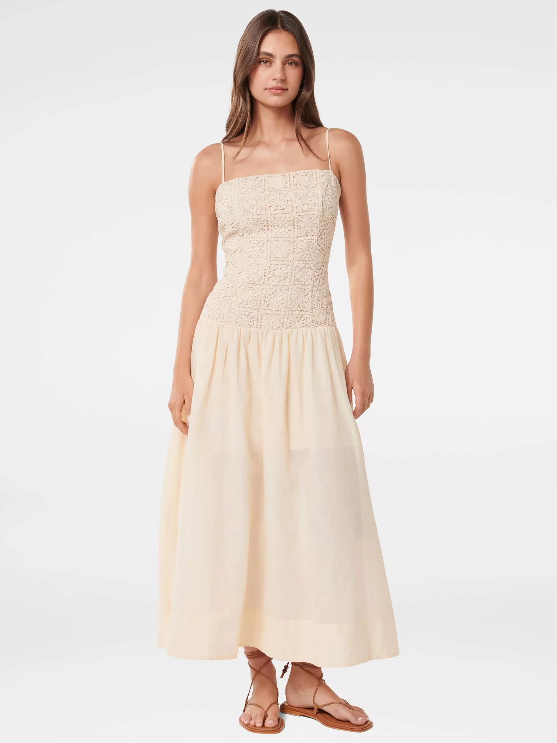 With a fitted crochet bodice that falls into a dropped waist with a full and floaty skirt, this midi dress from Forever New is blended with cotton. Topped with an open neck, this strappy style is the epitome of effortless summer charm.