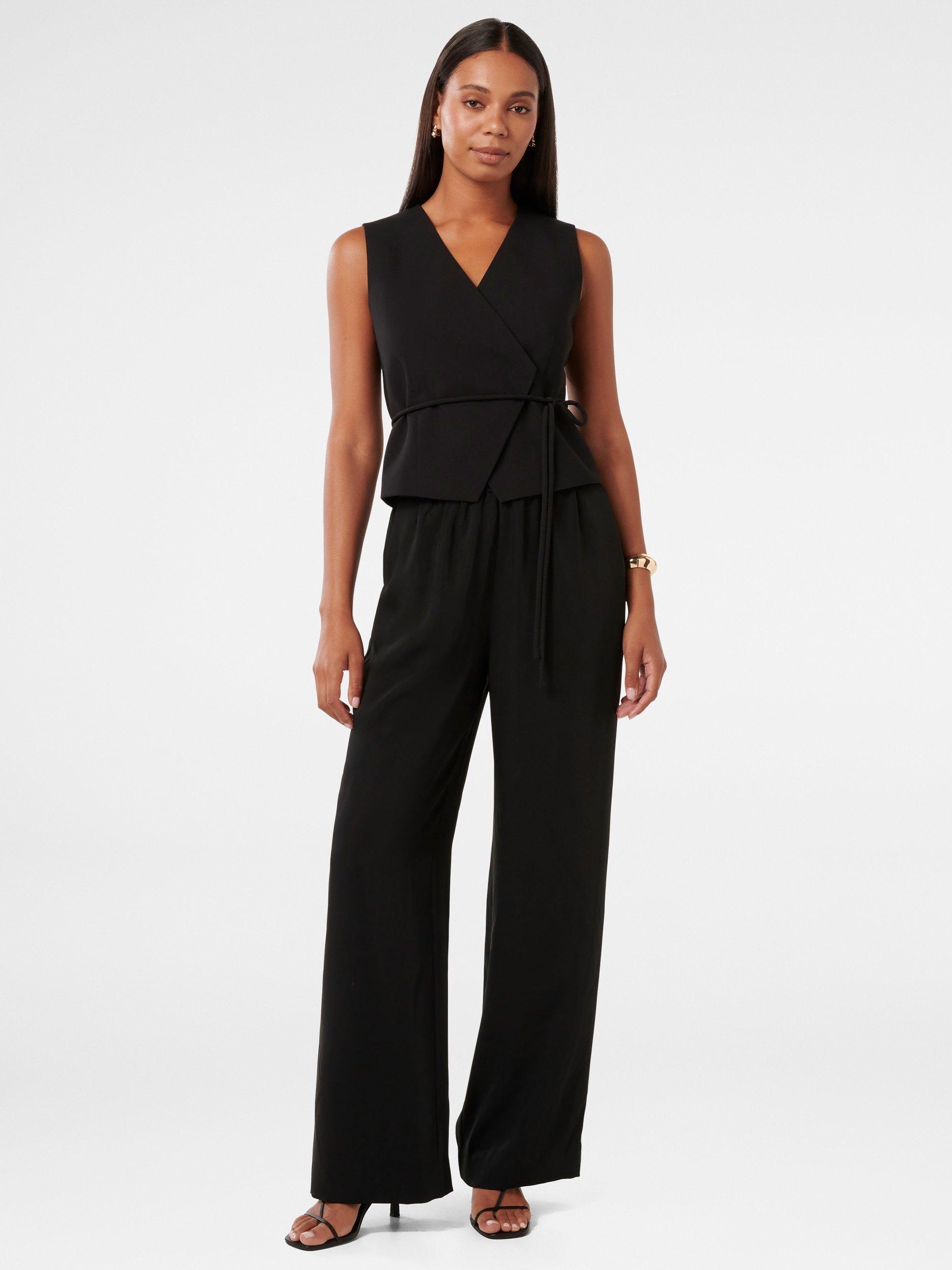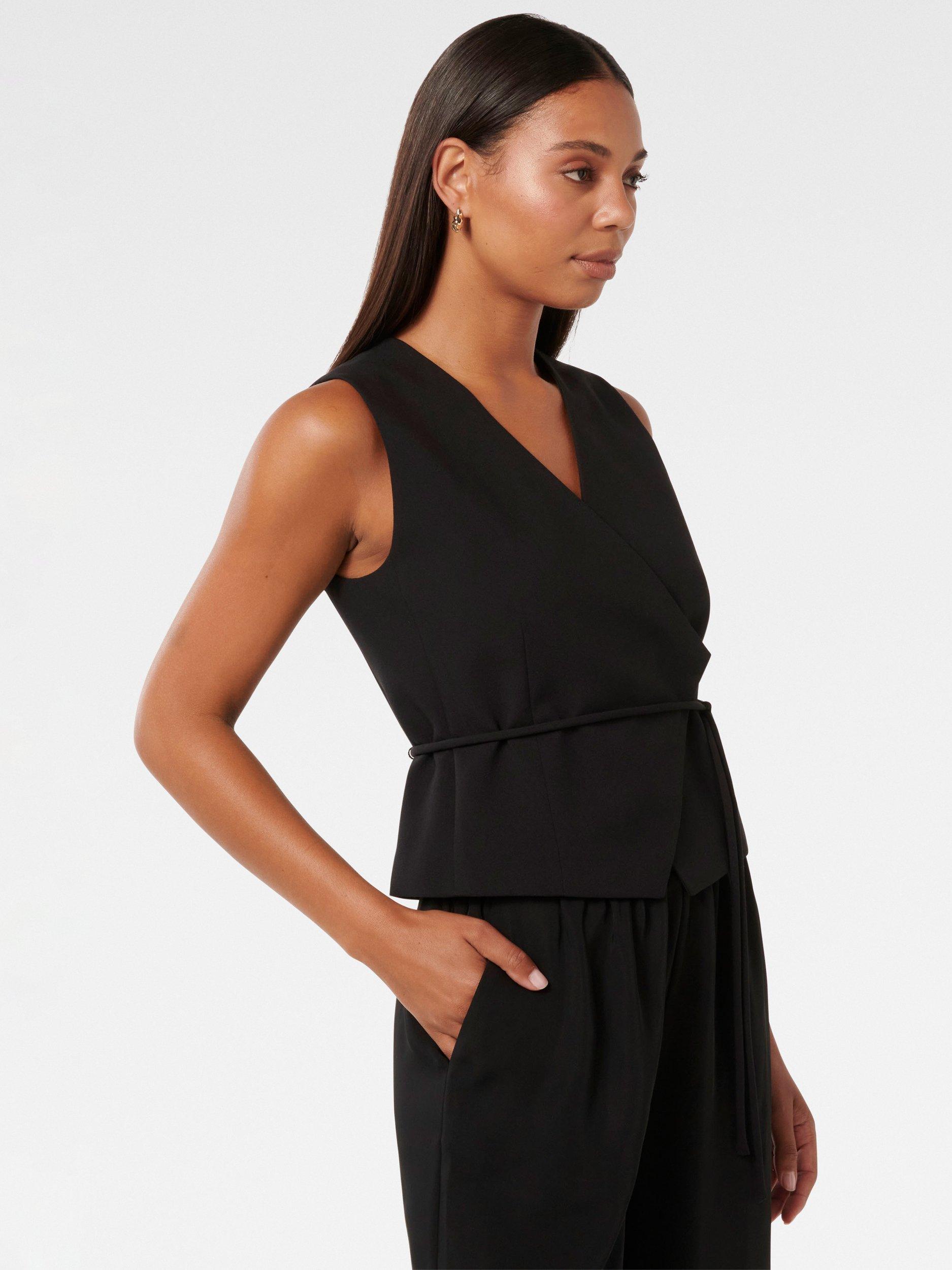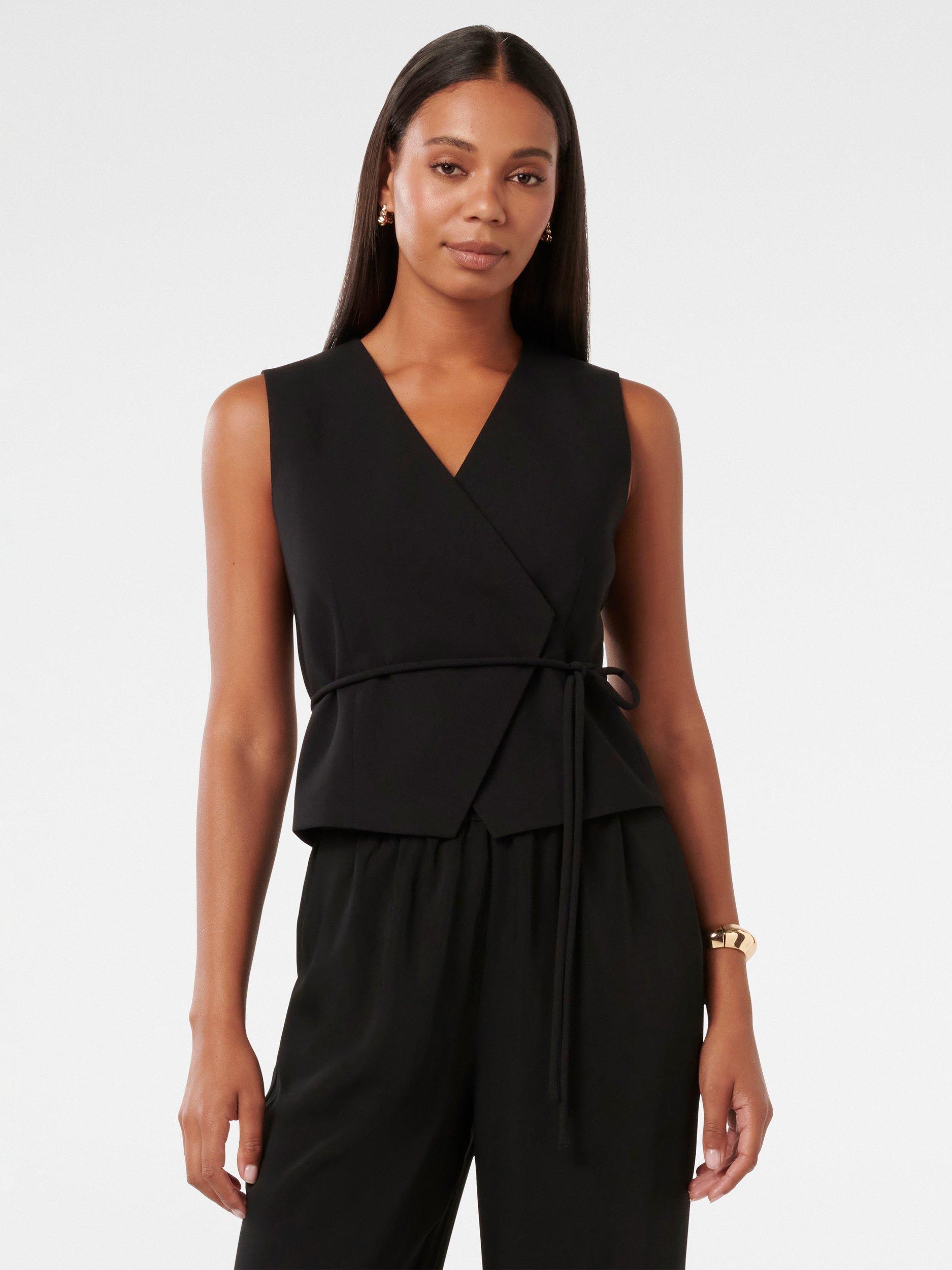 A smart waistcoat with an unusual, asymmetric cut and self-tie belt.