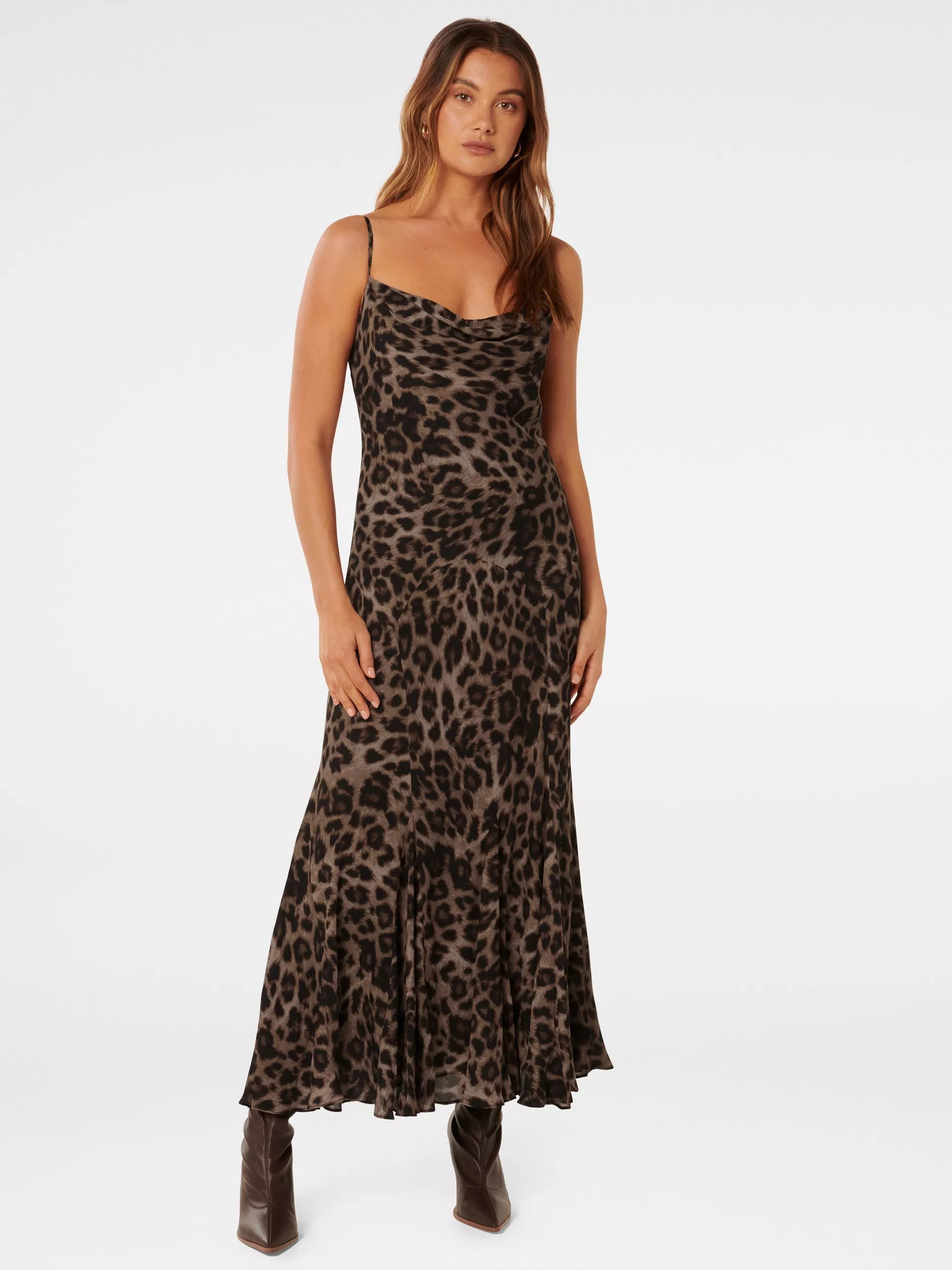 The definition of slip-on-and-go, this mid-length dress from Forever New is dreamt up from whisper-weight viscose. Effortlessly flattering thanks to a fuss-free v-neckline, this strappy style spotlights a bespoke leopard print.