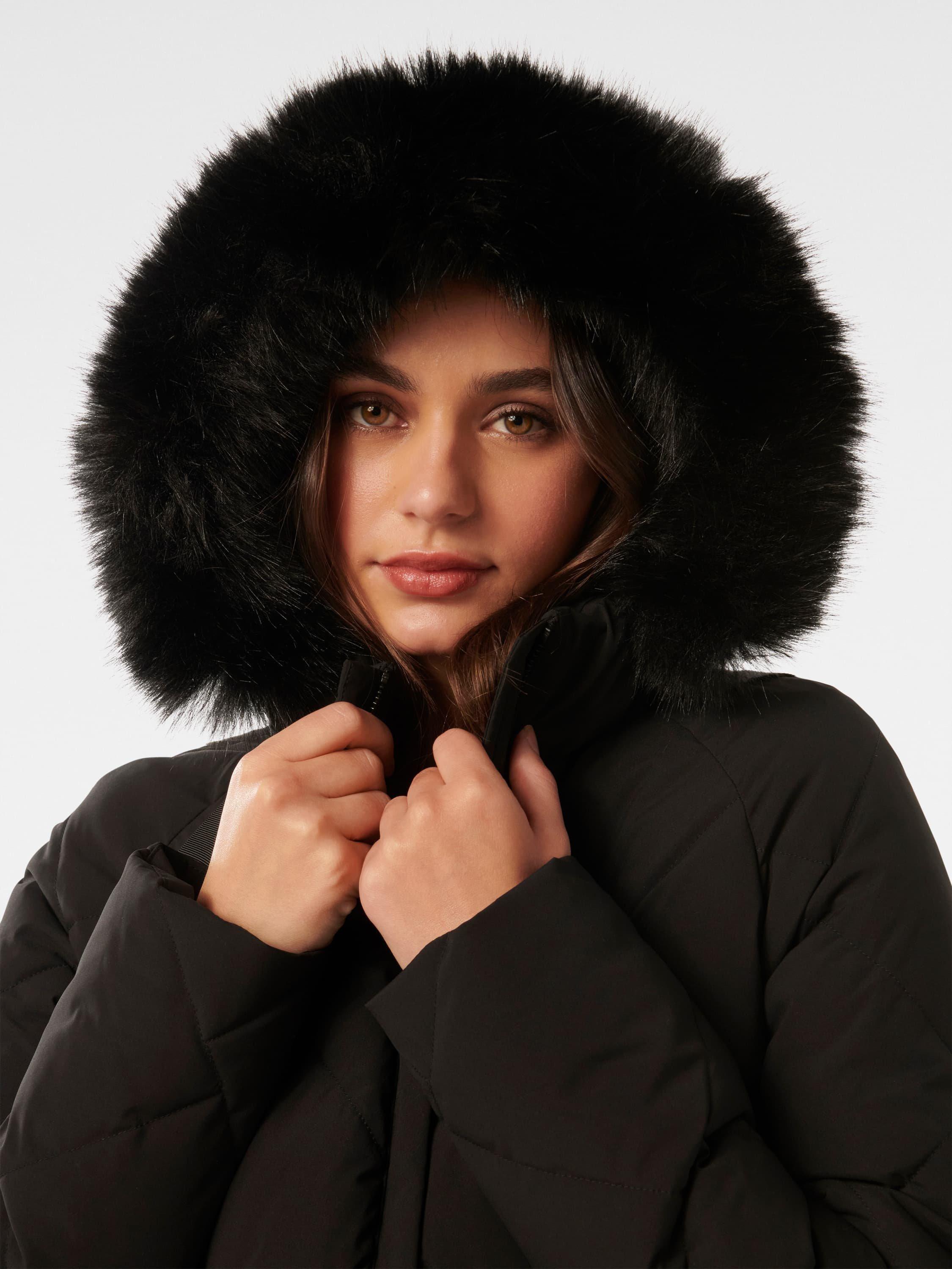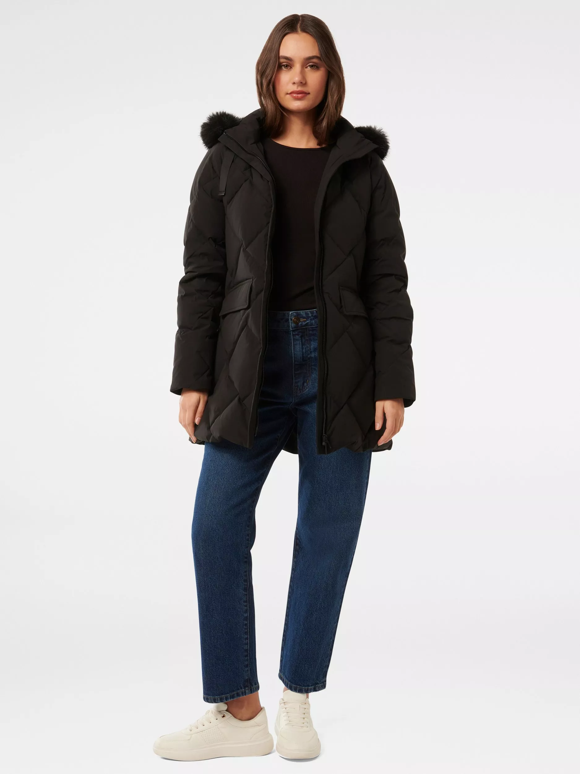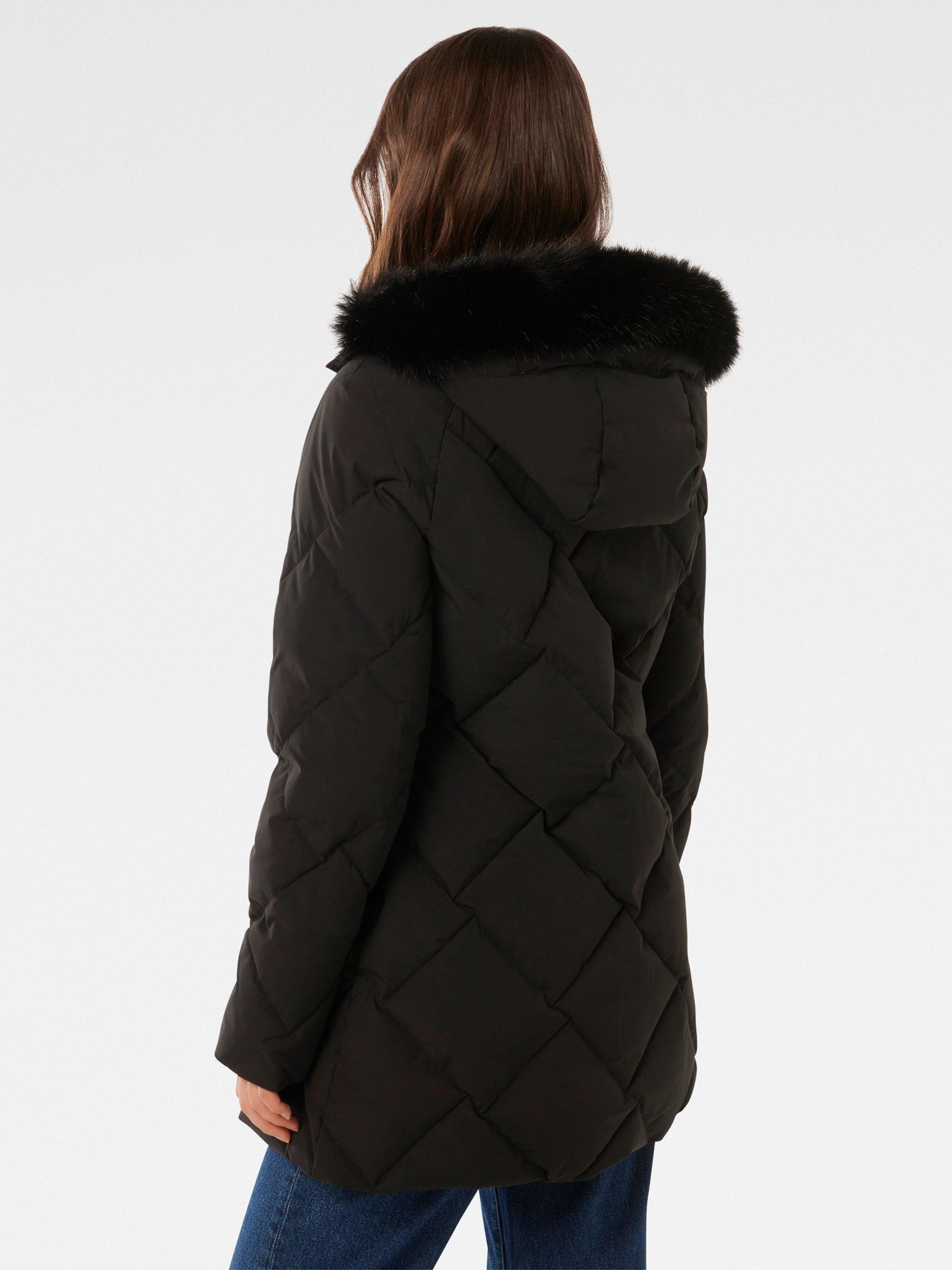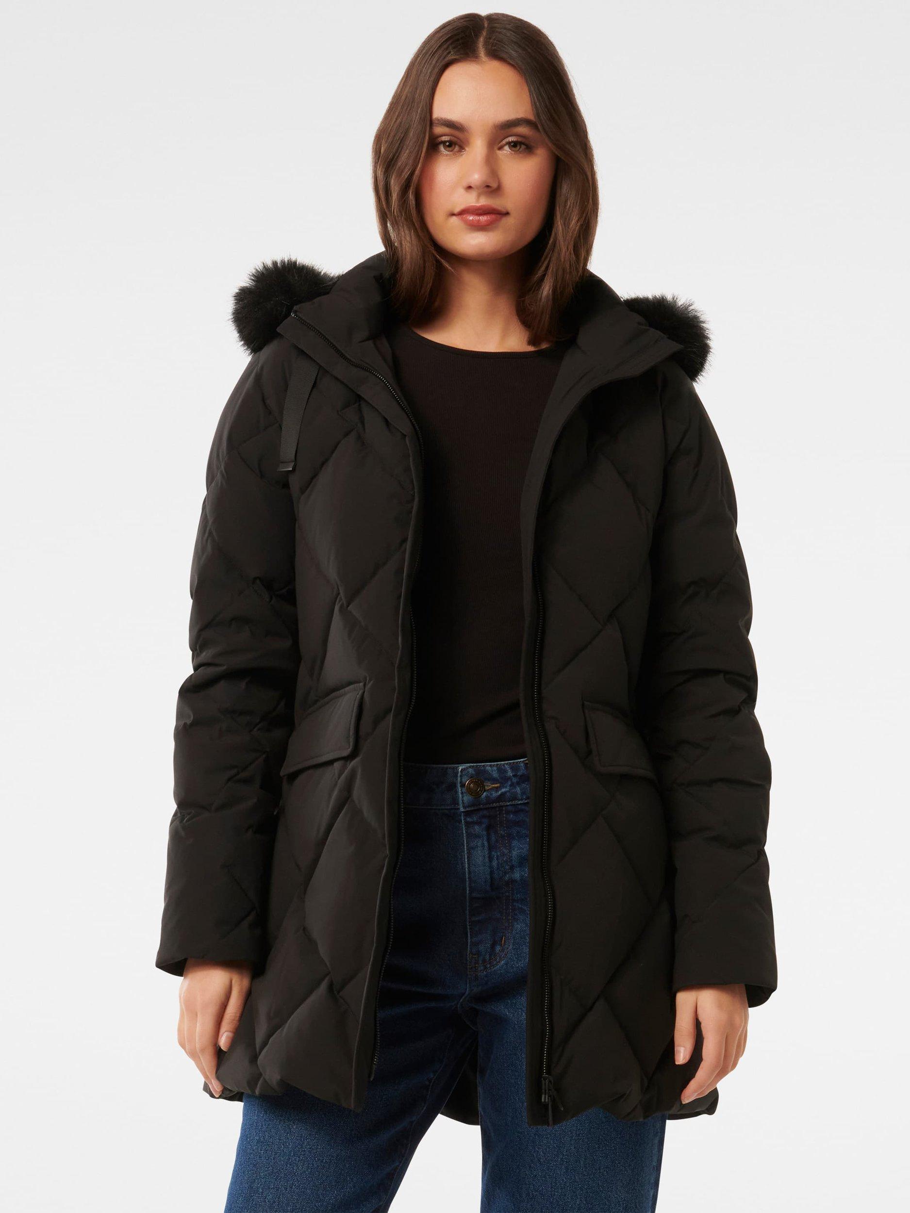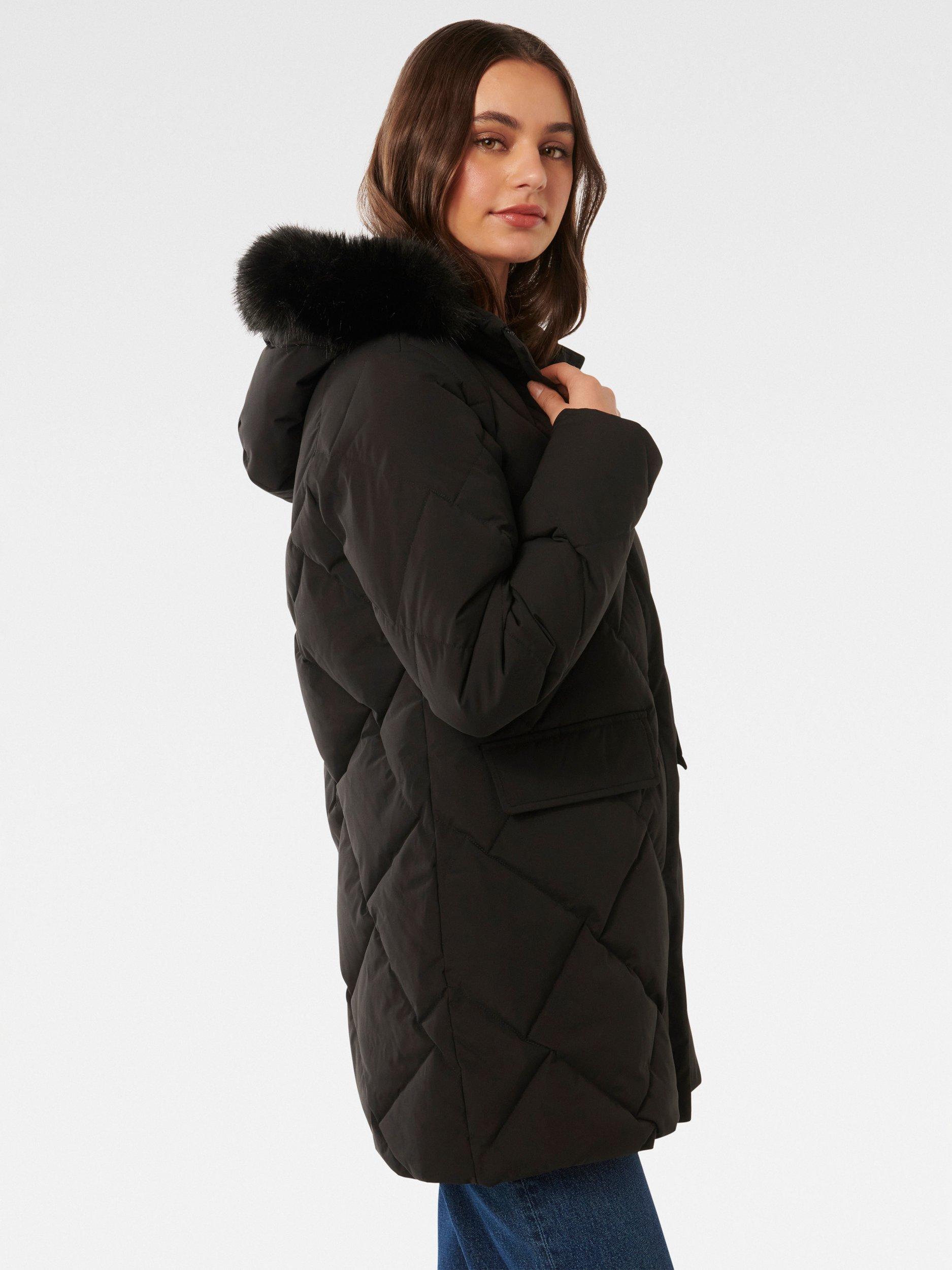 A wardrobe staple for winter weather, this puffer coat from Forever New features a built-in hood and is down-filled for additional warmth.