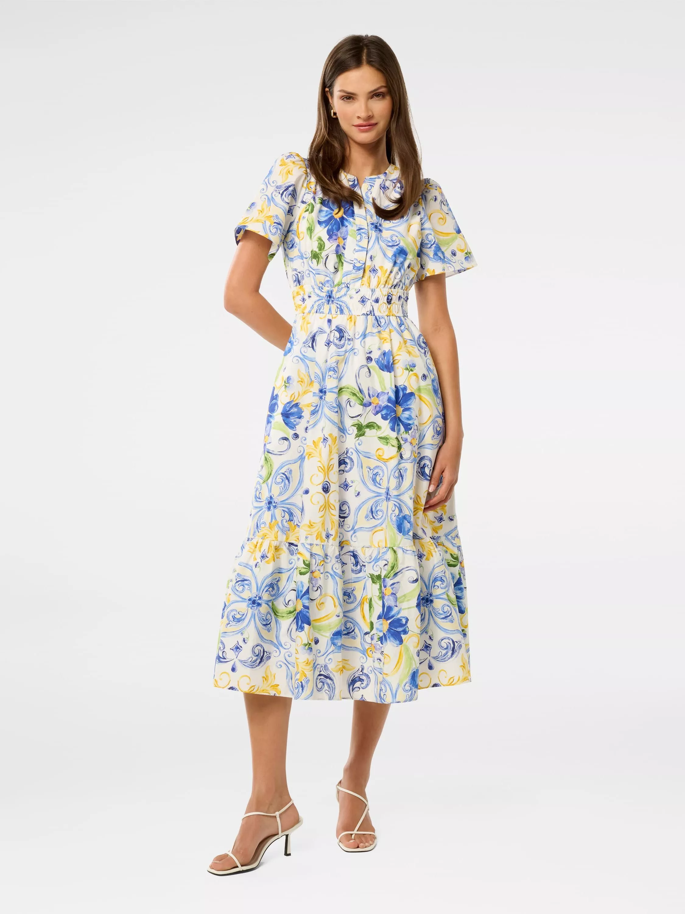 Forever New experiments with proportions through its Eleanor dress, a midi silhouette that combines a voluminous skirt and sleeves with a waist-cinching bodice. This piece also boasts a statement-worthy quality thanks to its nature-inspired print that rests on a base of soft cotton.