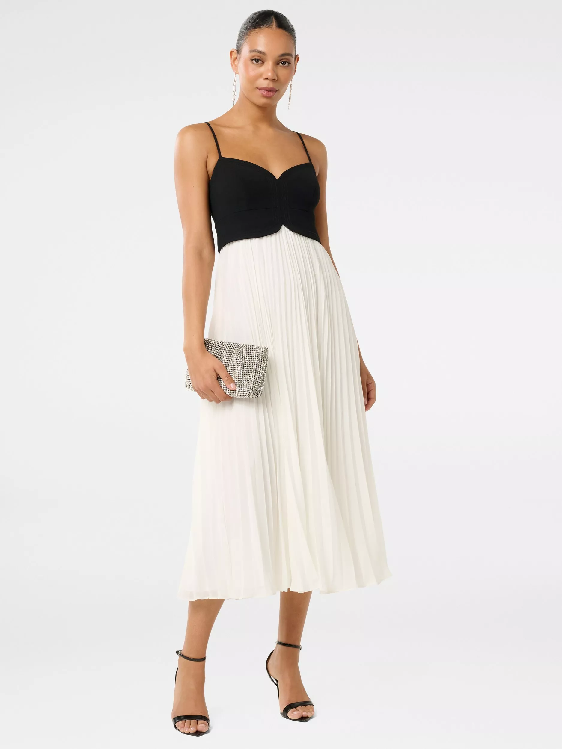 Demonstrating a penchant for pleats, this midi dress from Forever New features a charming sweetheart neckline bodice and a contrast skirt.