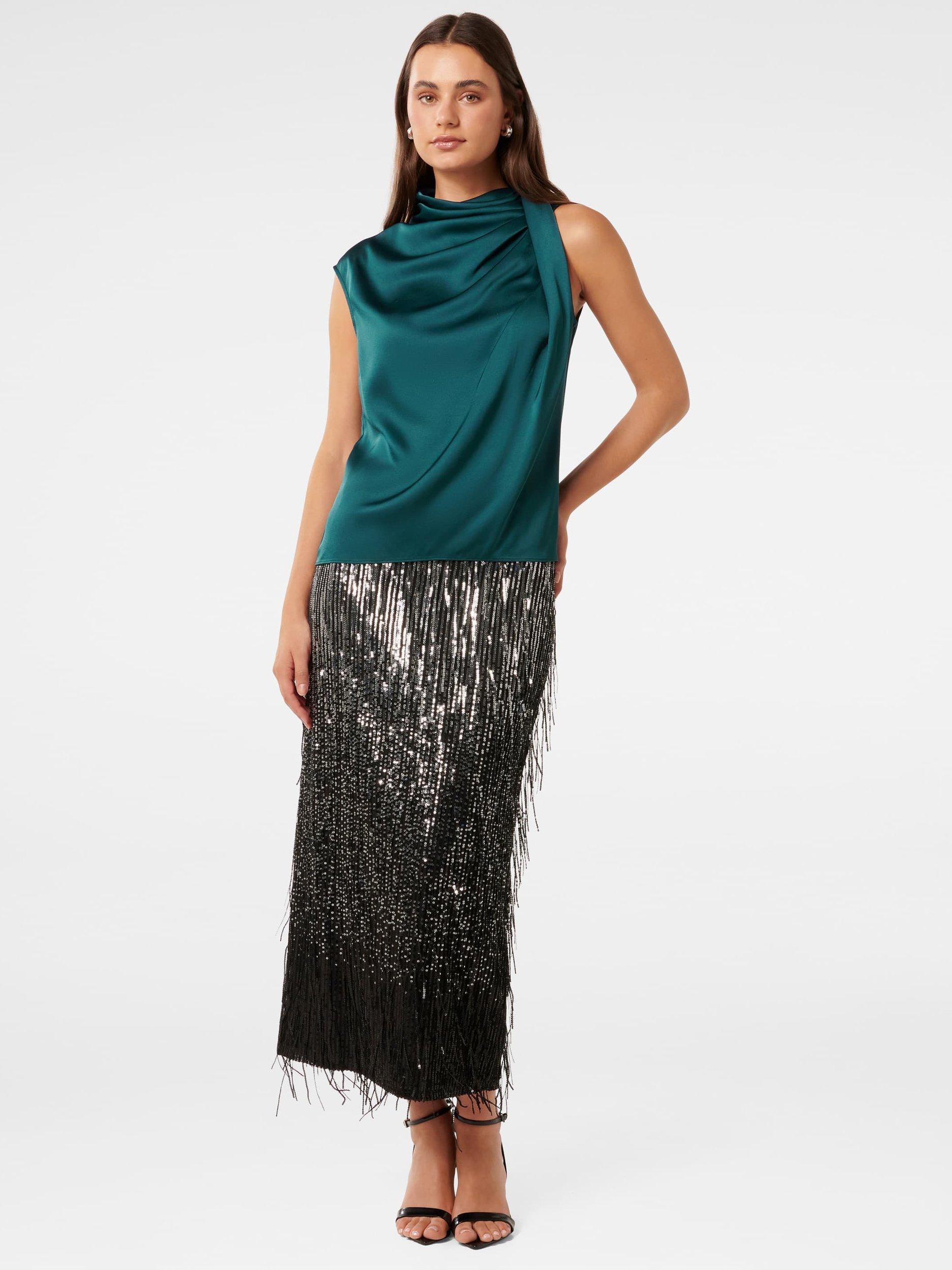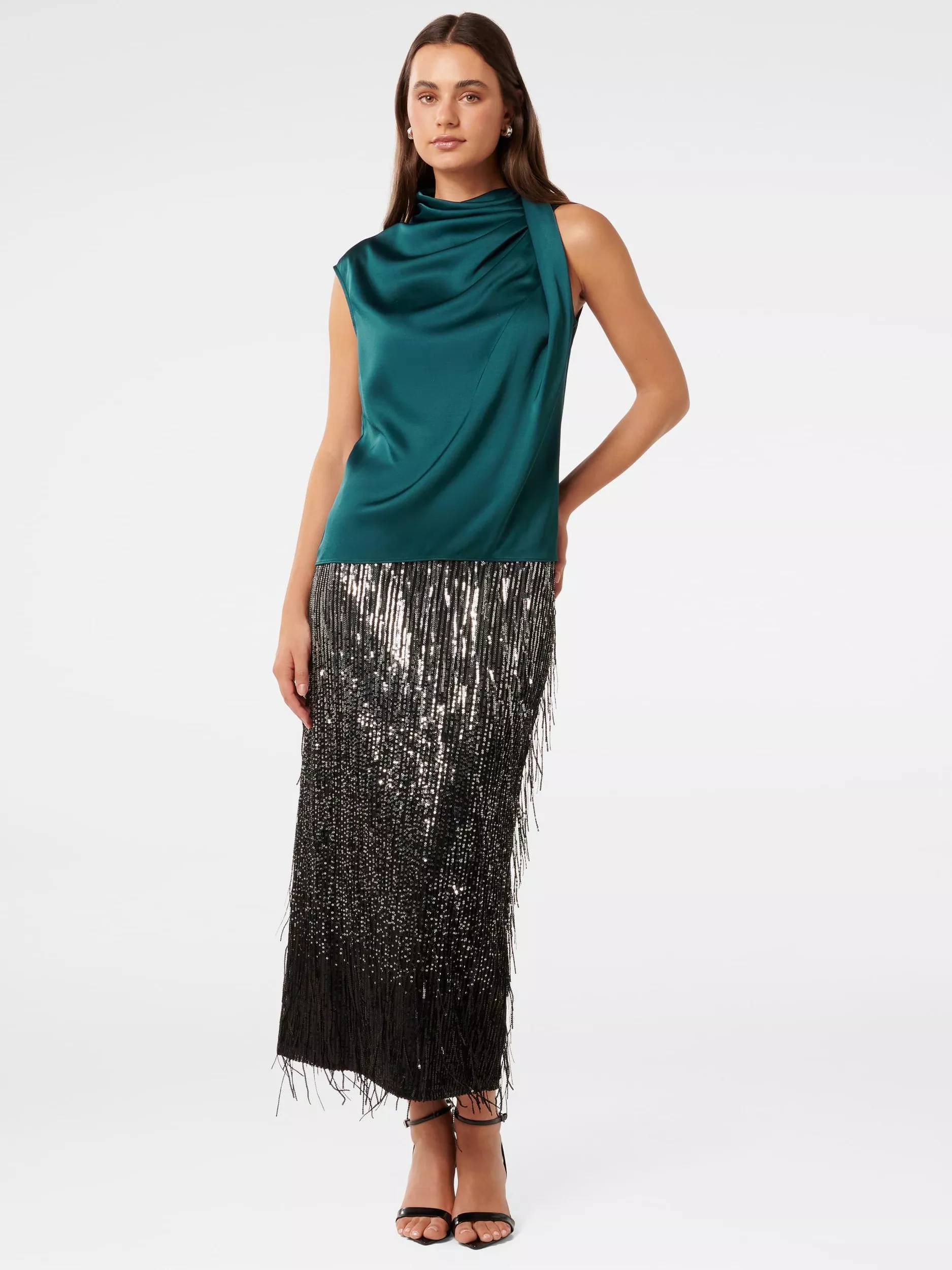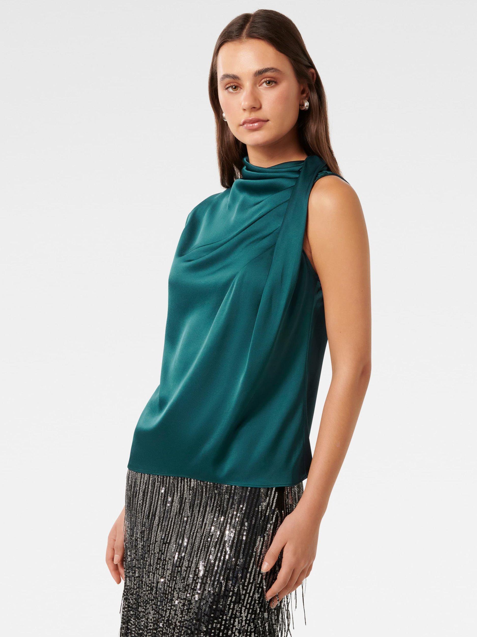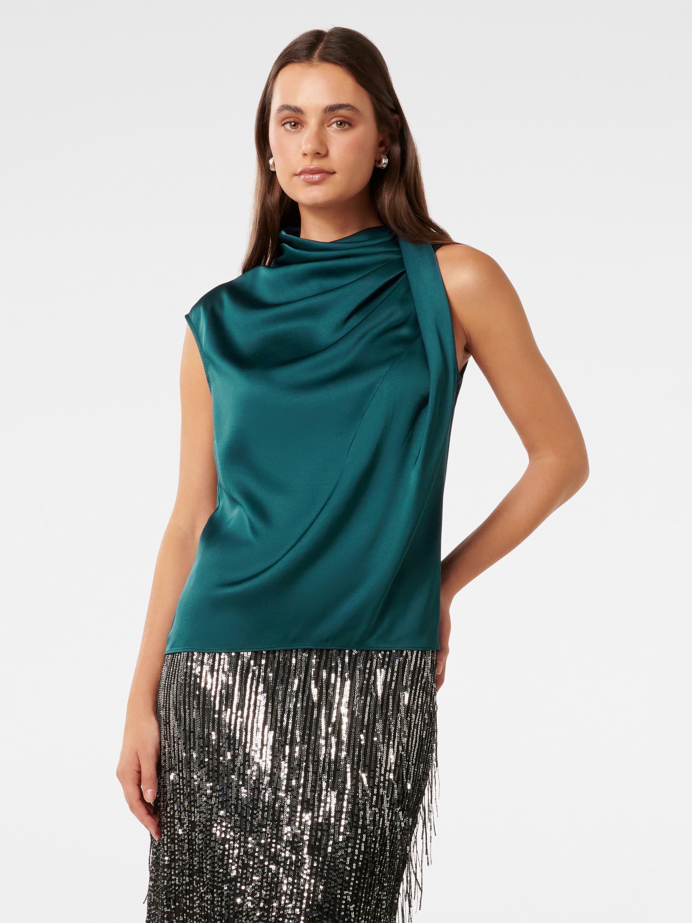 This drapey blouse from Forever New features a high cowl neckline and is made in satin.