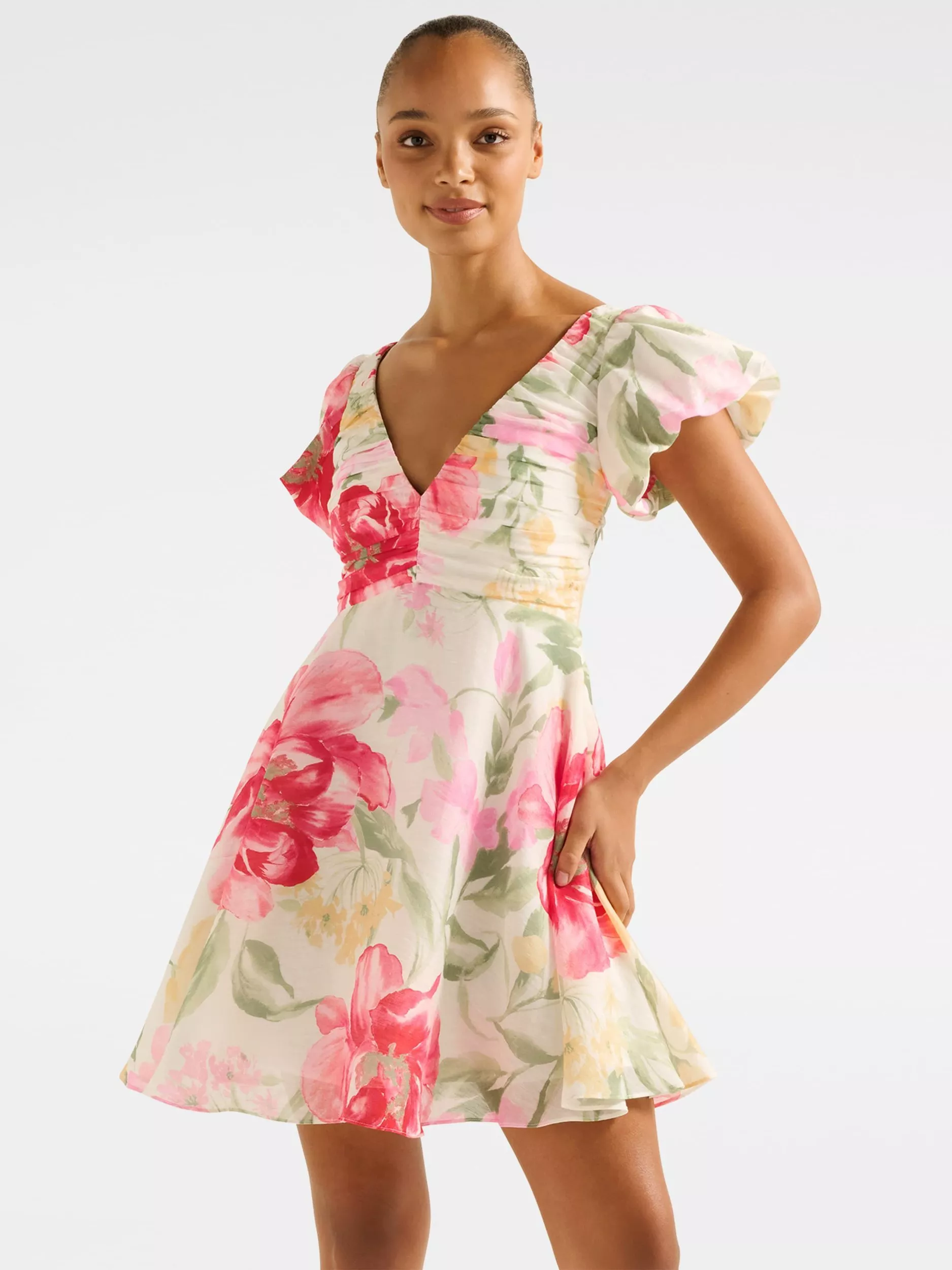 In a drama-filled flared style, this mini dress from Forever New is created a lightweight fabric for a breezy fit and feel. With a v-neckline, ruched bodice and puffy cap sleeves, it's printed with refreshing florals.