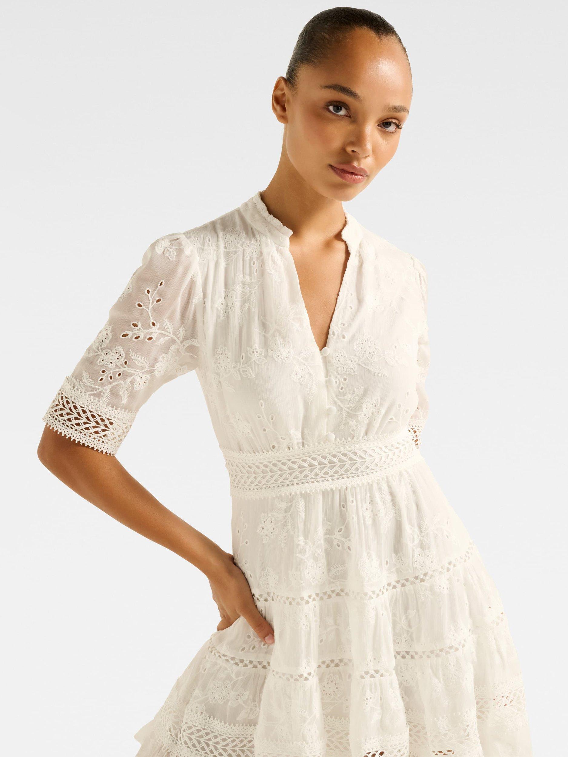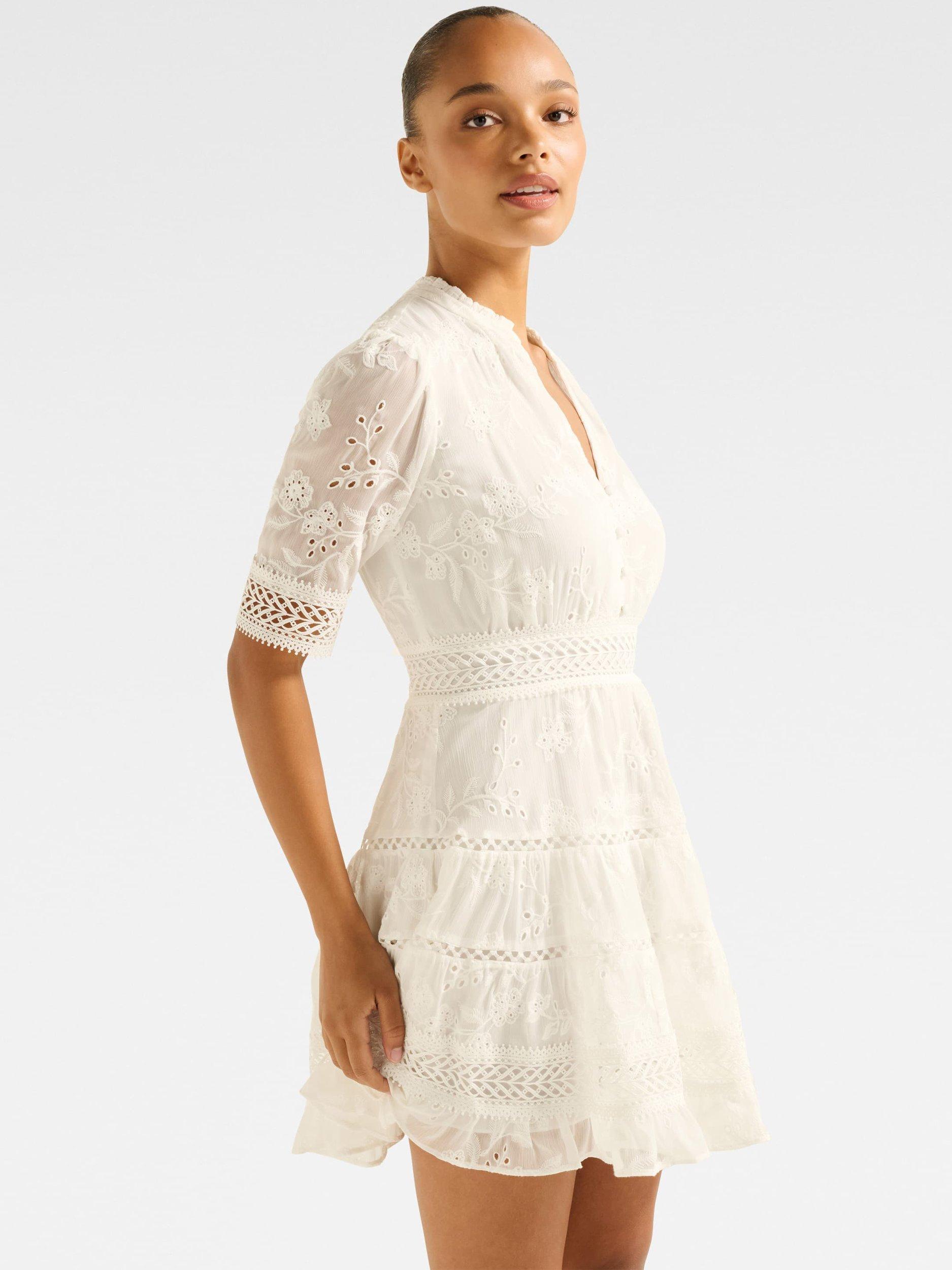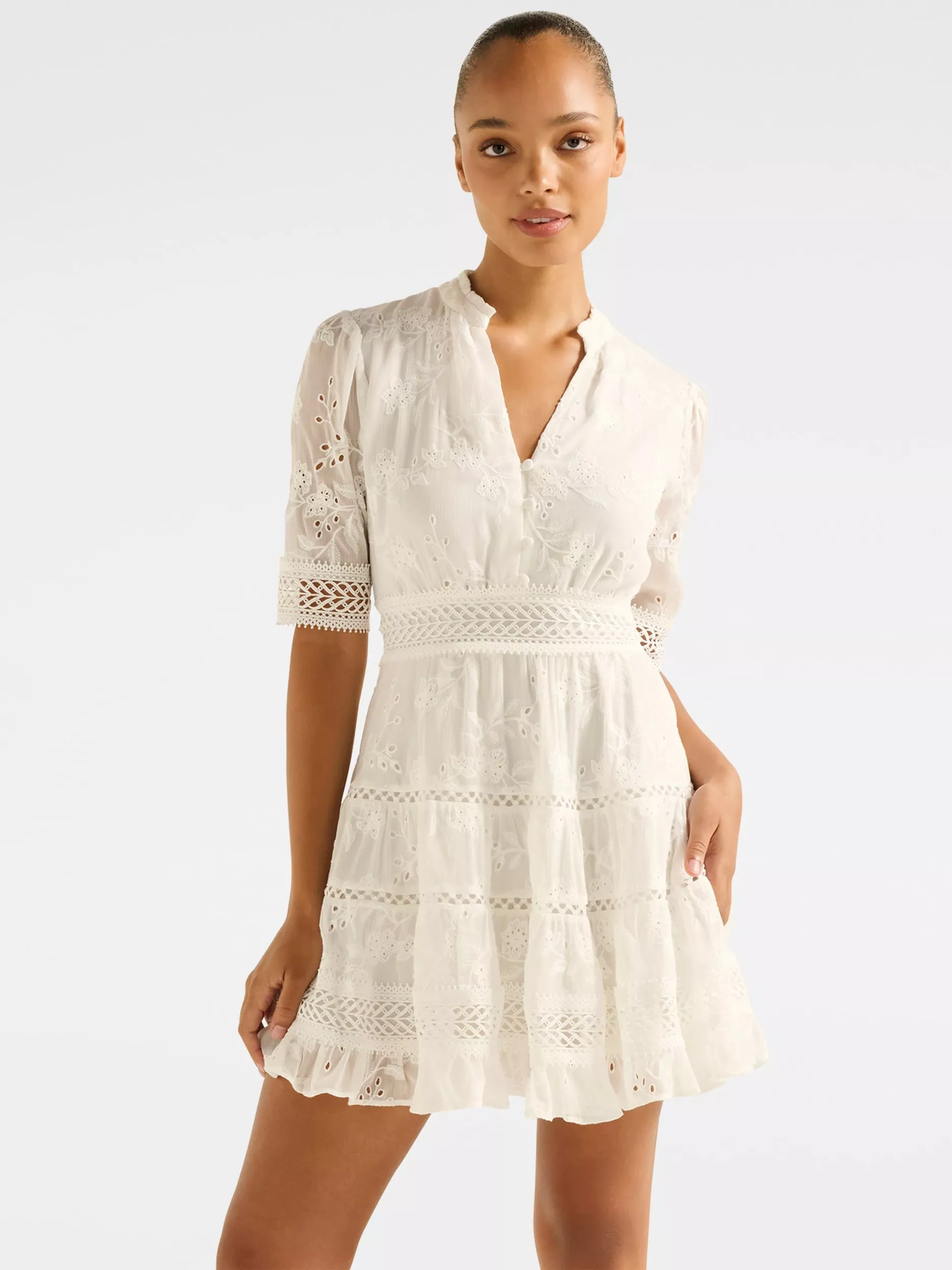A perennial favourite with its skater shape, this mini dress from Forever New is made from a soft fabric with intricate broderie anglaise. With a v-neckline and fitted short sleeves, this dress is an elevated summer style.