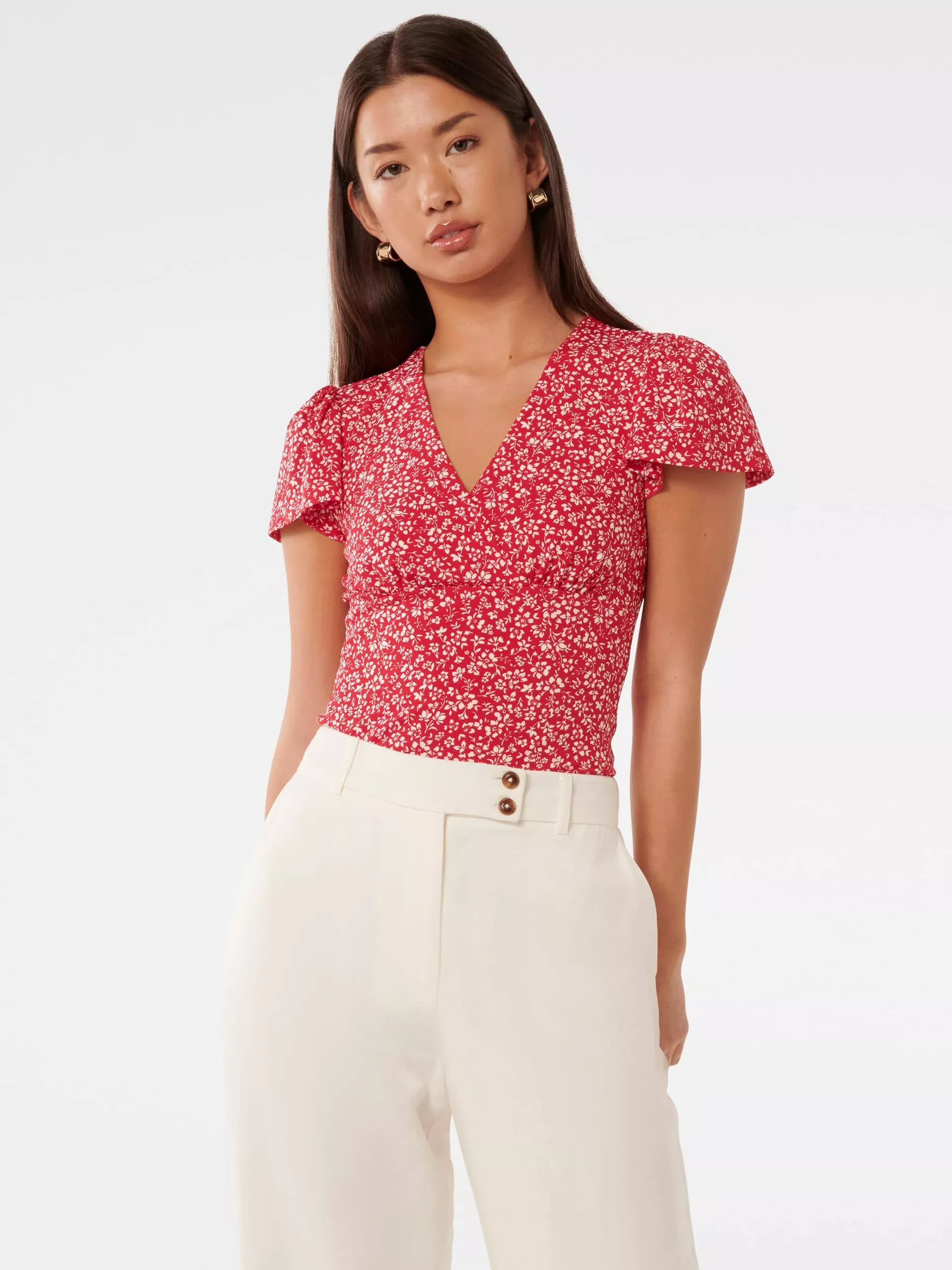 Fitted in silhouette, this floral printed top by Forever New features a flattering v-neckline and short flutter sleeves.