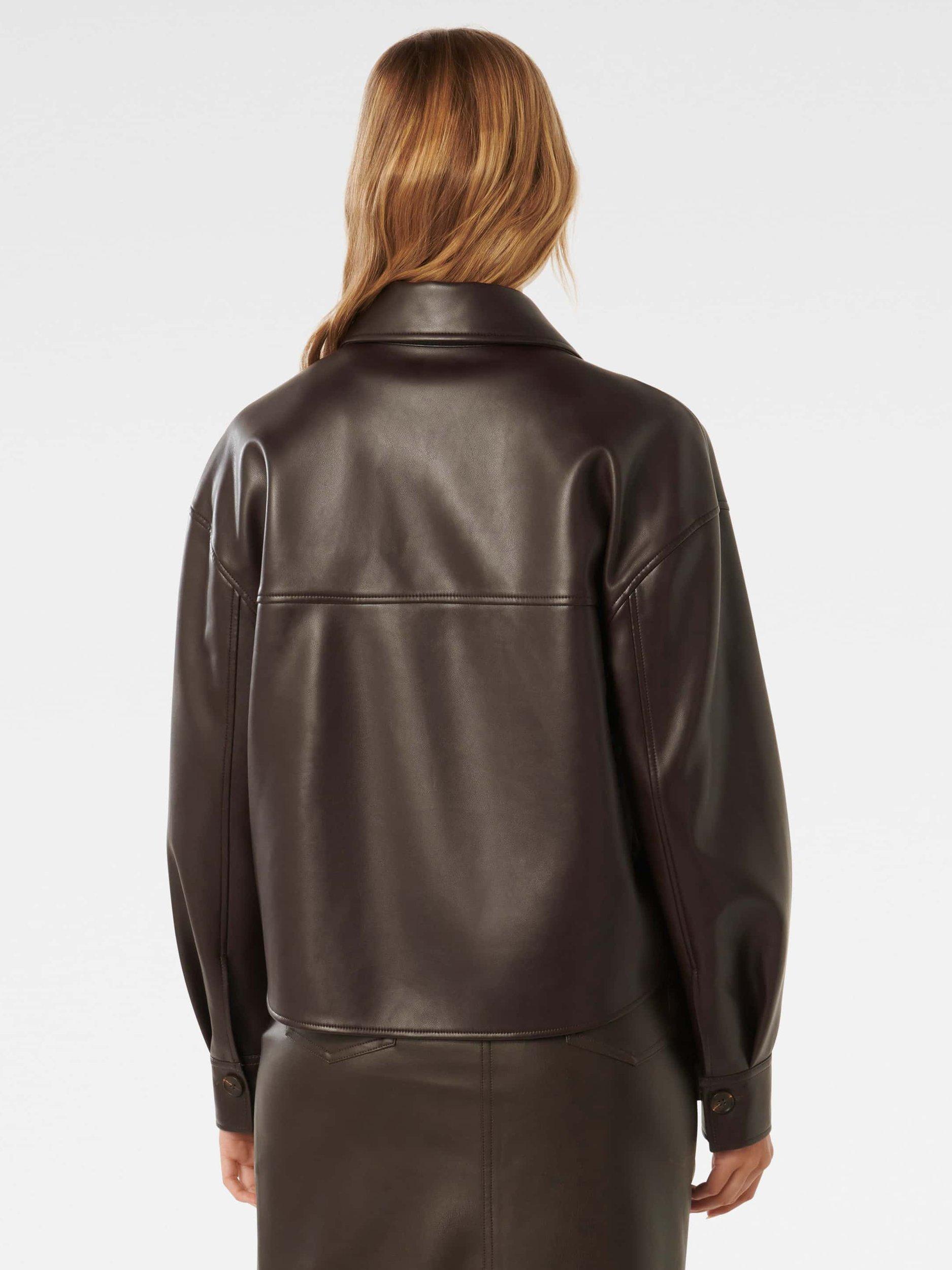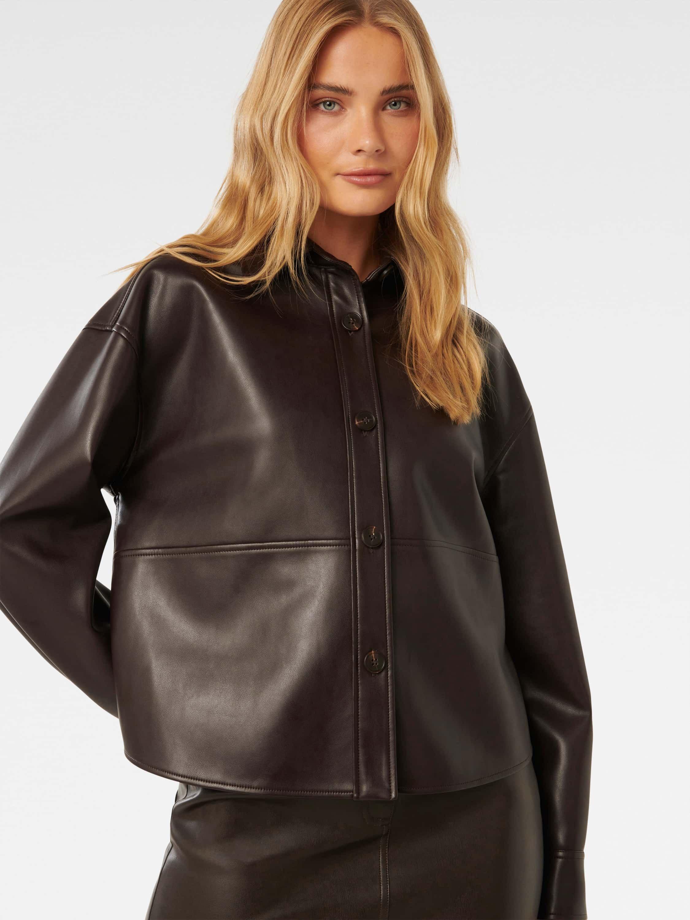 With a neat collar neckline, it is fashioned from smooth faux leather.