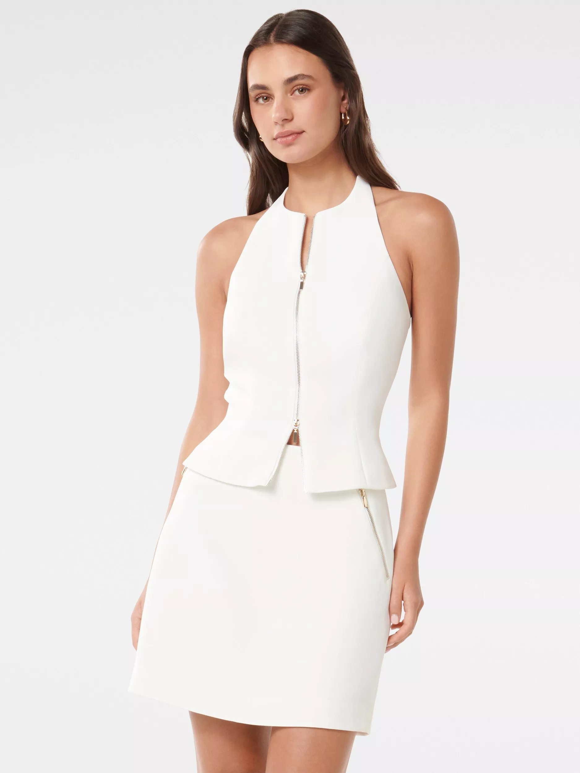 In a fitted hourglass shape with a v-split hem, this halter neck blouse from Forever New features a zip through the front.