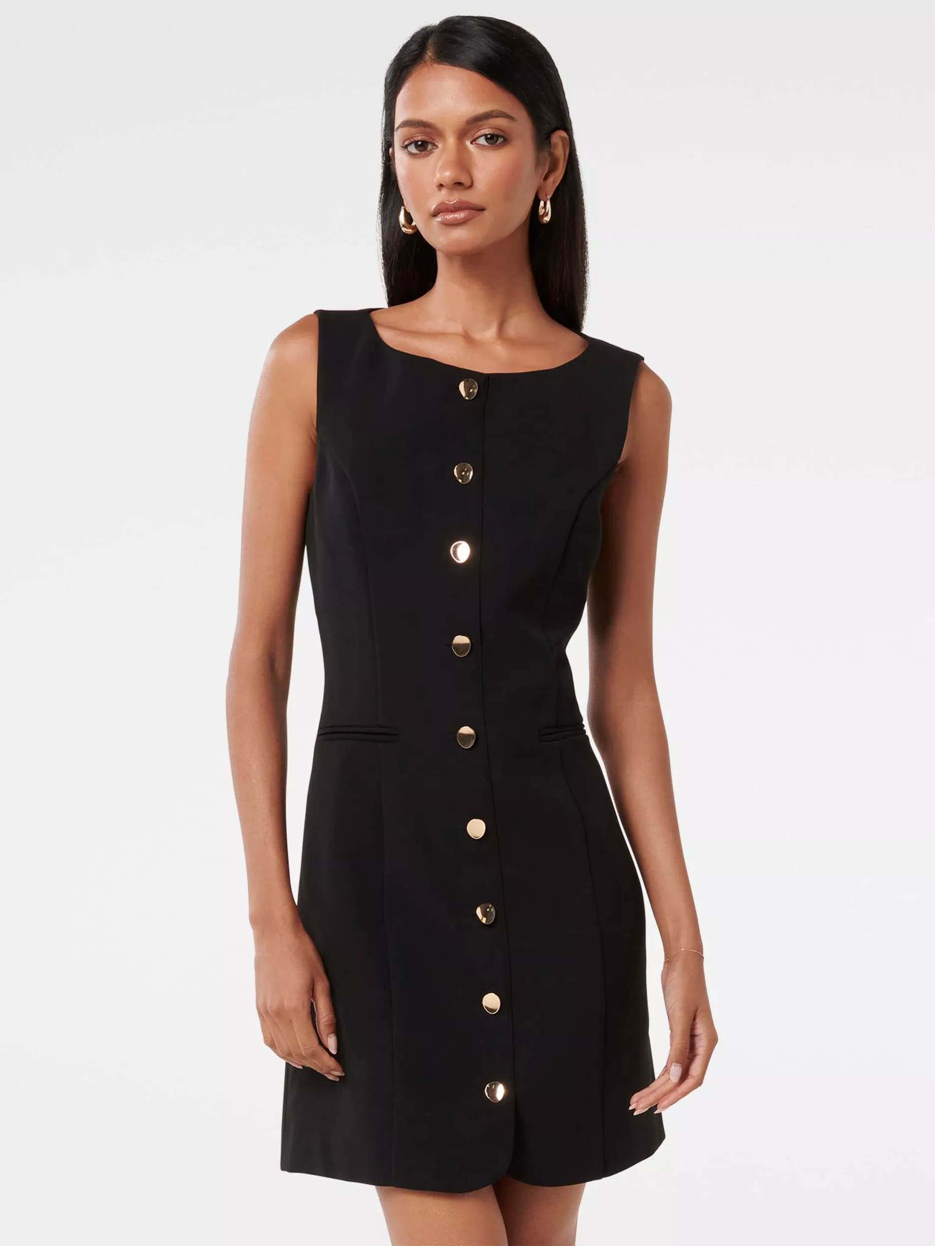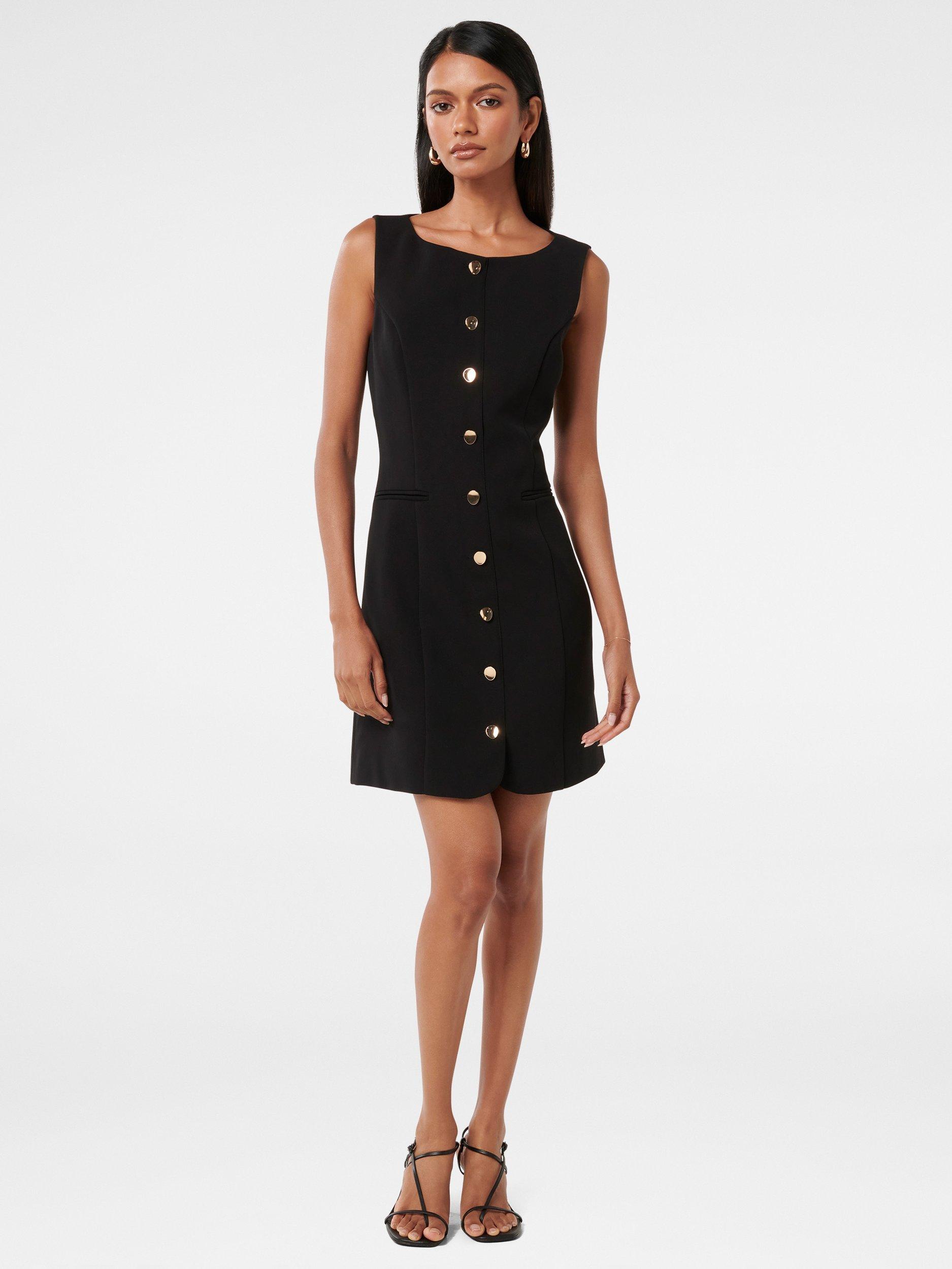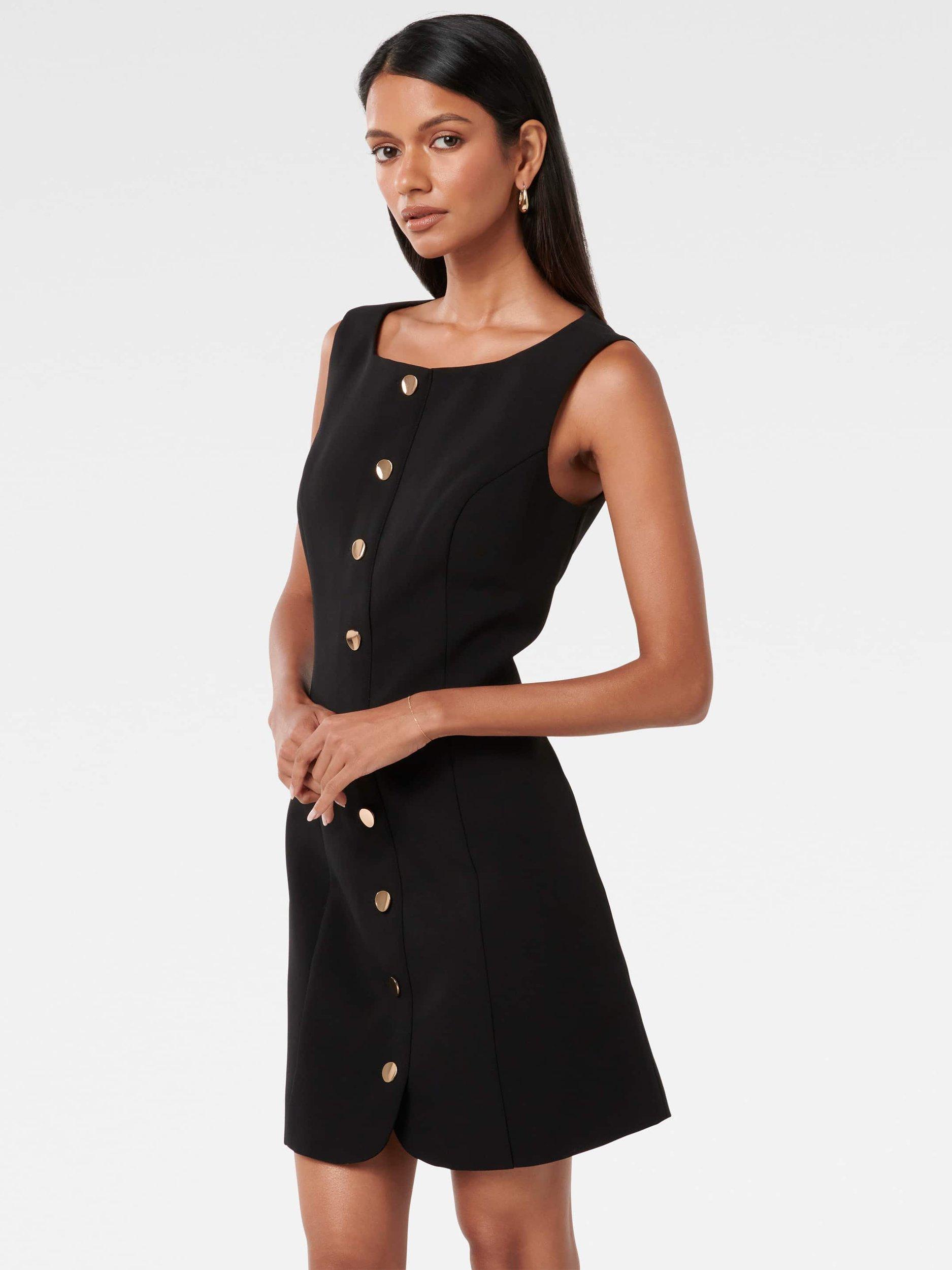 In a flattering fit that accentuates the waist, this petite mini dress from Forever New is crafted from a blend of fabrics. Defined with a conventional round neckline and gold-toned buttons through the front, this sleeveless style is minimally detailed for endless wearability.